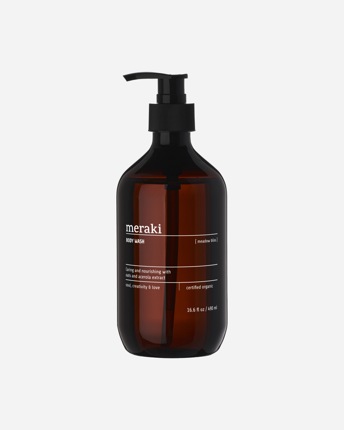 Denne Meadow Bliss kroppsvasken fra Meraki renser og skjemmer bort huden din uten å tørke den ut. Et organisk havreekstrakt nærer huden og har en beroligende effekt, mens glyserin og organisk aloe vera holder på fuktigheten. Huden din drar også nytte av fuktighetsgivende og nærende acerolaberries, som er rike på karbohydrater og antioksidant vitamin C. Body washen har en duft av bitter sitrus, tre, verbena og te. Sertifisert økologisk fra Ecocert Cosmos. Pump ut en passende mengde såpe og skum kroppen inn. Skyll grundig med vann. Passer til daglig bruk og for alle hudtyper.