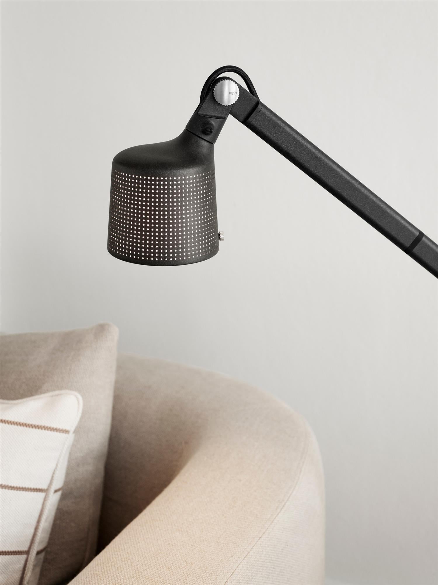 Vipp gulvleselampe er en leselampe for stuen. Utstyrt med detaljer som en justerbar arm for fokusert belysning, har gulvleselampen også en perforert skjerm og matt glass for en behagelig lysspredning.