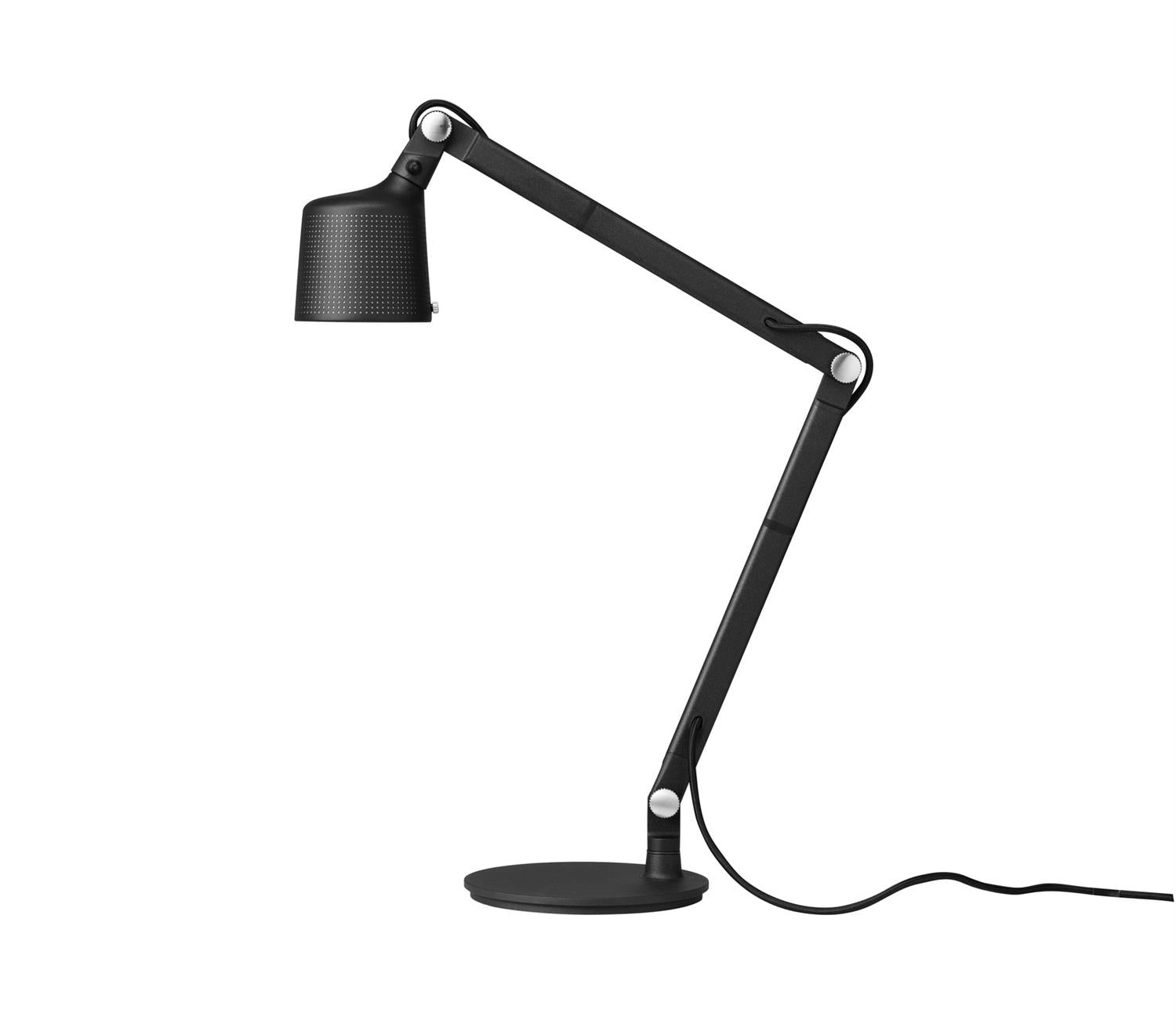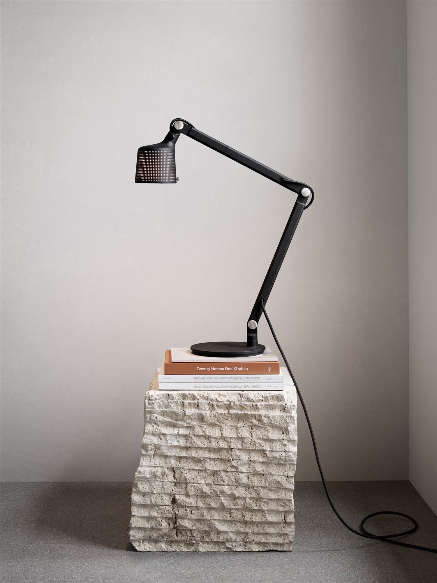 Vipp-skrivebordslampen er en arbeidslampe for kontoret eller hjemmet. Den er utstyrt med en justerbar arm, fingerskruer og en solid base for stabilitet. Skrivebordslampen har en perforert skjerm og matt glass for en behagelig lysspredning.