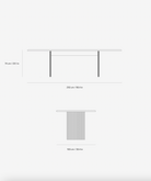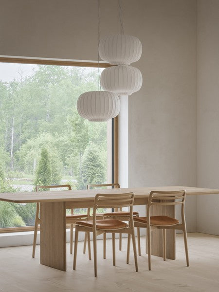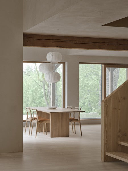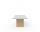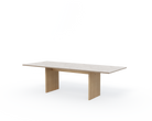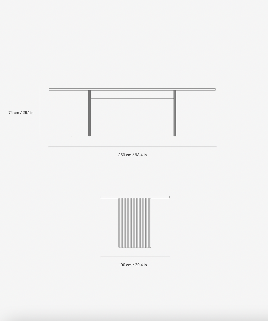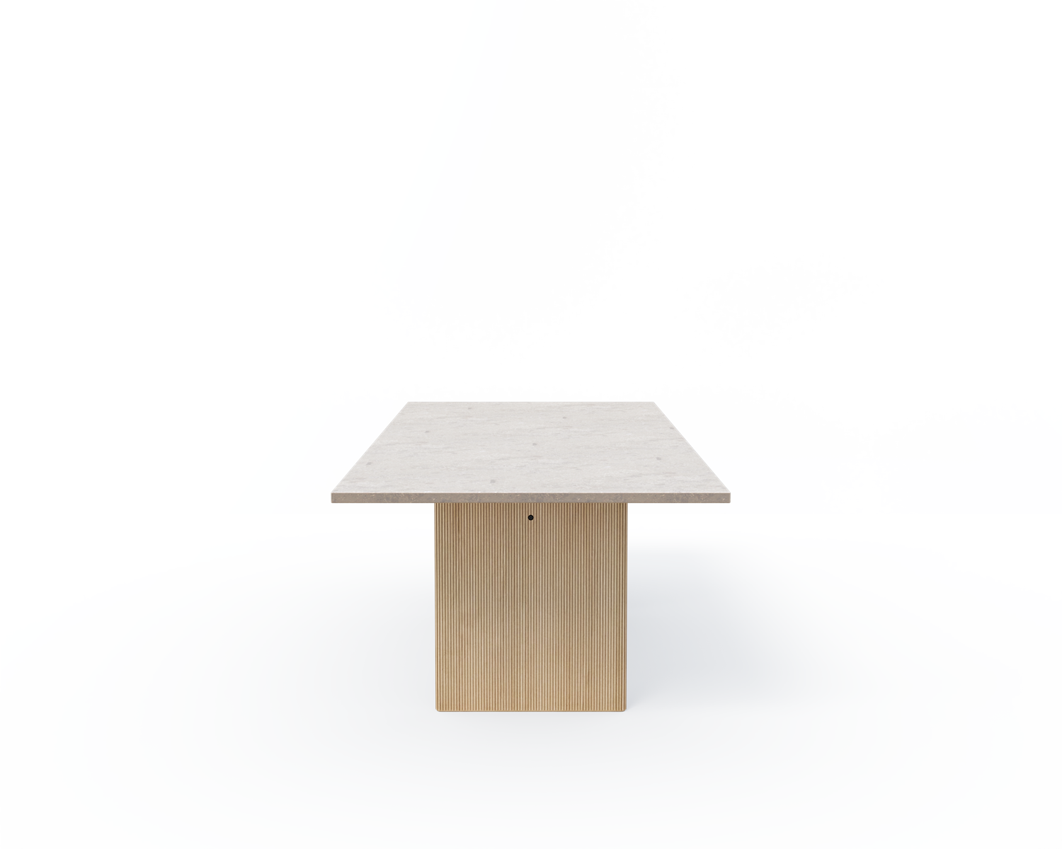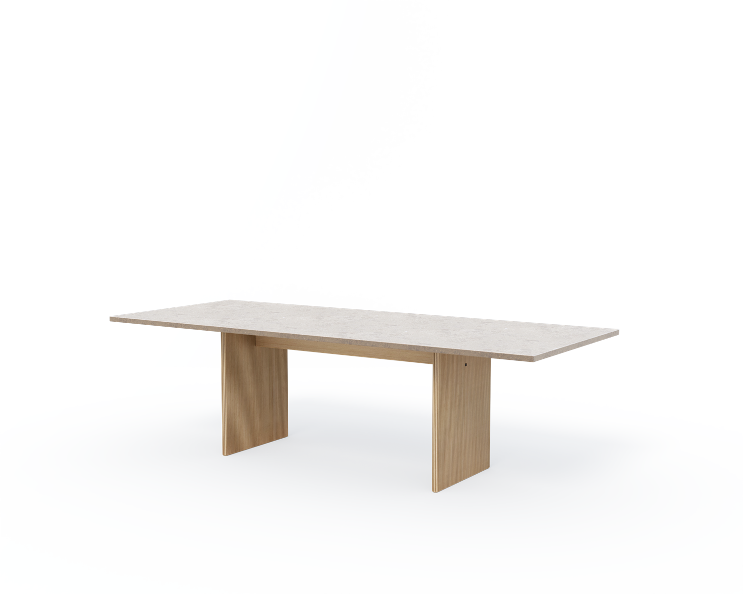 Det firkantede Cabin-bordet for åtte personer er tilgjengelig med to typer naturstein: Pietra Grey-marmor og Jura Grau Blau-kalkstein. Det visuelle uttrykket til begge steintypene forteller historien om millioner av år med naturlig bearbeiding. Årer, fossiler og fargenyanser er et resultat av spesielle geologiske forhold og garanterer at ingen steiner er identiske. Den tunge toppen støttes av to parallelle ben i enten mørk eller lys massiv eik, utskåret med vertikale riller.