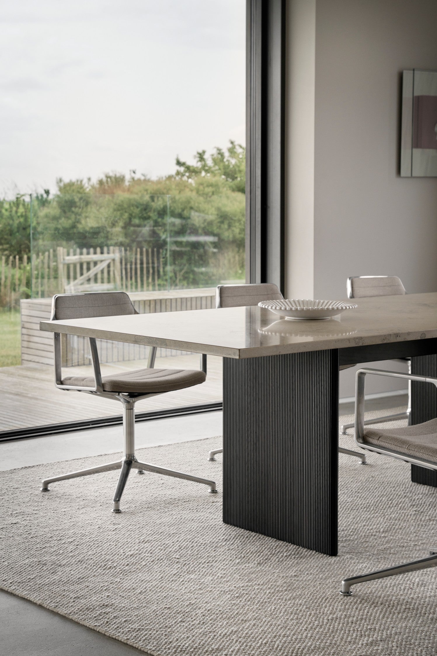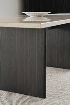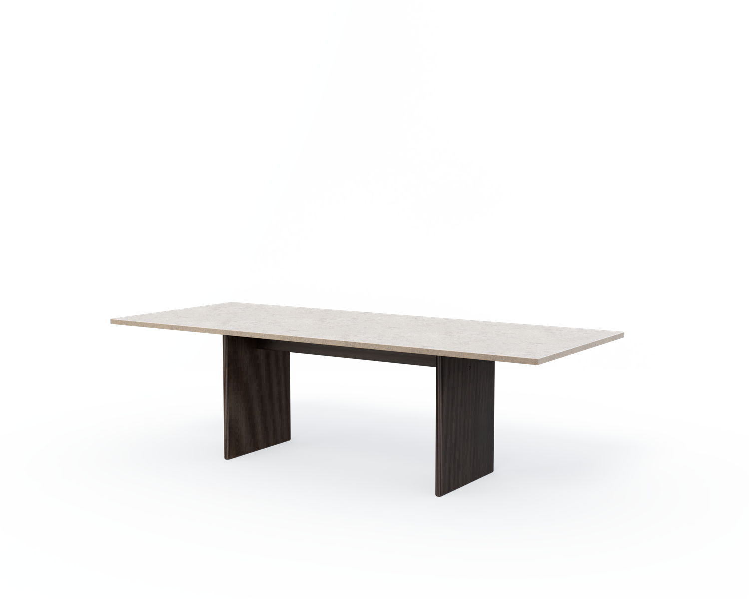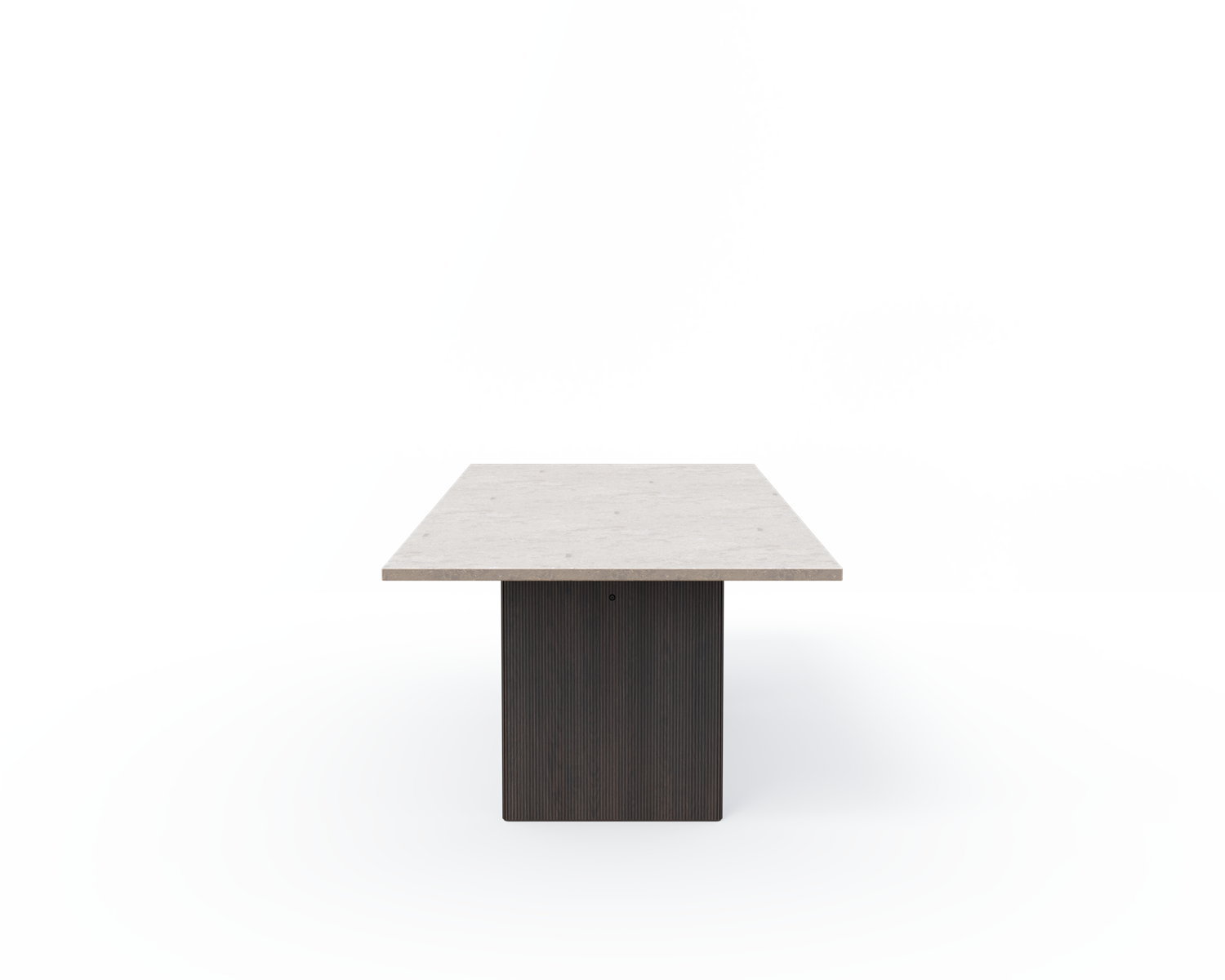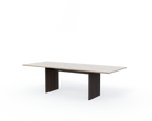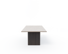 Det firkantede Cabin-bordet for åtte personer er tilgjengelig med to typer naturstein: Pietra Grey-marmor og Jura Grau Blau-kalkstein. Det visuelle uttrykket til begge steintypene forteller historien om millioner av år med naturlig bearbeiding. Årer, fossiler og fargenyanser er et resultat av spesielle geologiske forhold og garanterer at ingen steiner er identiske. Den tunge toppen støttes av to parallelle ben i enten mørk eller lys massiv eik, utskåret med vertikale riller.