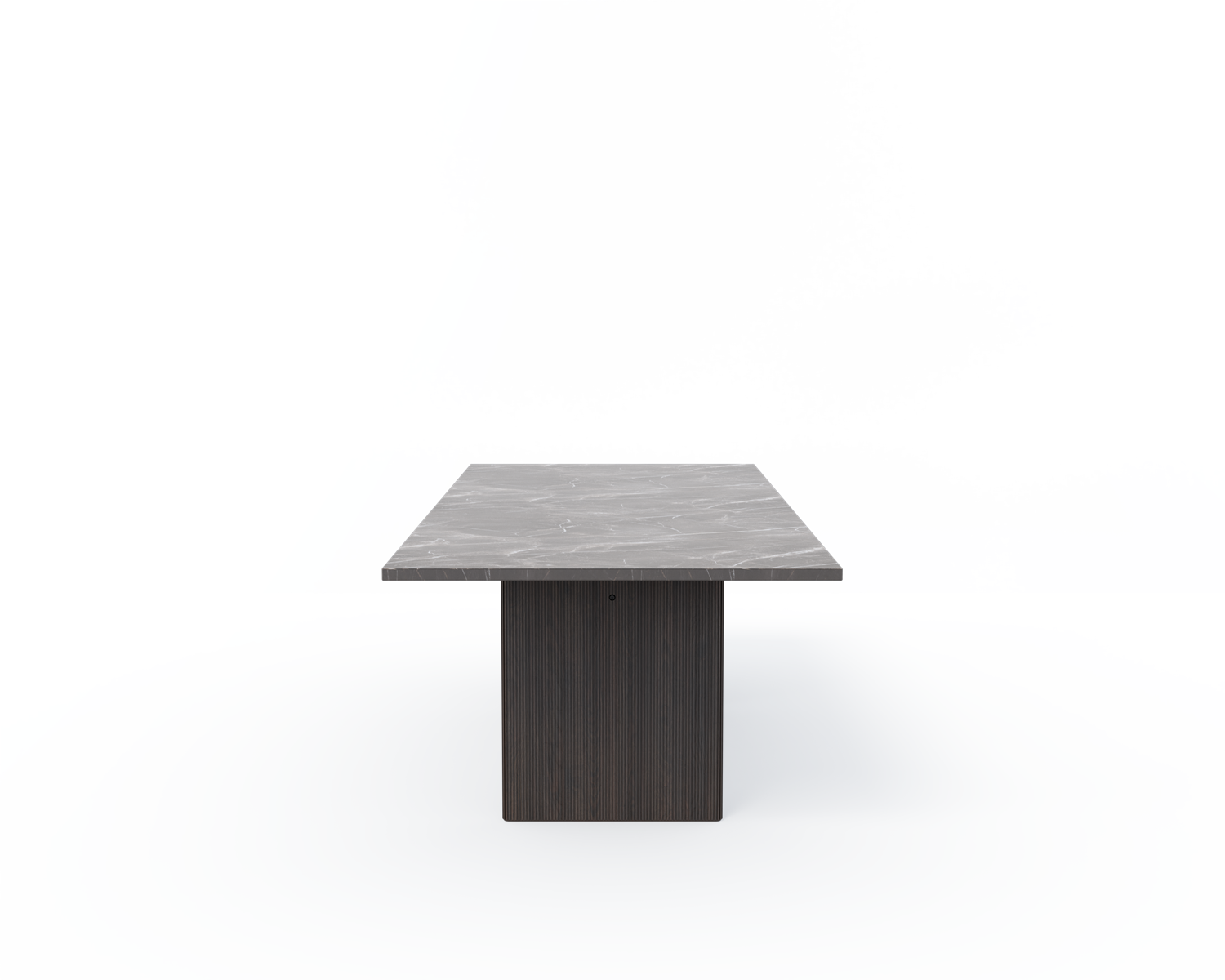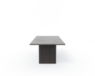 Det firkantede Cabin-bordet for åtte personer er tilgjengelig med to typer naturstein: Pietra Grey-marmor og Jura Grau Blau-kalkstein. Det visuelle uttrykket til begge steintypene forteller historien om millioner av år med naturlig bearbeiding. Årer, fossiler og fargenyanser er et resultat av spesielle geologiske forhold og garanterer at ingen steiner er identiske. Den tunge toppen støttes av to parallelle ben i enten mørk eller lys massiv eik, utskåret med vertikale riller.
