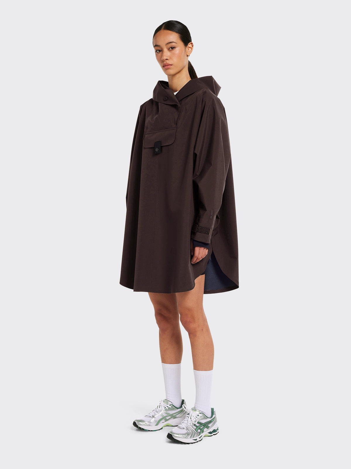 Bergen Poncho har A-formet silhuett. Den er vanntett, vindtett og pustende og passer i alle typer vær - hele året! Oversized passform. – Justerbar ermeåpning med elastisk lycra-mansjett