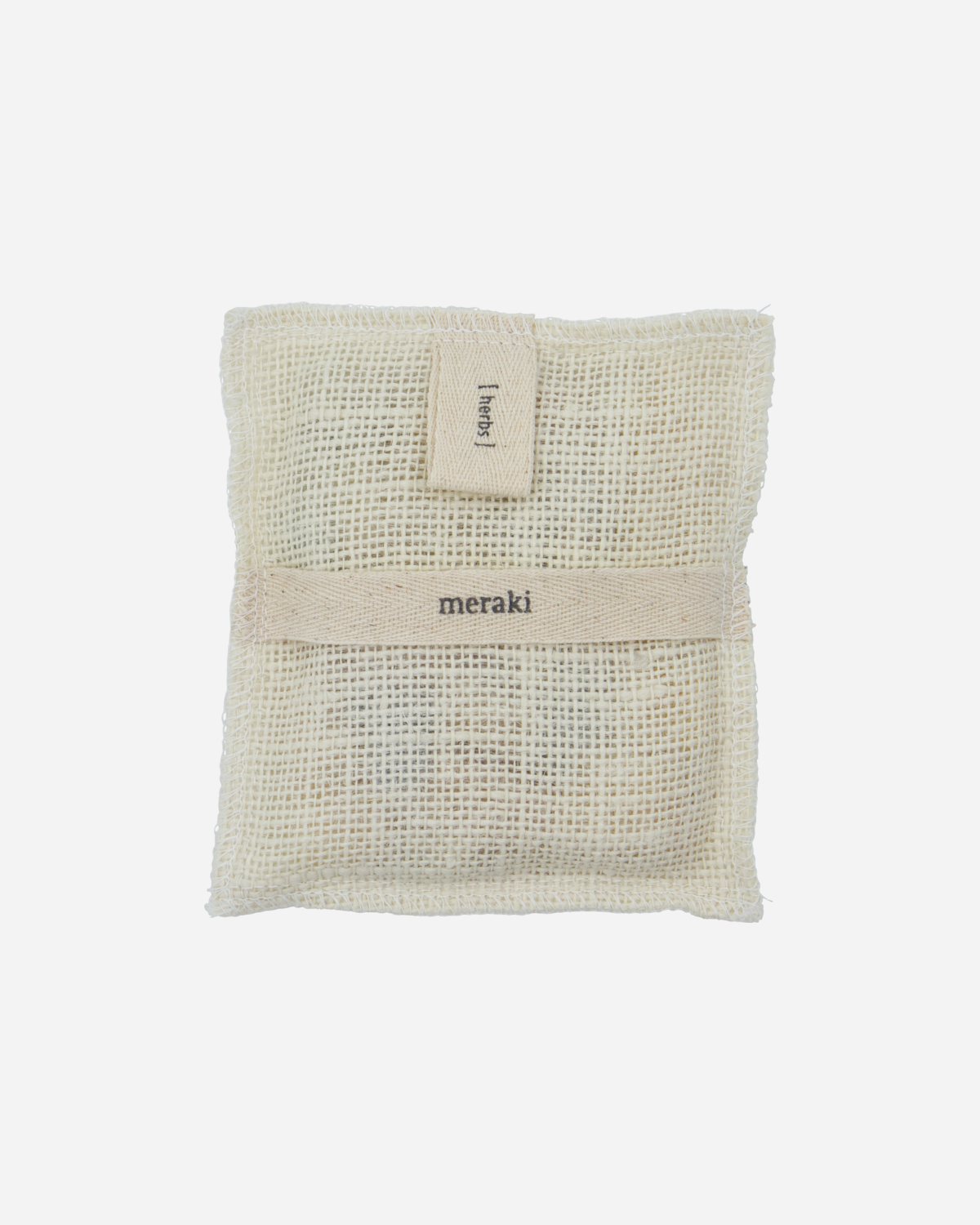 Eksfolier forsiktig huden mens du vasker kroppen med Merakis badeskrubb. Badeskrubben er laget av 100% jute og er fylt med håndlaget såpe som kommer frem når du bruker den til å vaske kroppen. Såpen har en mild duft av urter. Fukt badeskrubben med vann før du skrubber huden i sirkulære bevegelser. Skyll grundig med vann.