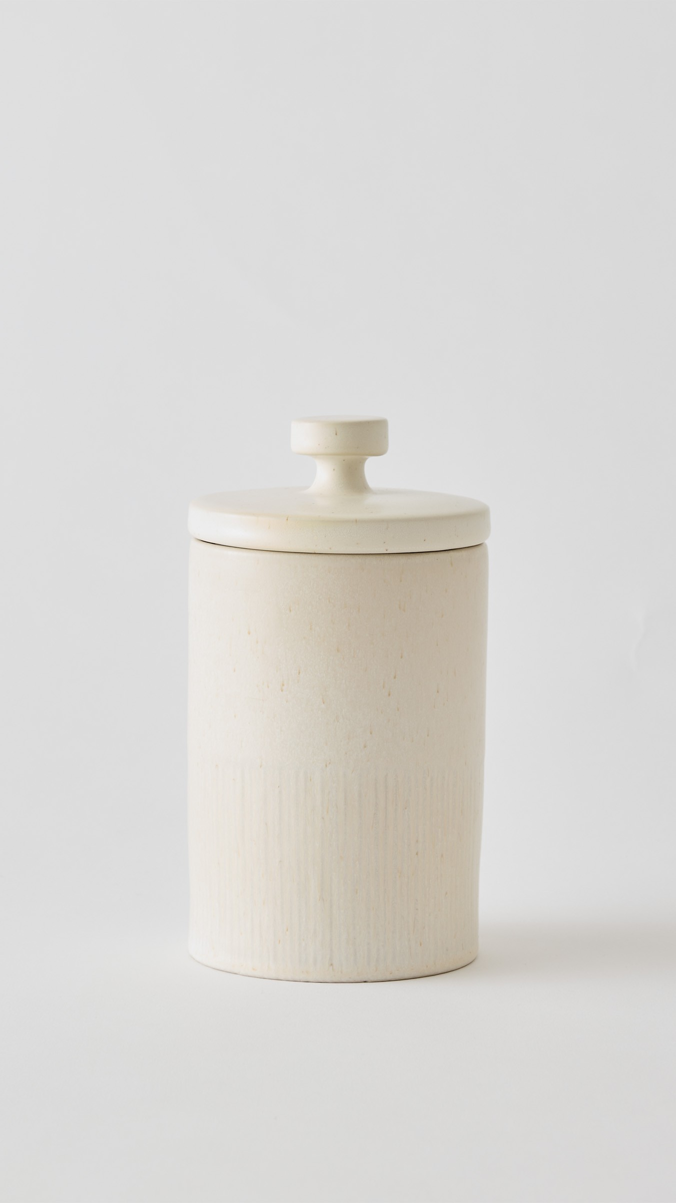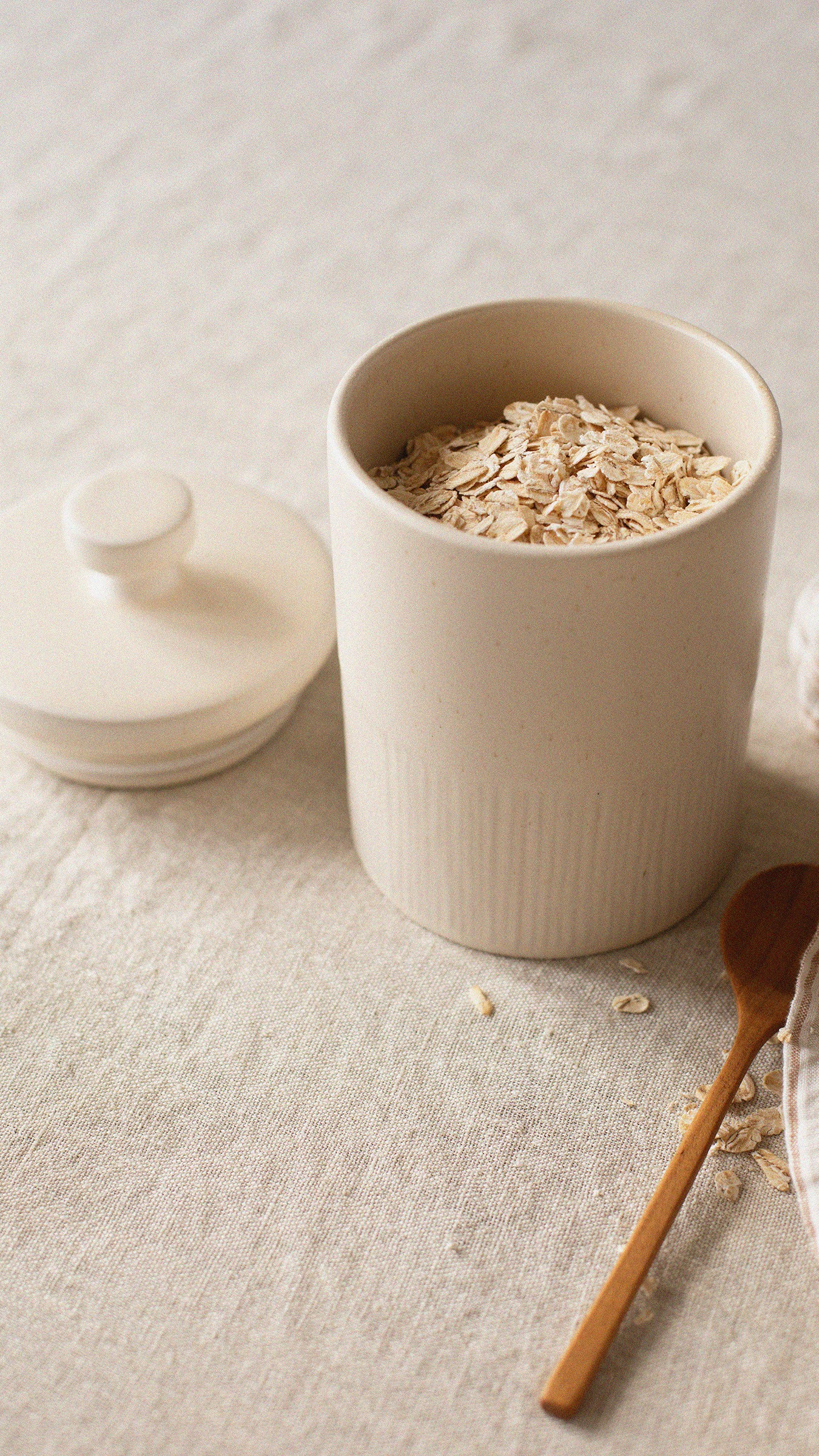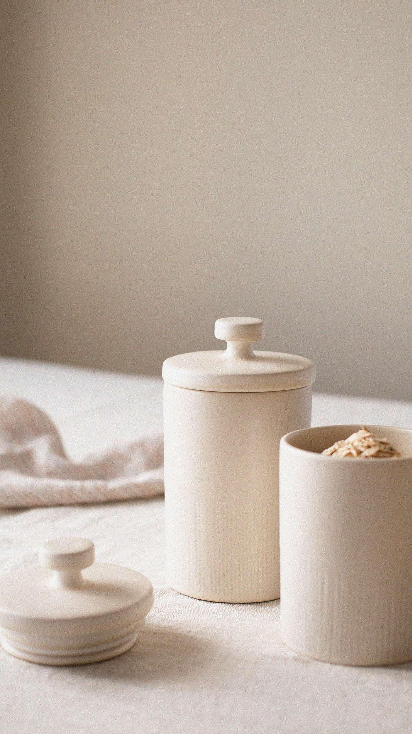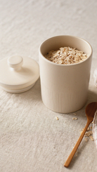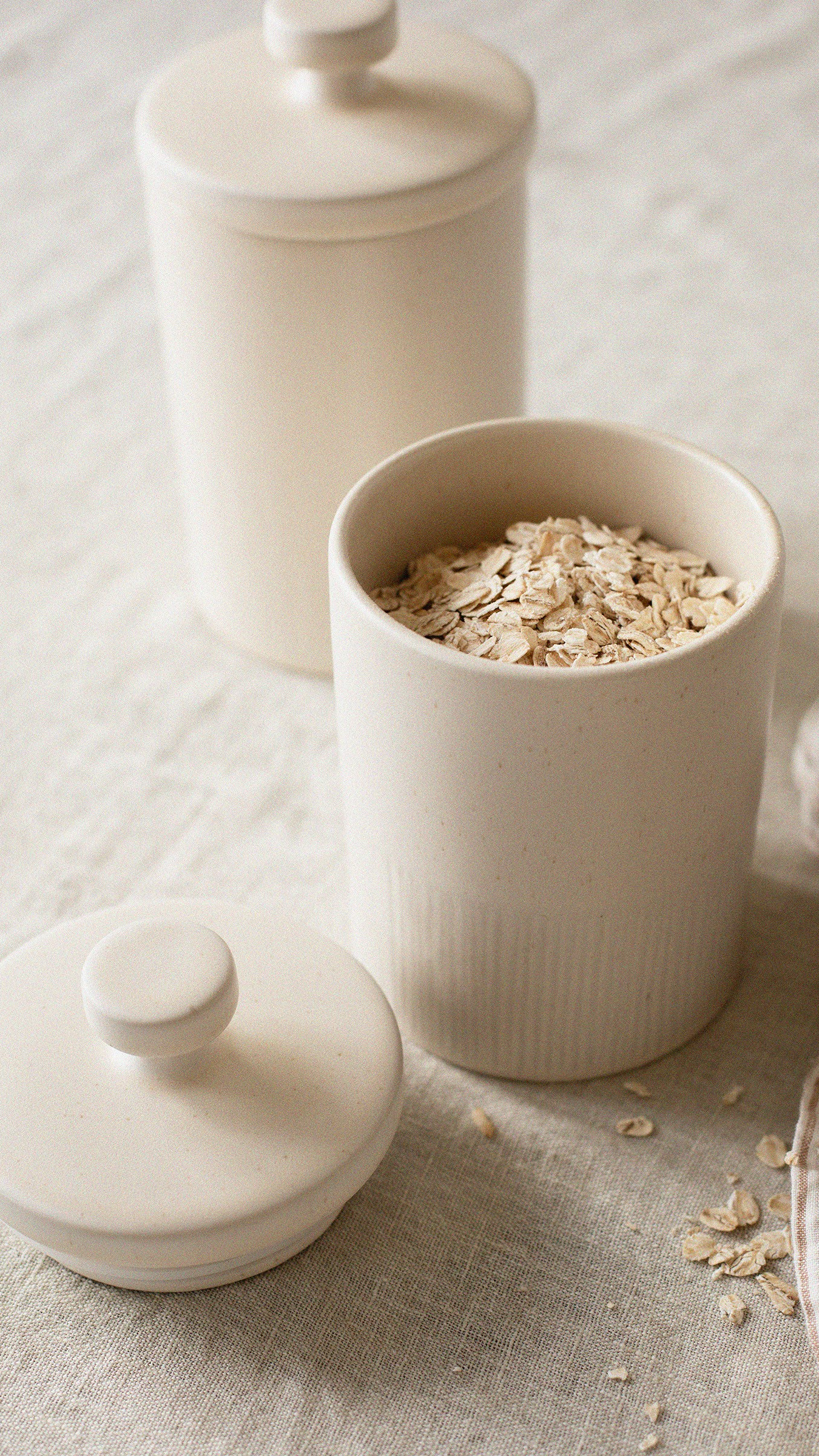 Oppbevaringskrukker i kremfarget steintøy, perfekt til oppbevaring av tørrvarer på kjøkkenet. Lokkene har en silikonforsegling rundt innerkanten, noe som gir en lufttett lukking. Krukkene kommer i to størrelser: små og mellomstore.