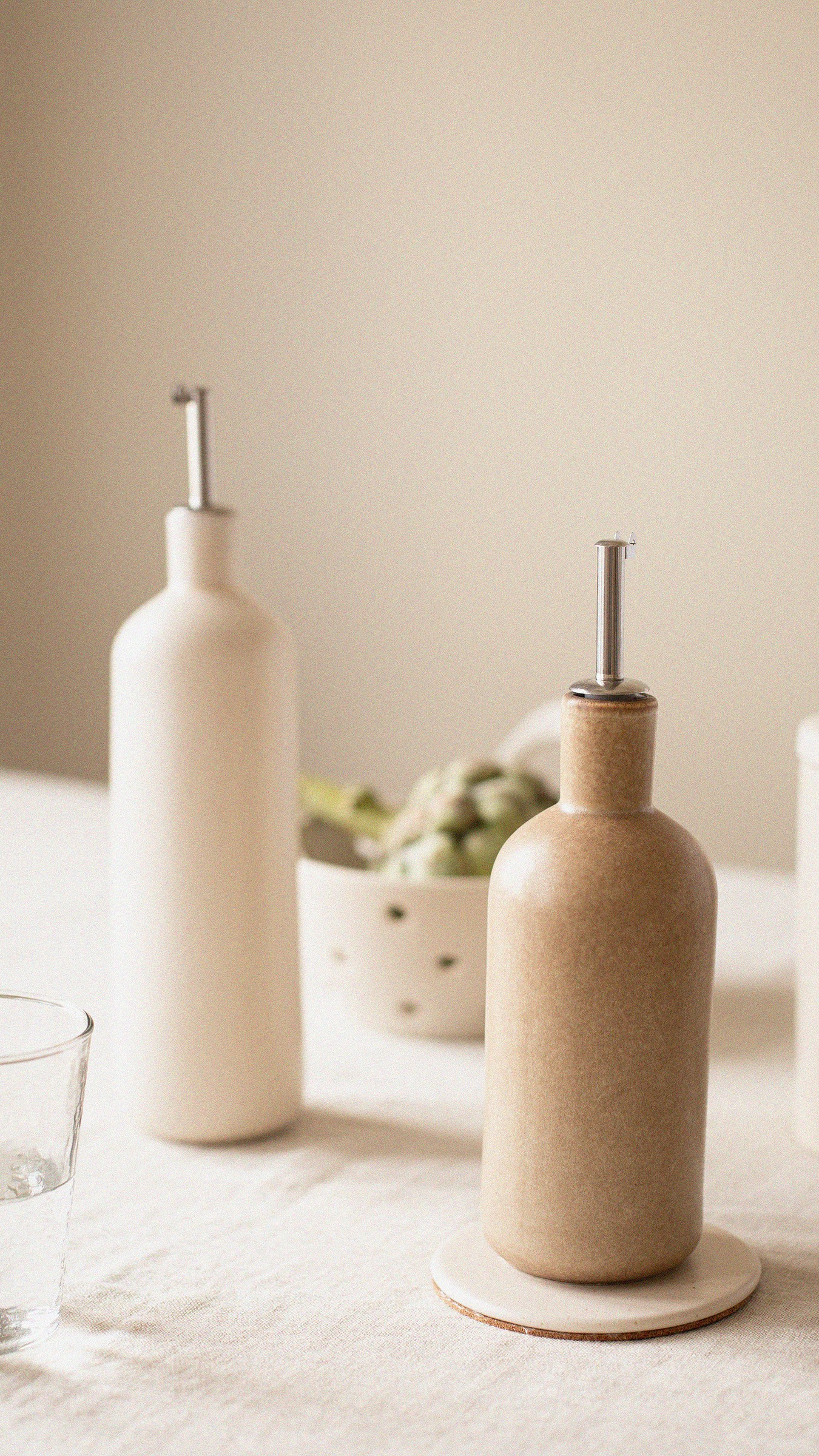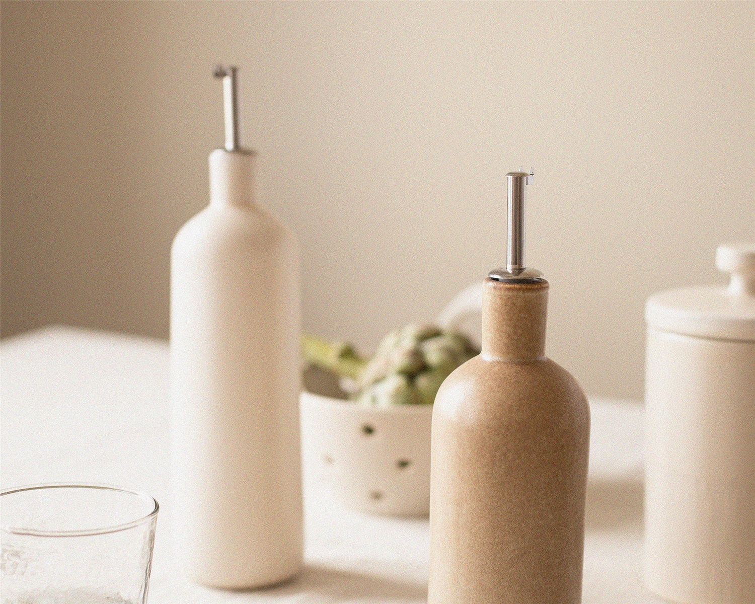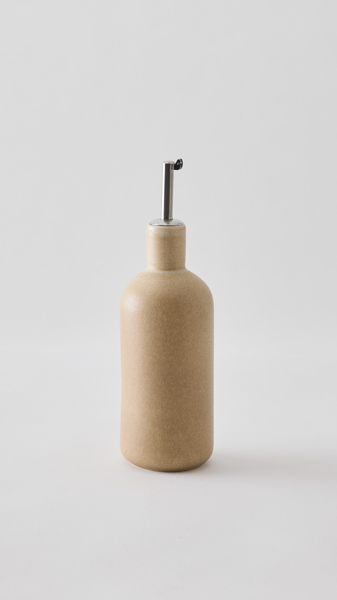 Oljeflaske i kremfarget steintøy med smal metalltut. Tuten er utstyrt med en silikonhette som sikrer en tett forsegling når du heller. Perfekt til olje, eddik eller andre flytende krydder på kjøkkenet. Finnes i to størrelser og er en del av Palermo steintøyserie.