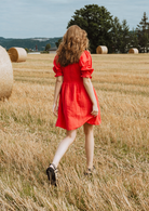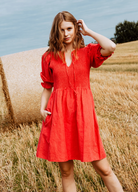 The Benita Dress is cut in our lovely linen blend. It has a mini length, v-neckline and three quarter sleeves with elastic cuffs. The top is made of smocking. A comfortable, true-to-size fit. Choose your usual size. Inner lining in the skirt.