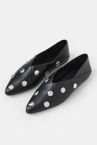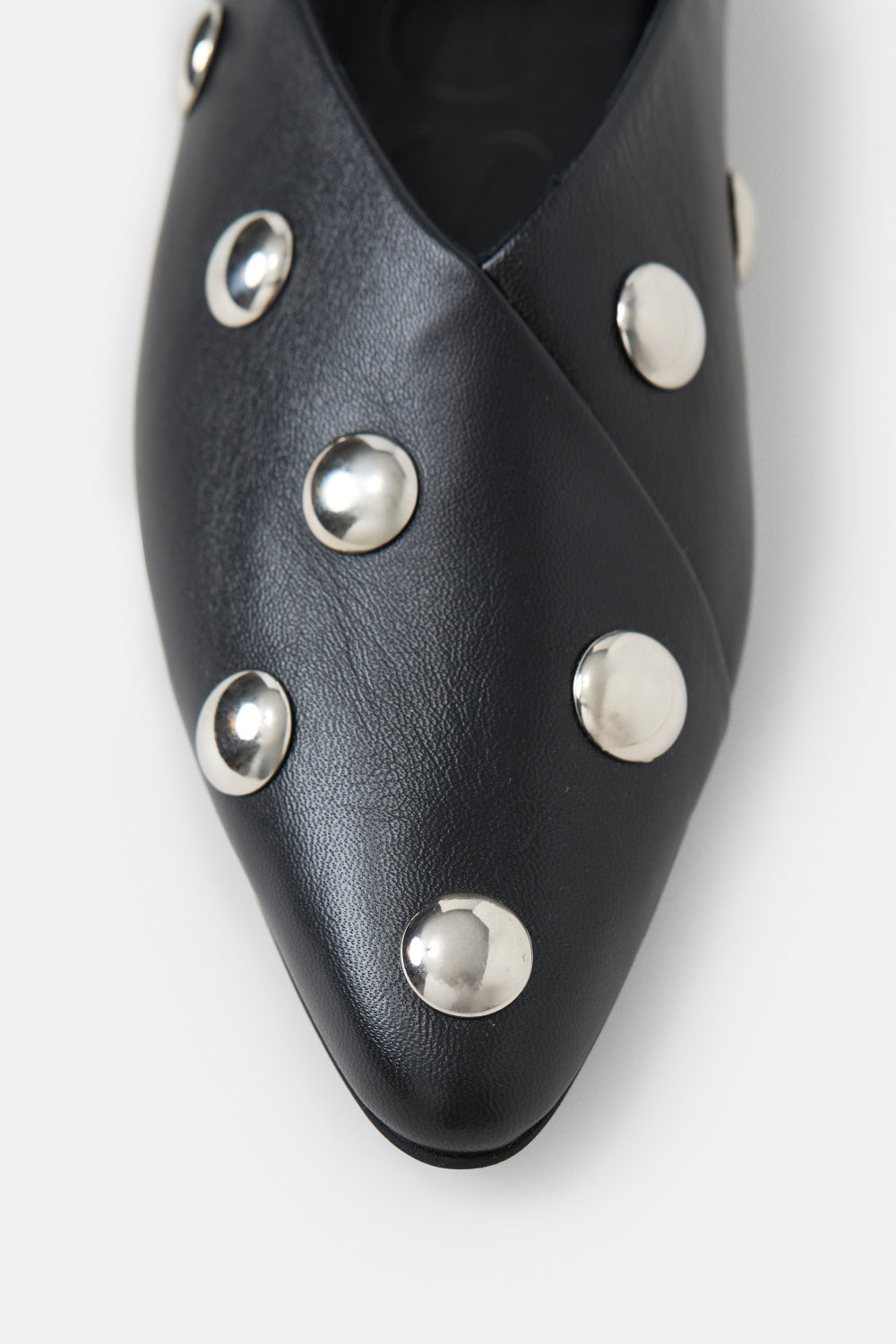 Italienske ballerinaer i skinn med diagonalsøm, metalliske nagler og spiss tå. Sammenleggbar hælkappe for allsidig styling, mykt innvendig fôr og skinninnersåle for komfort.