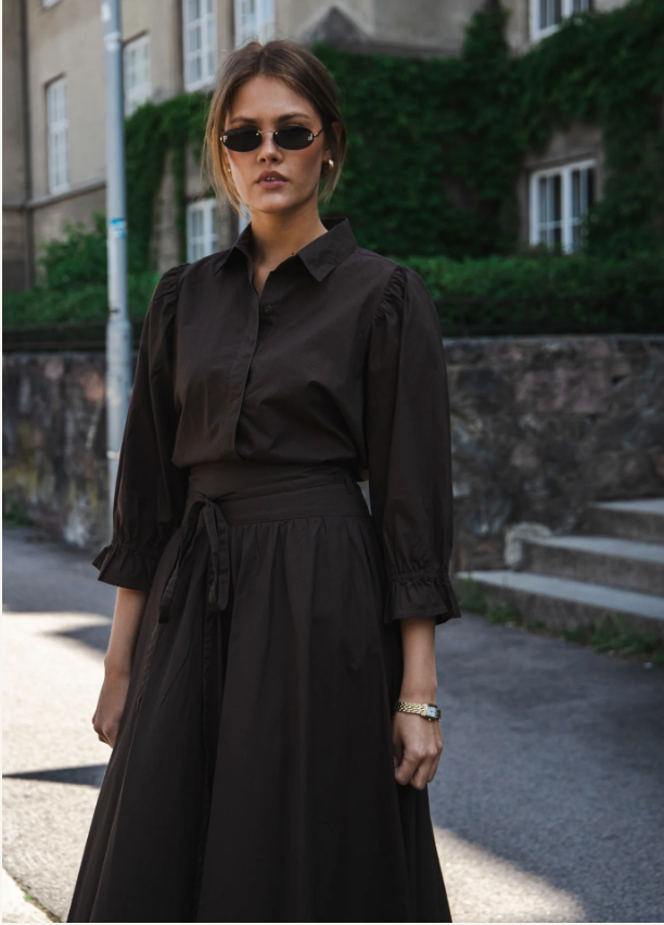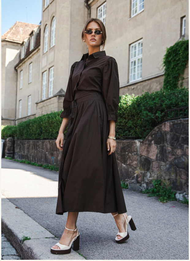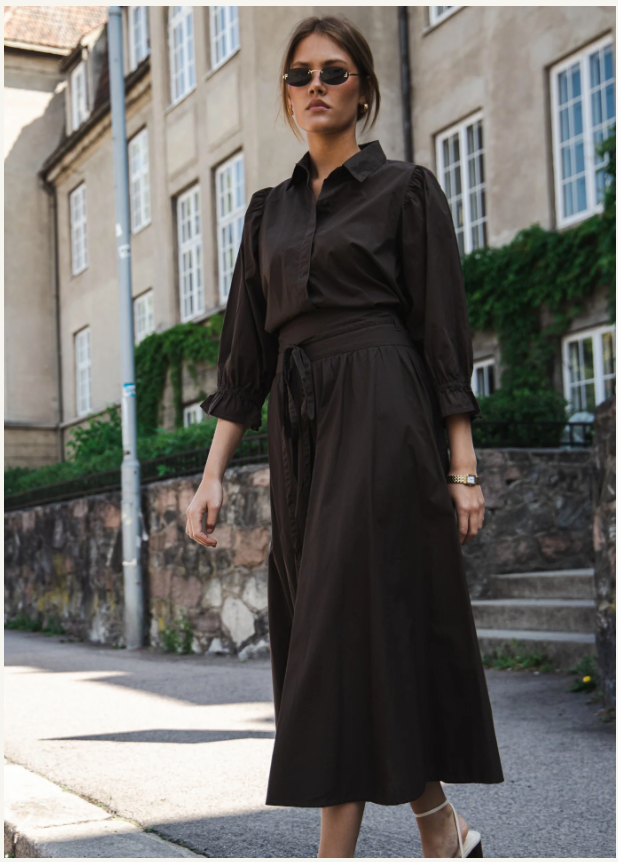 Vi introduserer Astrid-skjørtet i 100 % bomullspoplin. Det har midilengde, en tettsittende midje med vaffelsøm bak og et avtakbart belte. En komfortabel passform som er normal i størrelsen. Velg din vanlige størrelse.