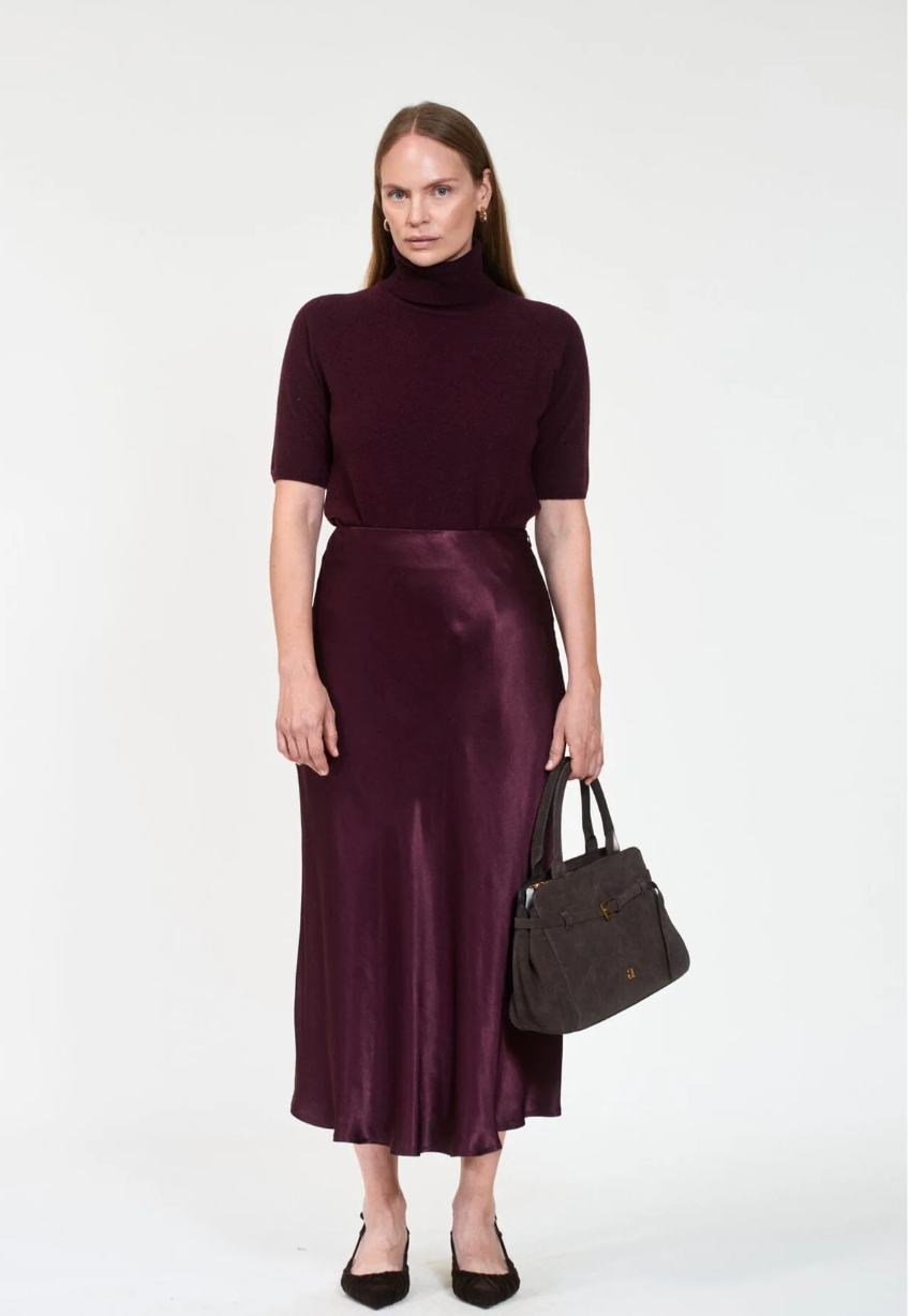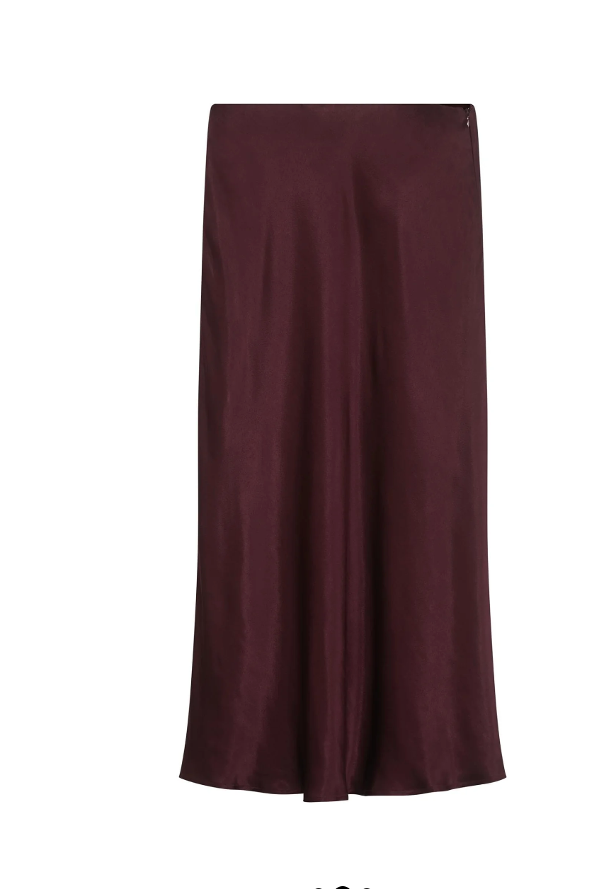 Elegant A-linjeskåret skjørt i en lett og luftig sateng. Skjørtet er konstruert med underskjørt for et mykere fall og glidelås i siden. Allsidig skjørt som kan brukas både til hverdag og til fest.