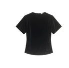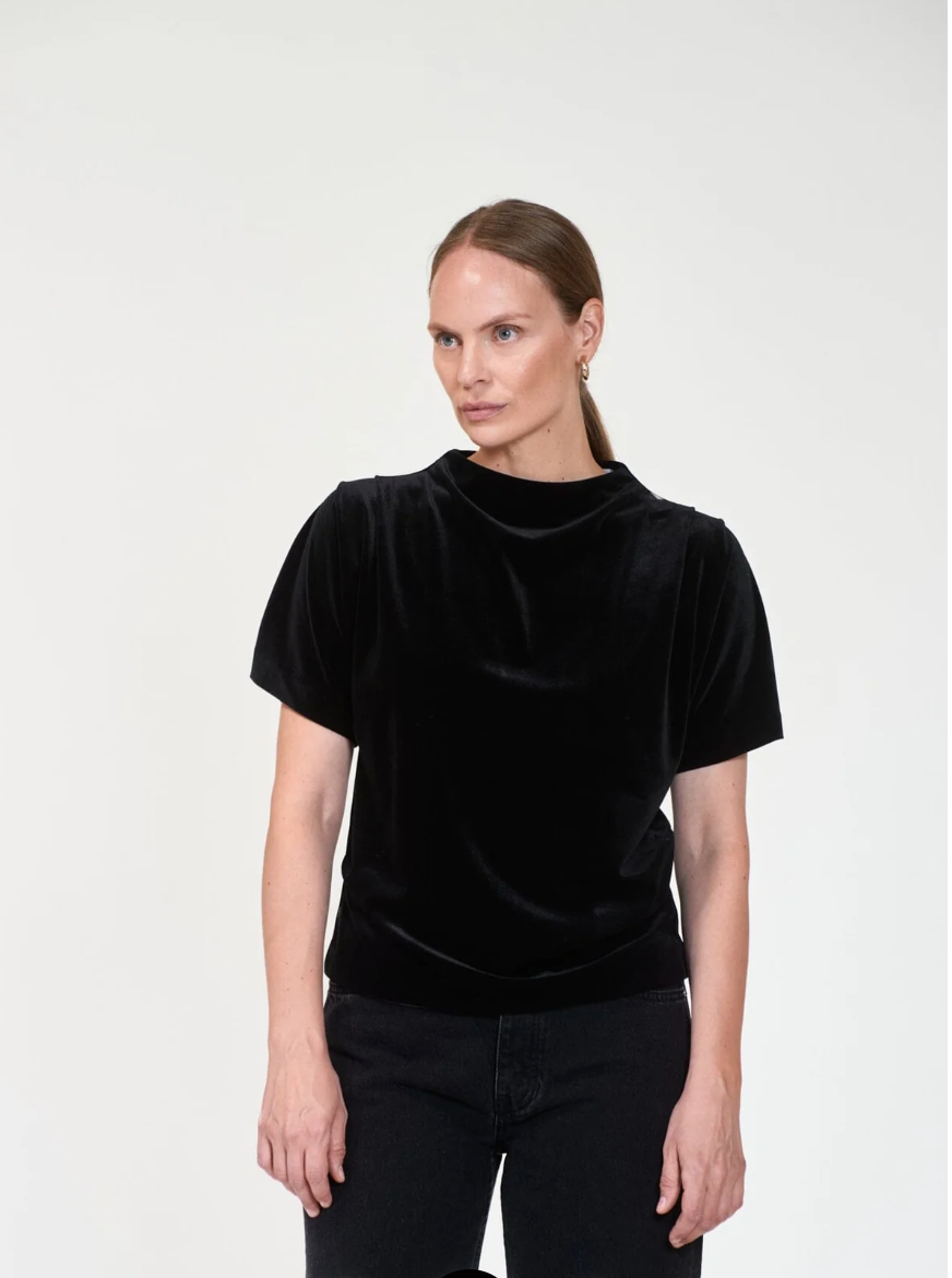 Elegant topp laget i en delikat stretchfløyel. Modellen er designet med en høyt skåret hals, skjult glidelås bak, korte ermer med et avrundet skulderparti og legg foran for å skape en lett drapert effekt. Rett til noe ettersittende i fasongen.