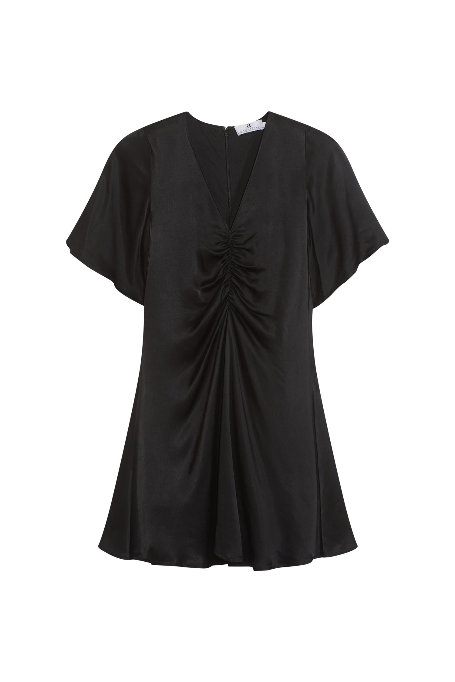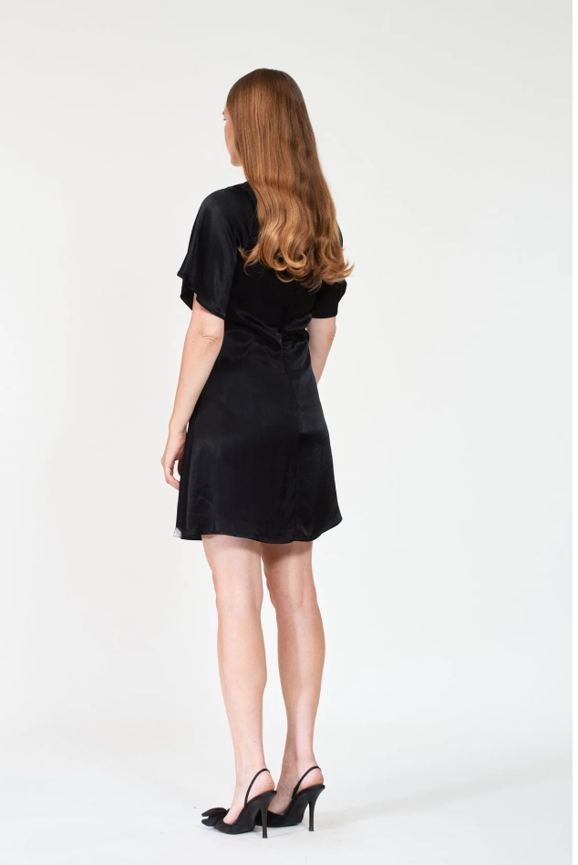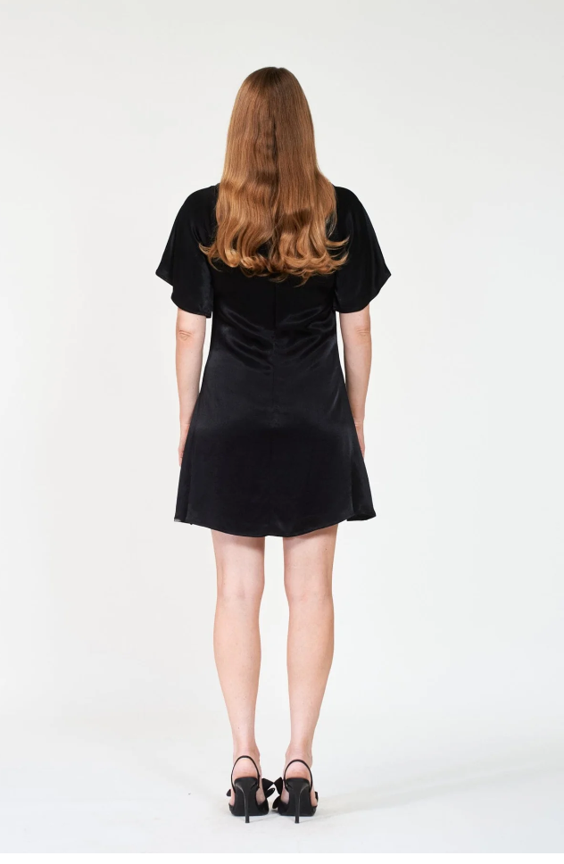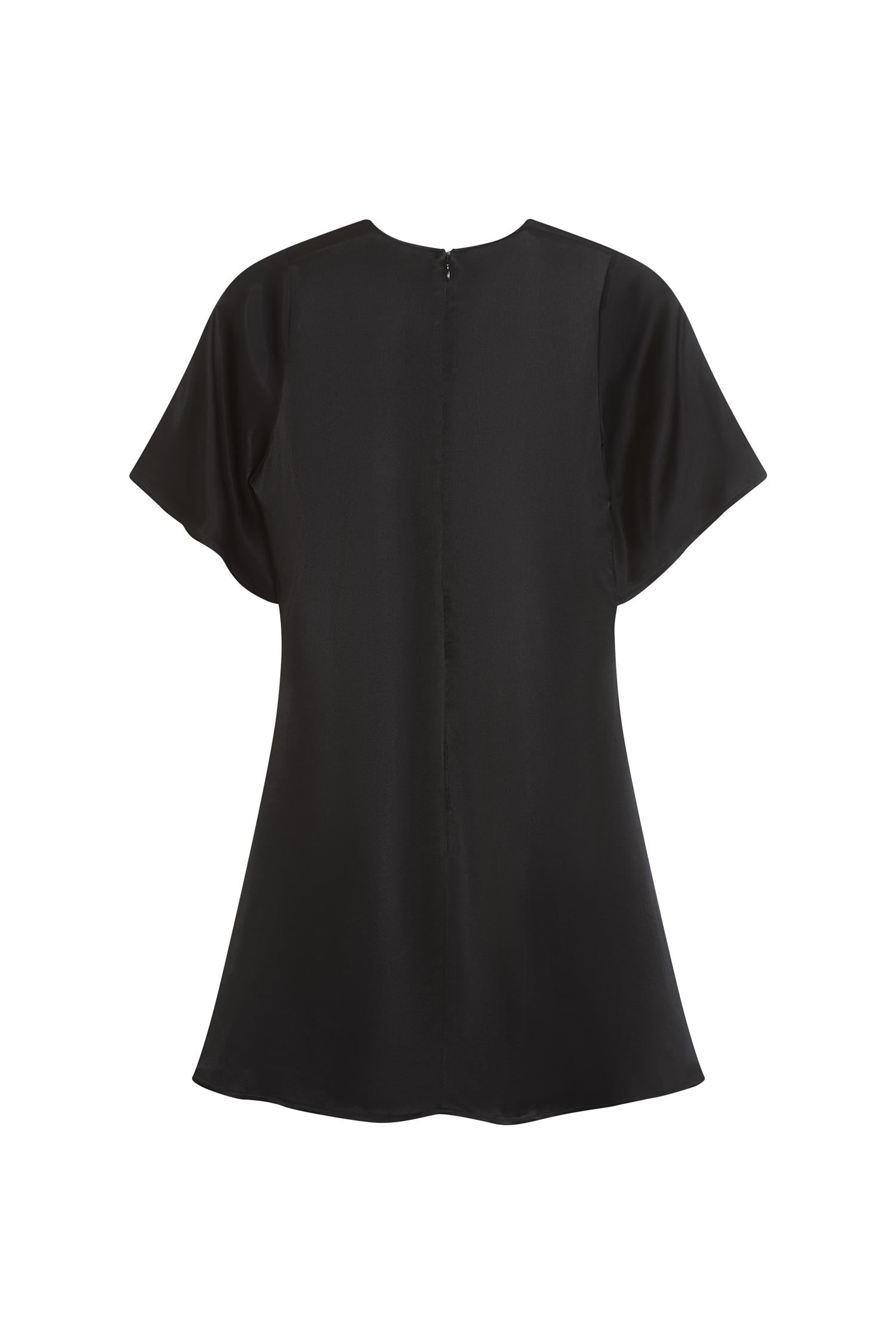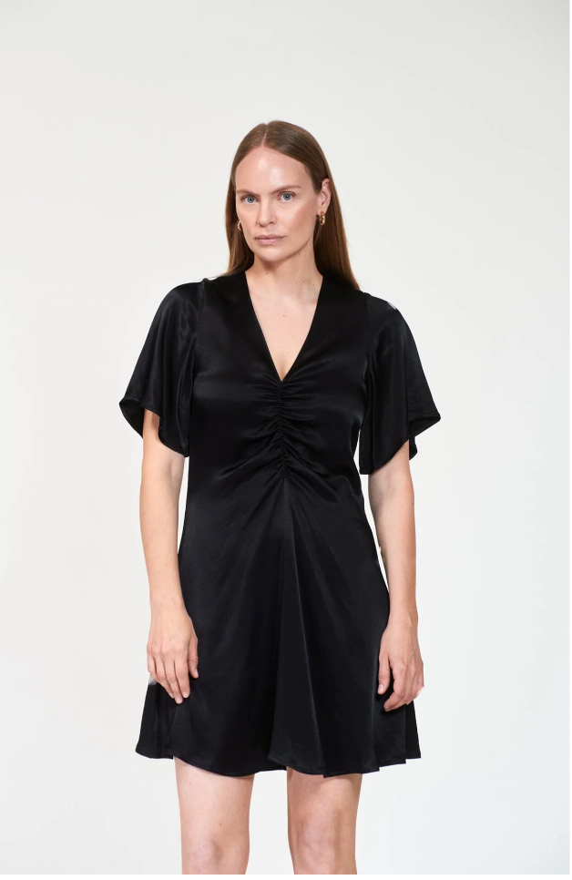 Elegant minikjole med feminin silhuett og gjennomtenkte detaljer som fremhever midjen. Draperingene i front skaper en flatterende e?ekt, mens skjørtet faller lett i en subtil A-fasong. Kjolen har V-utringning, korte tulipanermer og lukkes med glidelås bak.