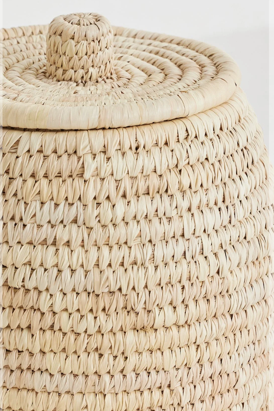 Vår naturlige Palm Fiber Dhali-kurv med lokk er en vakker måte å introdusere vevd tekstur på hjemmet ditt. Tidløs og funksjonell, den avsmalnende formen vil se flott ut med våre favoritttoner av tømmer, andre naturlige fibre, kritthvite og jordnære leire. Sett sammen med de små og mellomstore Dhali-kurvene for ekstra oppbevaring i samme vev og farge for å skape en sammenhengende visuell historie i hjemmestylingen din. Den store Dhali-kurven er ideell for oppbevaring av hudpleie- og skjønnhetsprodukter på badet; stylet på en hylle i stuen for å holde de essensielle hverdagstingene ryddige; på en konsoll i inngangspartiet for å holde nøkler; eller for oppbevaring av små leker og håndverksmateriell. Håndlaget av fair trade-håndverkere i et landsbysamfunn i Bangladesh, hver del er satt sammen ved å bunte kaisa-gress; pakke dem inn i fine strimler av daddelfiber og kveil og veve dem i form. Kvinnene som lager disse stykkene jobber hjemmefra, og et ekte Fair Trade-partnerskap sikrer at de får rettferdig betalt for sin tid og ferdigheter, blant mange andre fordeler.