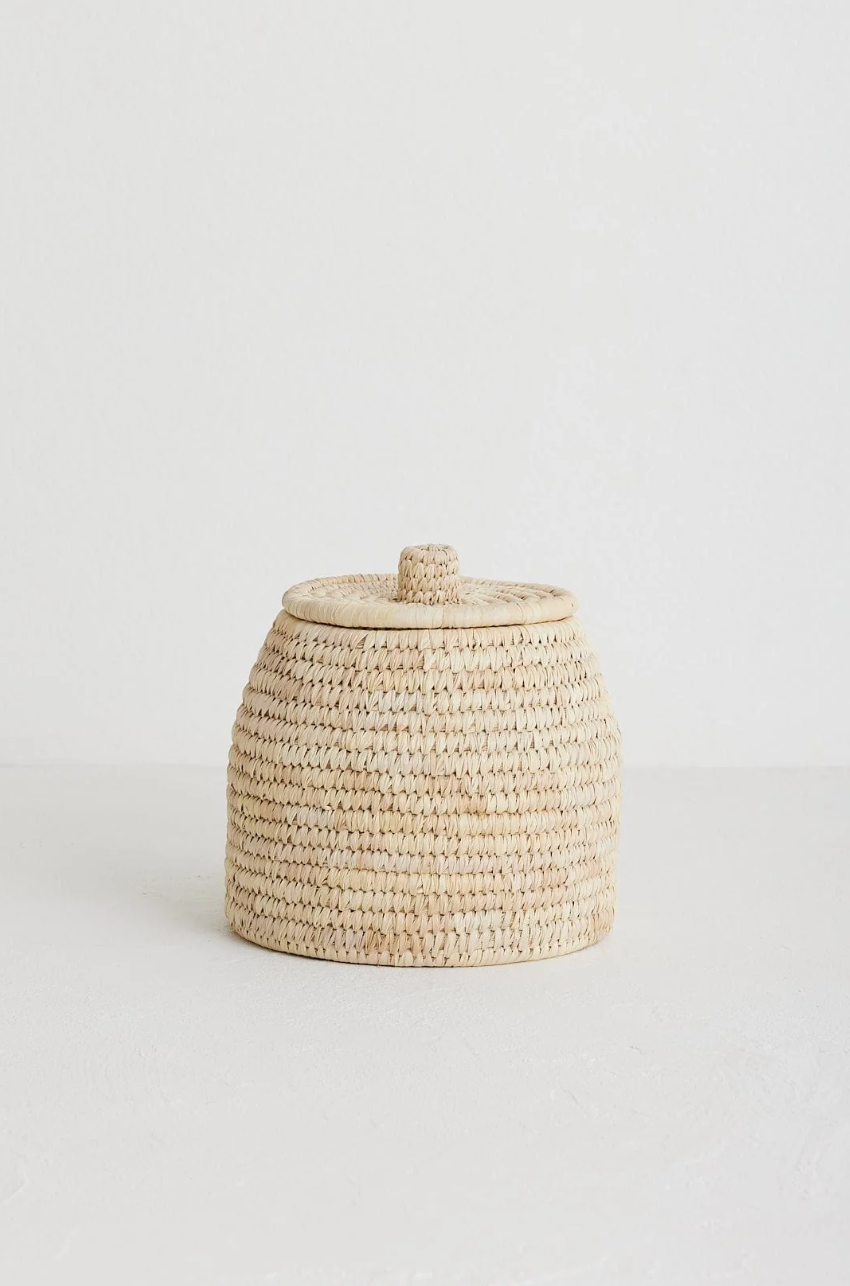 Vår naturlige Palm Fiber Dhali-kurv med lokk er en vakker måte å introdusere vevd tekstur på hjemmet ditt. Tidløs og funksjonell, den avsmalnende formen vil se flott ut med våre favoritttoner av tømmer, andre naturlige fibre, kritthvite og jordnære leire. Dhali-kurven er ideell for oppbevaring av hudpleie- og skjønnhetsprodukter på badet; stylet på en hylle i stuen for å holde de essensielle hverdagstingene ryddige; på en konsoll i inngangspartiet for å holde nøkler; eller for oppbevaring av små leker og håndverksmateriell. Håndlaget av fair trade-håndverkere i et landsbysamfunn i Bangladesh, hver del er satt sammen ved å bunte kaisa-gress; pakke dem inn i fine strimler av daddelfiber og kveil og veve dem i form. Kvinnene som lager disse stykkene jobber hjemmefra, og et ekte Fair Trade-partnerskap sikrer at de får rettferdig betalt for sin tid og ferdigheter, blant mange andre fordeler.