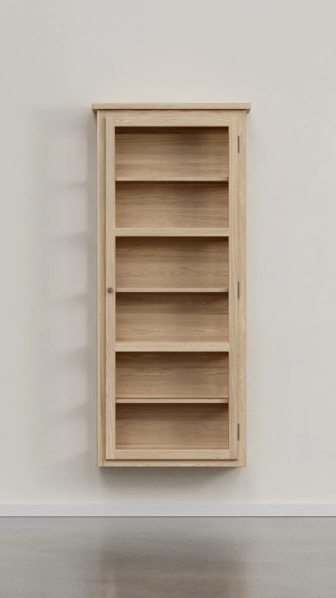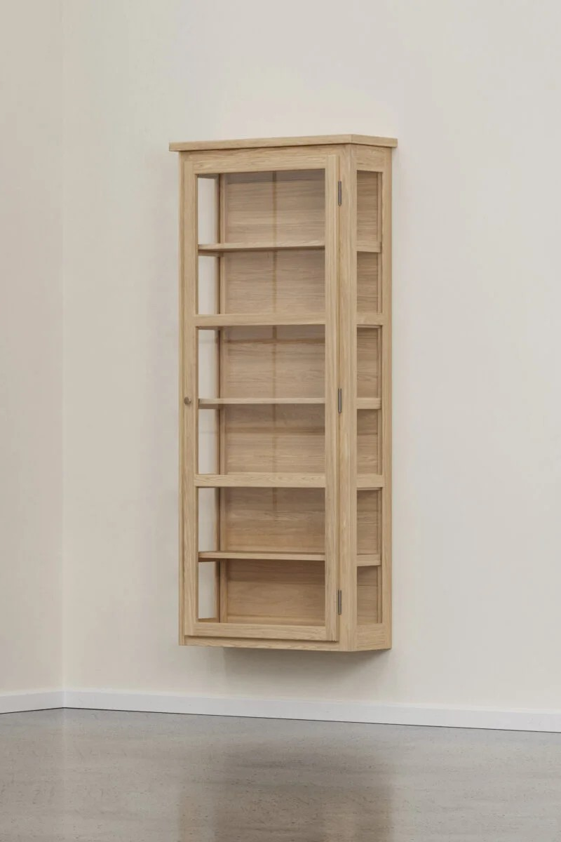 N4 Light Oak er et veggmontert vitrineskap. Skapet er laget av lys massiv eik med en matt lakkert overflate. Resultatet er en tekstur og varme som fremhever den fine trestrukturen. N4 Light Oak er designet med en forenklet toppprofil og messinghengsler og håndtak.