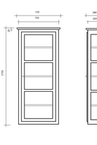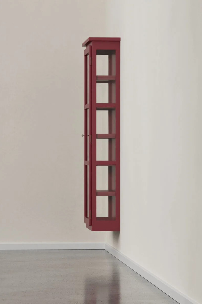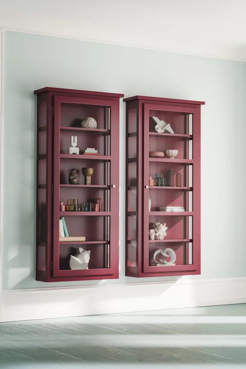 Det veggmonterte Color N4 vitrineskapet er designet i koordinerte farger. I kombinasjon med de rene linjene i N4-vitrinen passer fargen godt inn i den skandinaviske innredningen, der farger og kontraster spilles på. Skapet er laget av heltre furu med messinghengsler og håndtak.