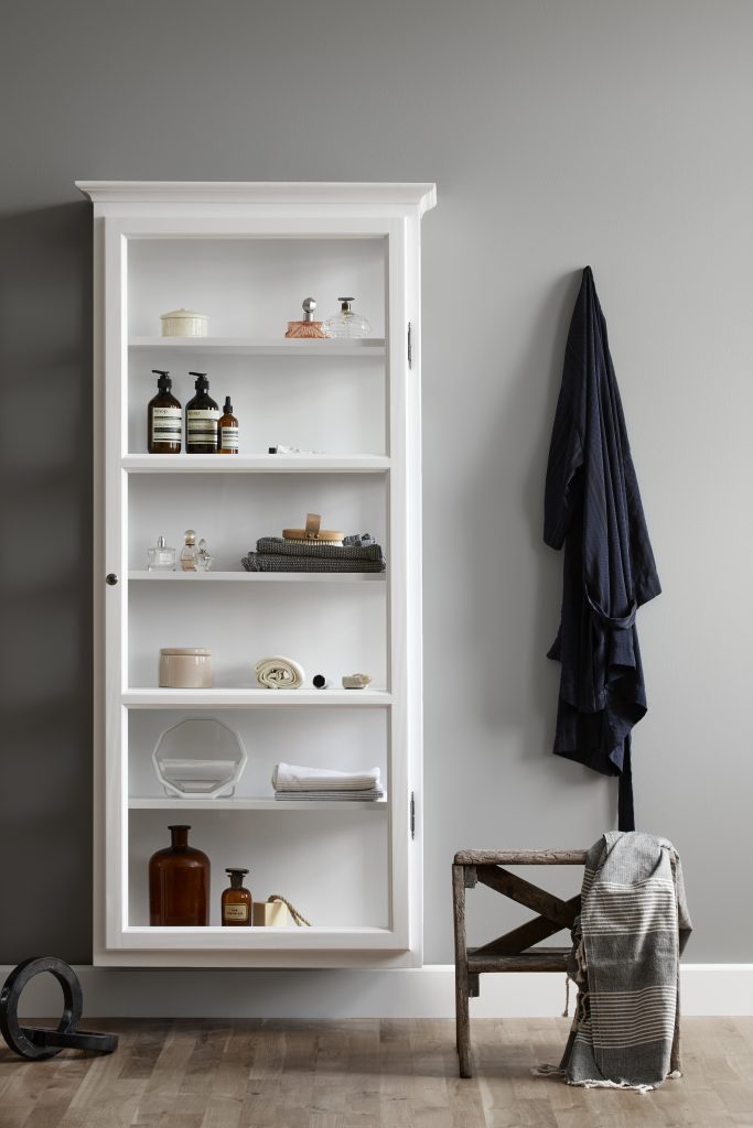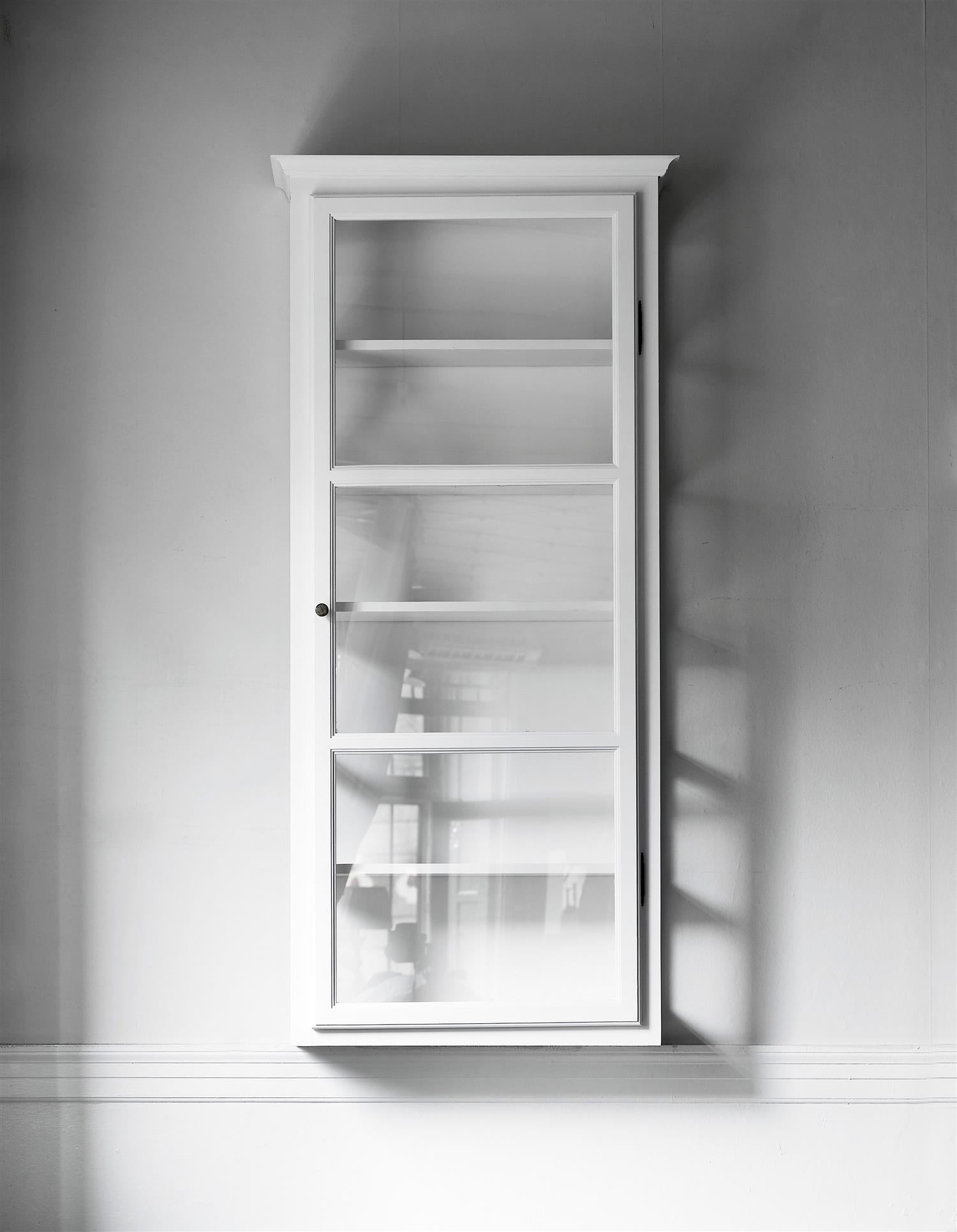Vegghengt vitrineskap i malt furu og glass på sidene. Med sofistikerte detaljer fremheves et elegant uttrykk. Hengsler og håndtak i råjern. Toppprofilen trekker referanse til det tradisjonelle designet, som gjør vitrineskapet til en klassiker innen nordisk design. Vitrineskapet har et tidløst og klassisk utseende og passer inn i det moderne hjemmet.