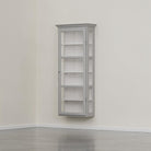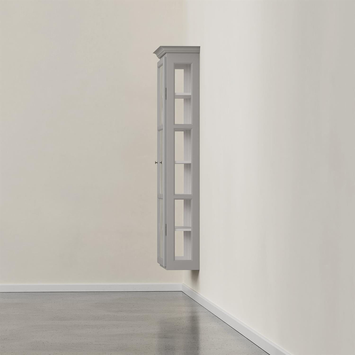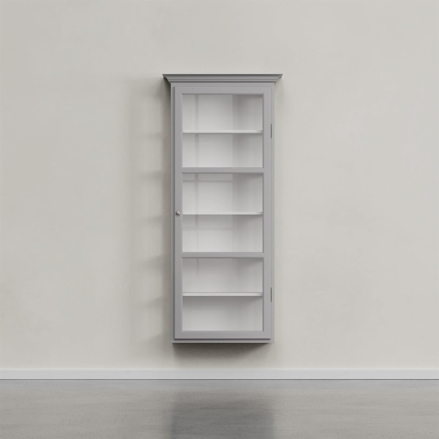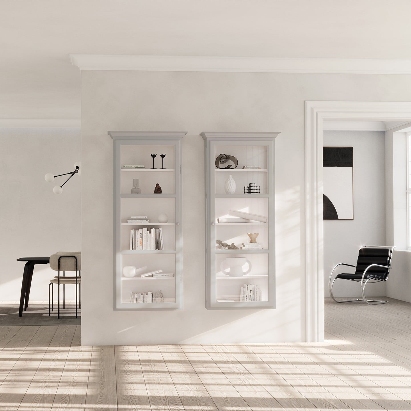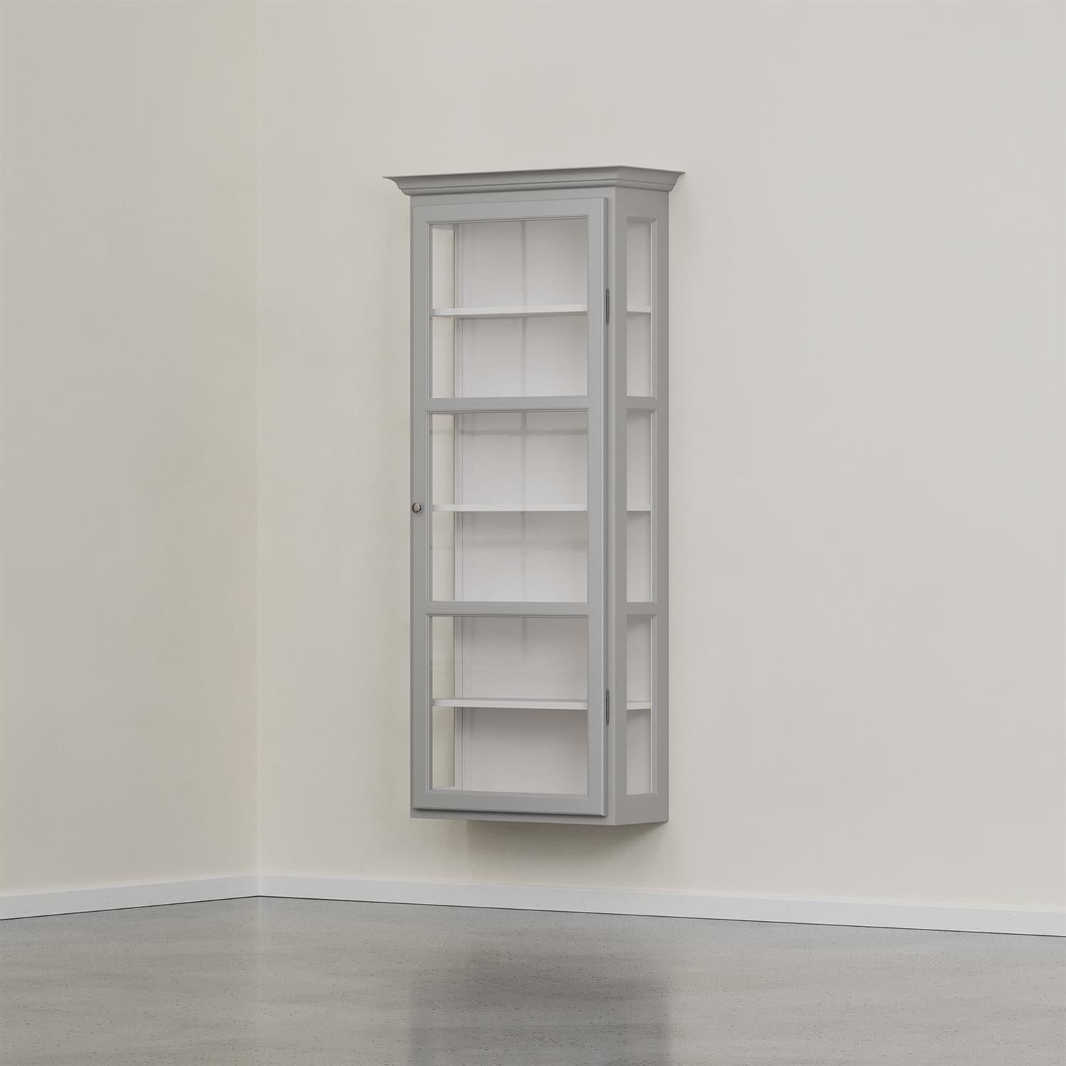Vegghengt vitrineskap i malt furu og glass på sidene. Med sofistikerte detaljer fremheves et elegant uttrykk. Hengsler og håndtak i råjern. Toppprofilen trekker referanse til det tradisjonelle designet, som gjør vitrineskapet til en klassiker innen nordisk design. Vitrineskapet har et tidløst og klassisk utseende og passer inn i det moderne hjemmet.