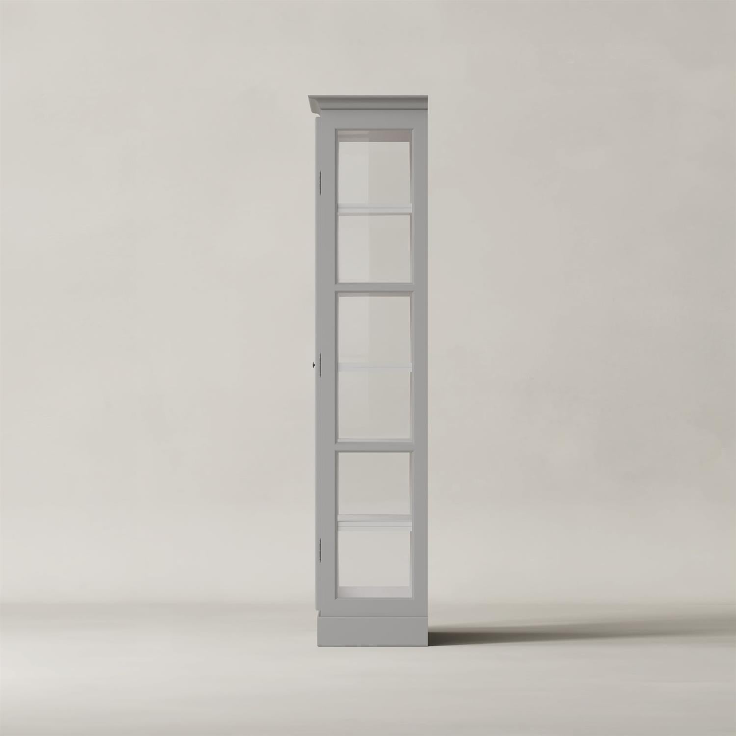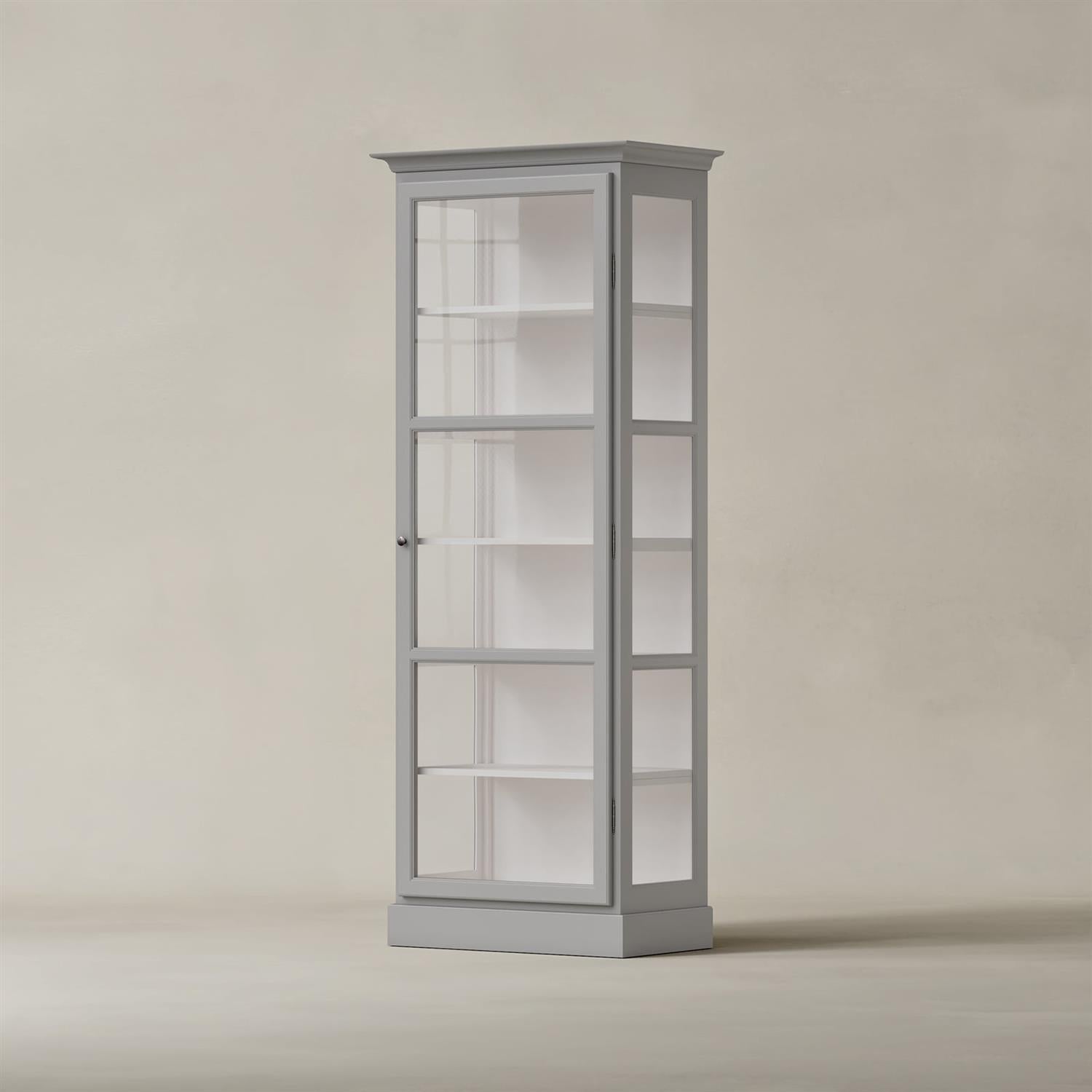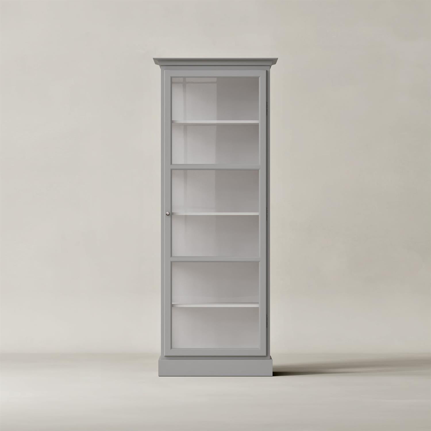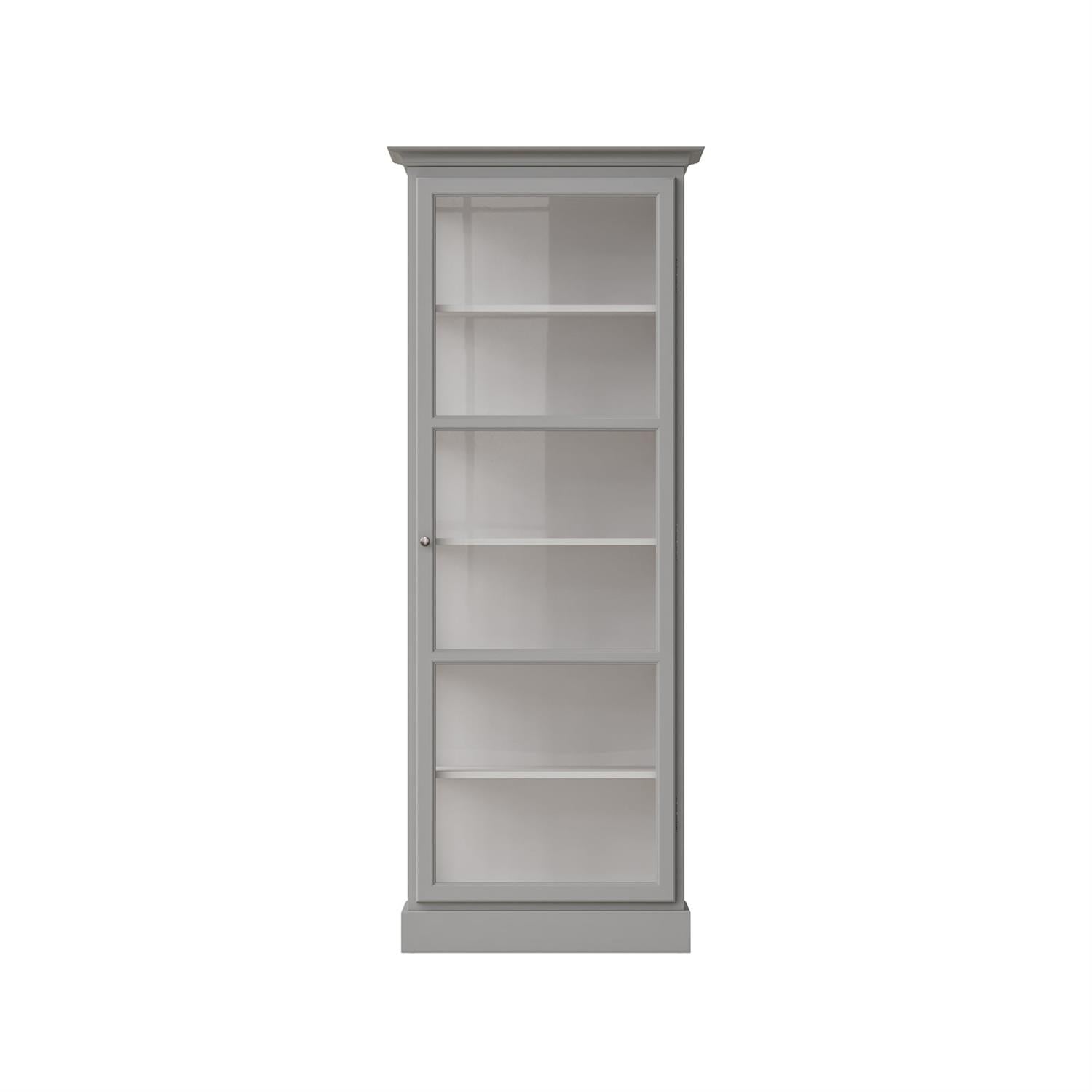 Flott enkelt vitrineskap i malt furu og glass på sidene. Med sofistikerte detaljer fremheves et elegant uttrykk. Hengsler og håndtak i råjern. Toppprofilen trekker referanse til det tradisjonelle designet, som gjør vitrineskapet til en klassiker innen nordisk design. Vitrineskapet har et tidløst og klassisk utseende og passer inn i det moderne hjemmet.