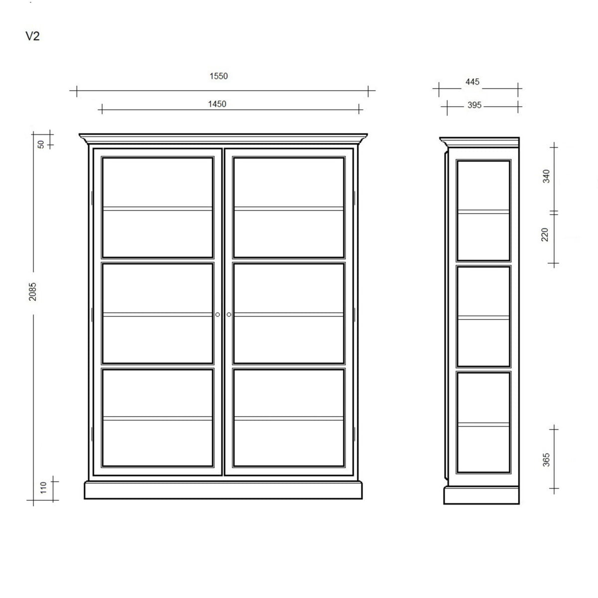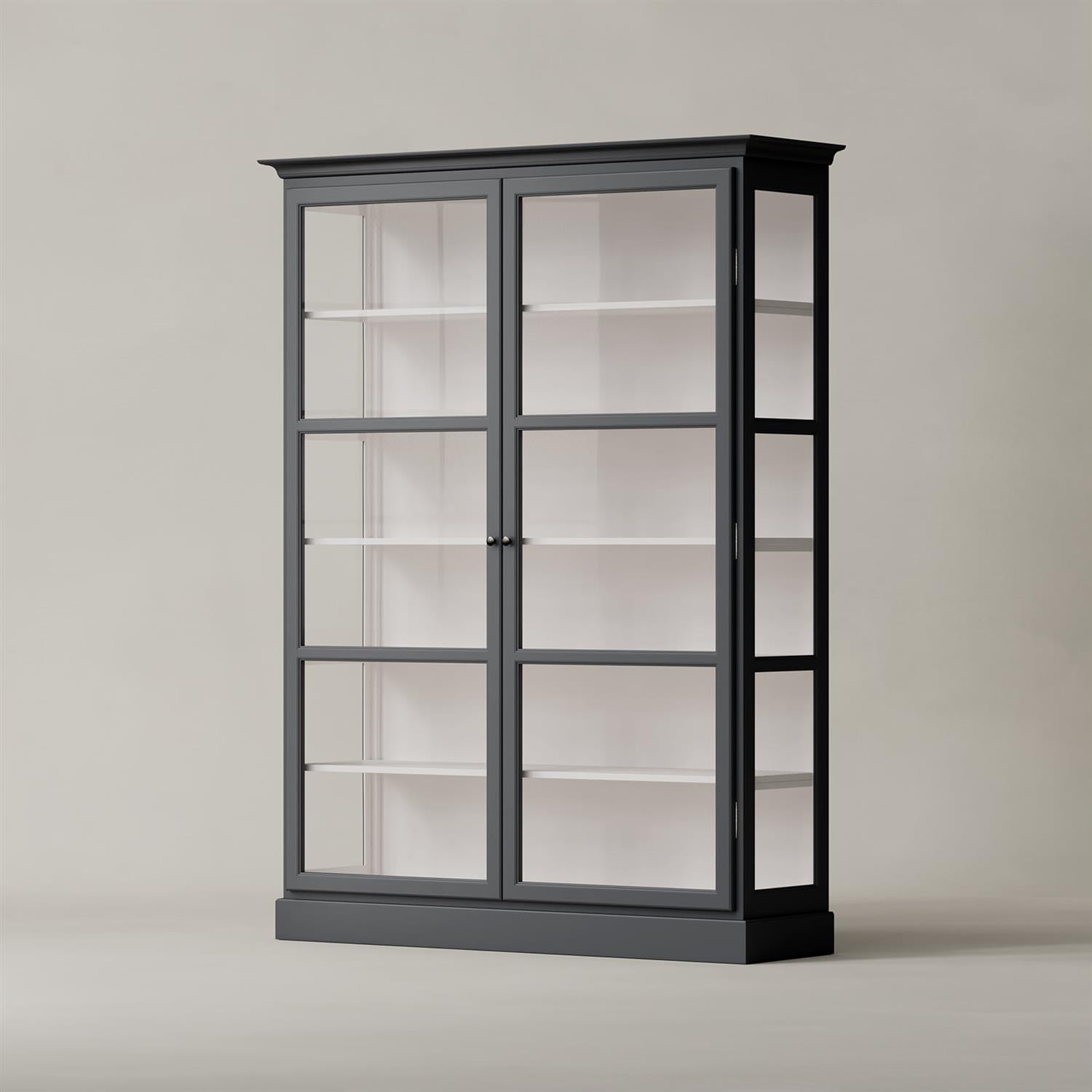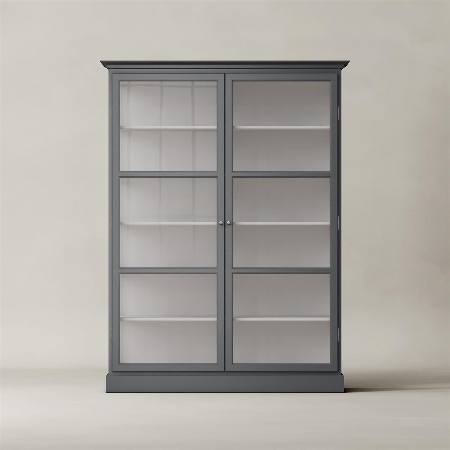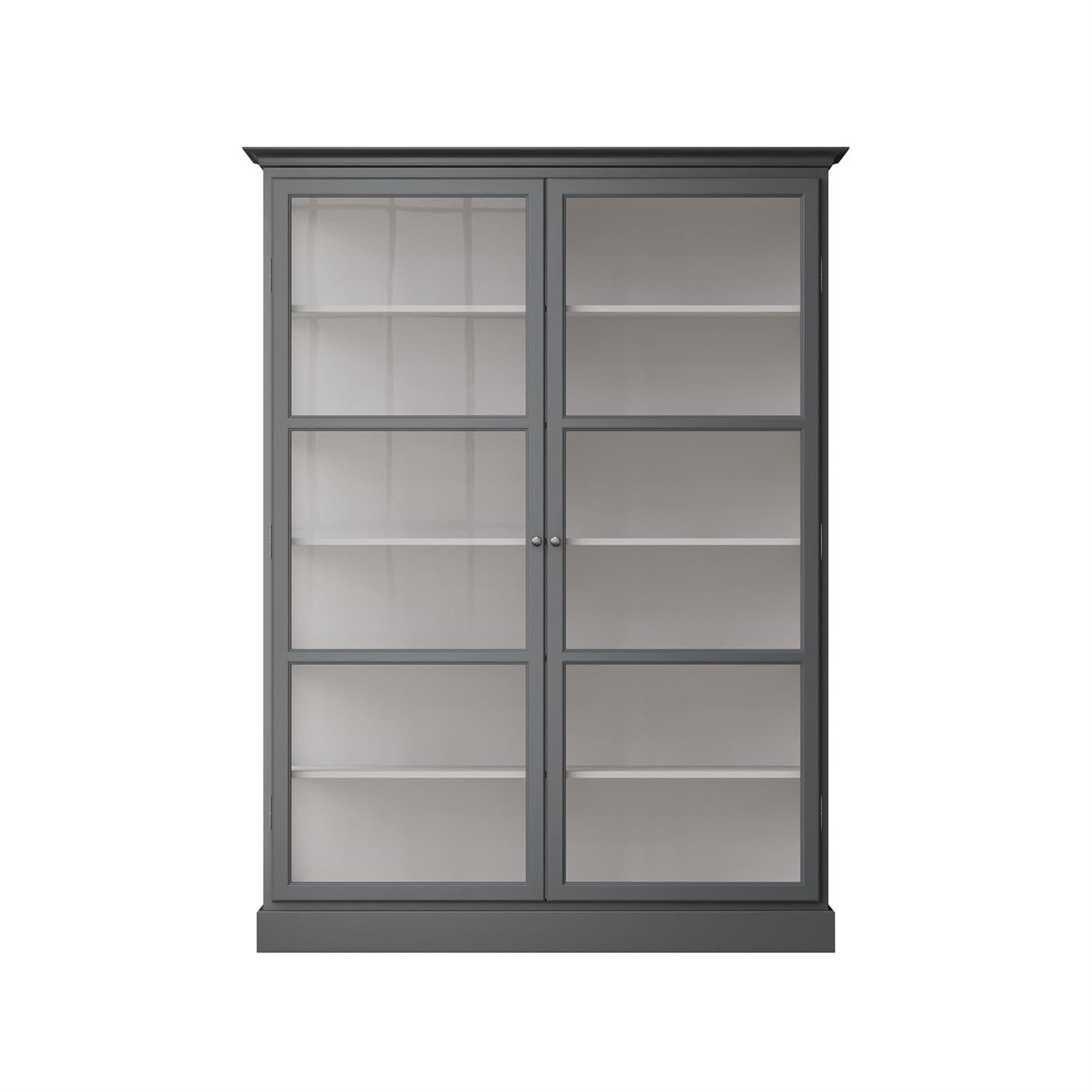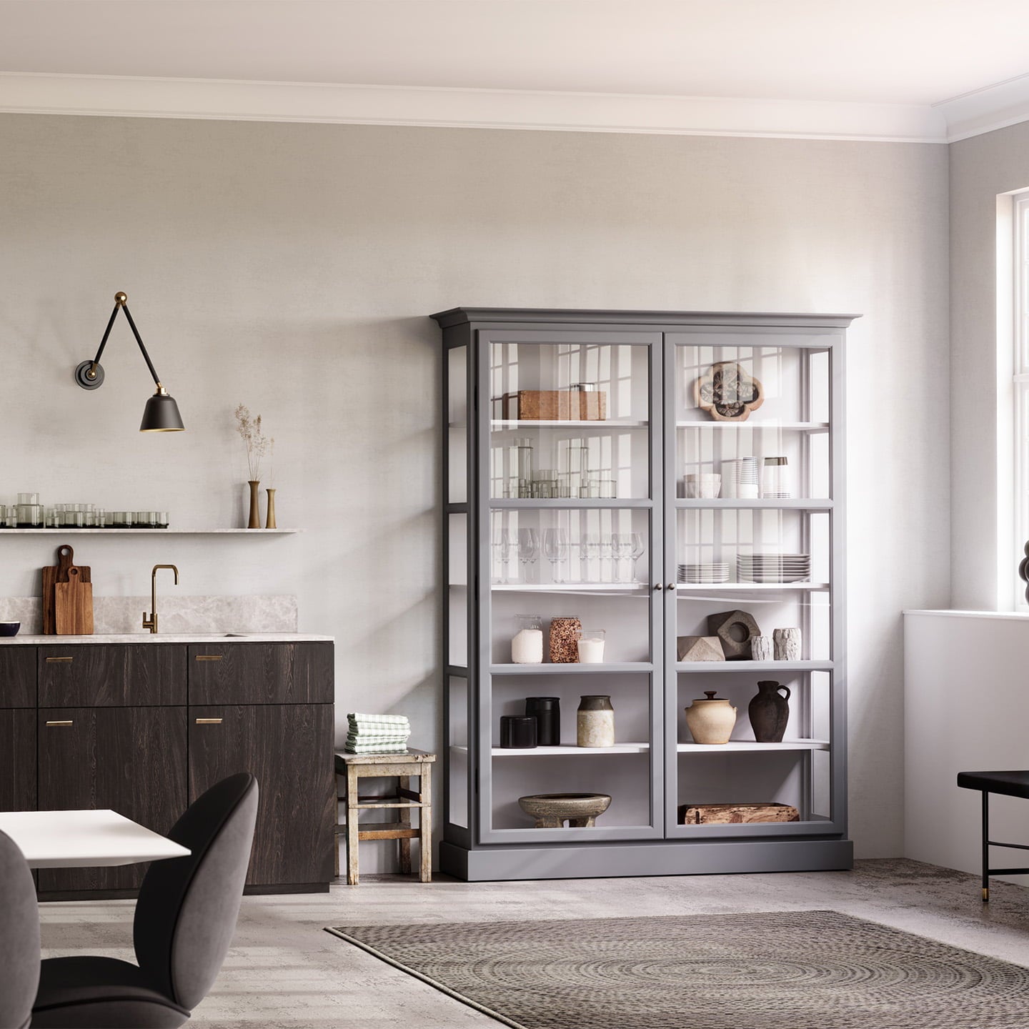 Flott dobbelt vitrineskap i malt furu og glass på sidene. Med sofistikerte detaljer fremheves et elegant uttrykk. Hengsler og håndtak i råjern. Toppprofilen trekker referanse til det tradisjonelle designet, som gjør vitrineskapet til en klassiker innen nordisk design. Vitrineskapet har et tidløst og klassisk utseende og passer inn i det moderne hjemmet.