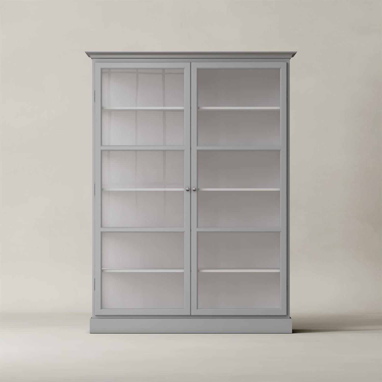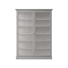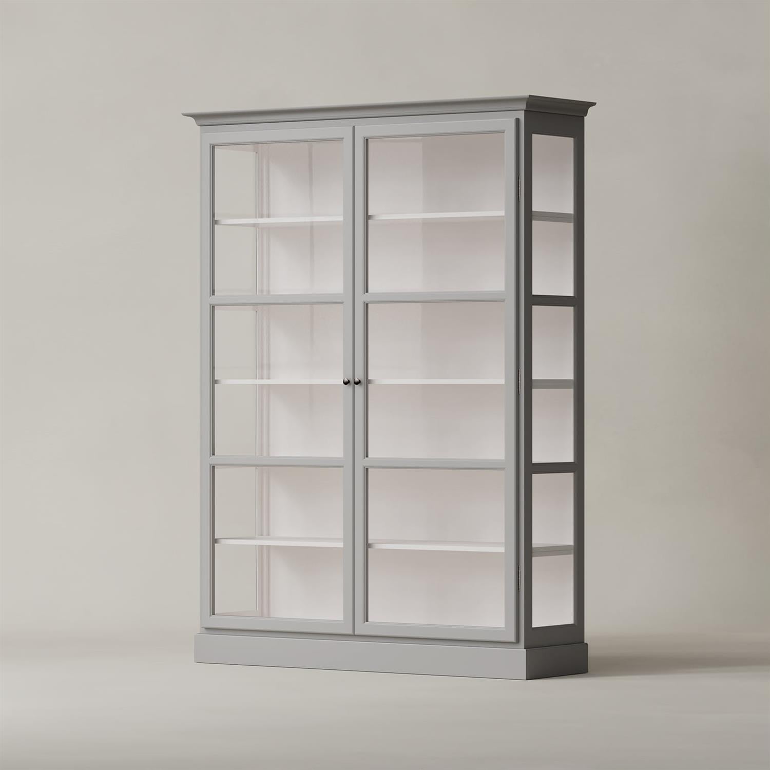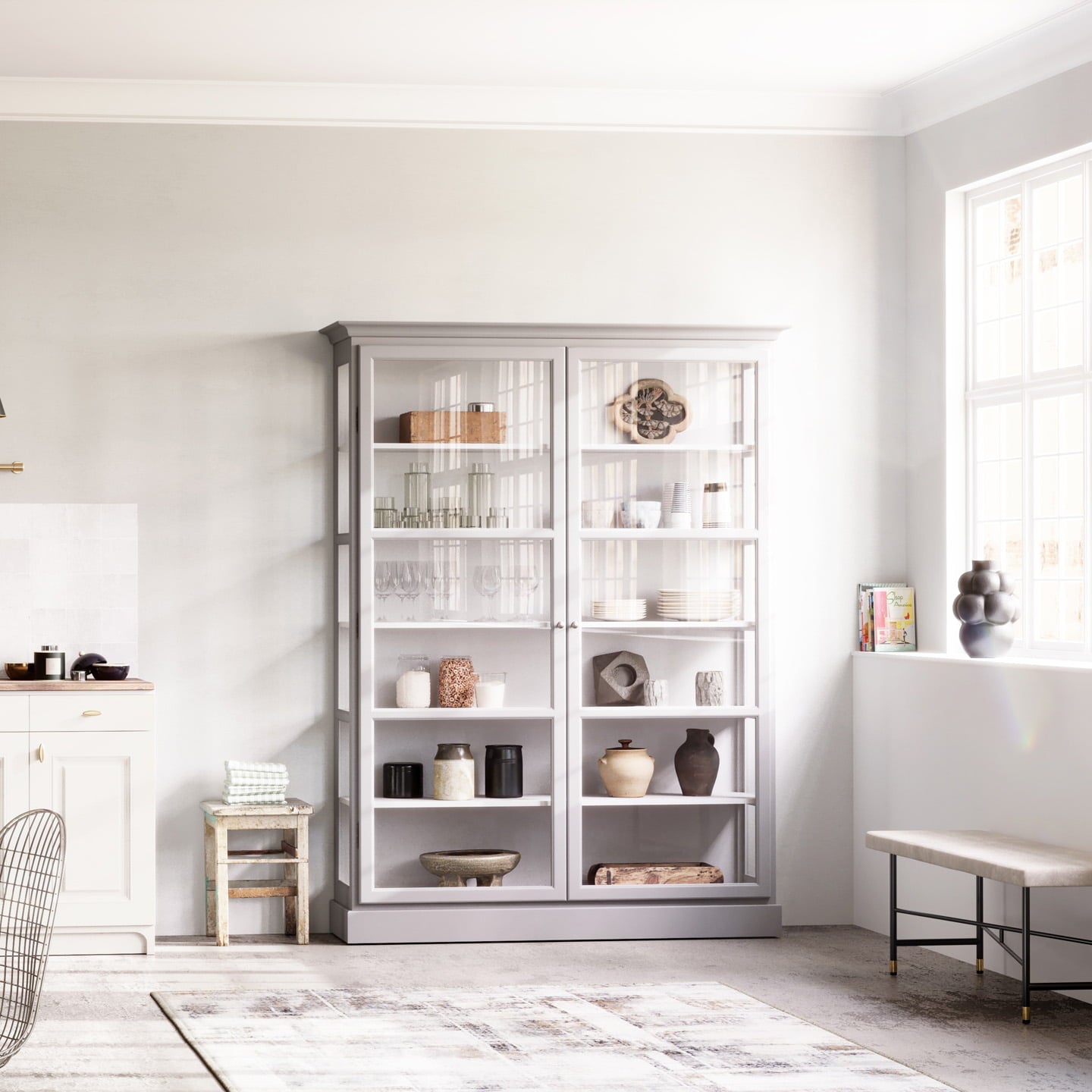 Flott dobbelt vitrineskap i malt furu og glass på sidene. Med sofistikerte detaljer fremheves et elegant uttrykk. Hengsler og håndtak i råjern. Toppprofilen trekker referanse til det tradisjonelle designet, som gjør vitrineskapet til en klassiker innen nordisk design. Vitrineskapet har et tidløst og klassisk utseende og passer inn i det moderne hjemmet.