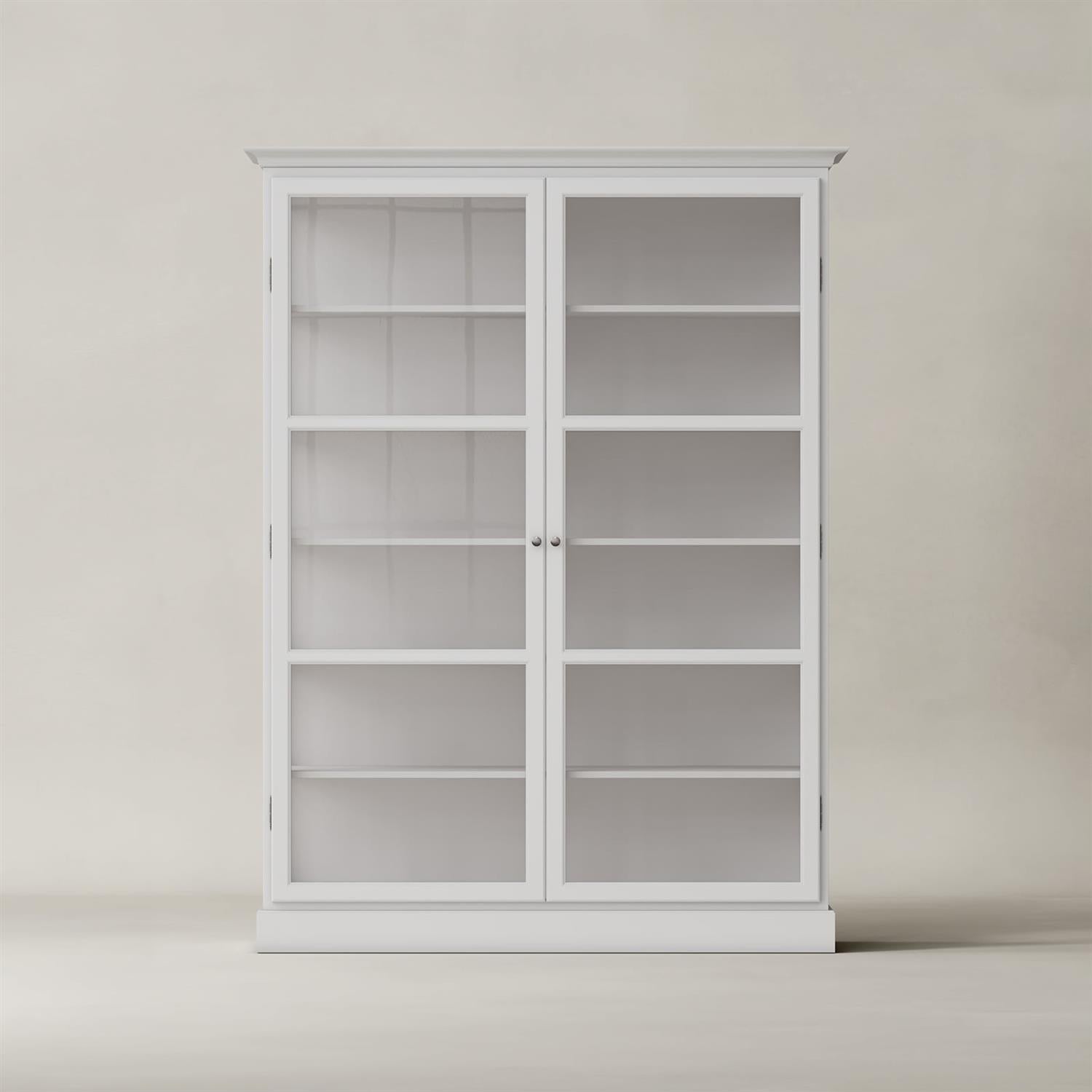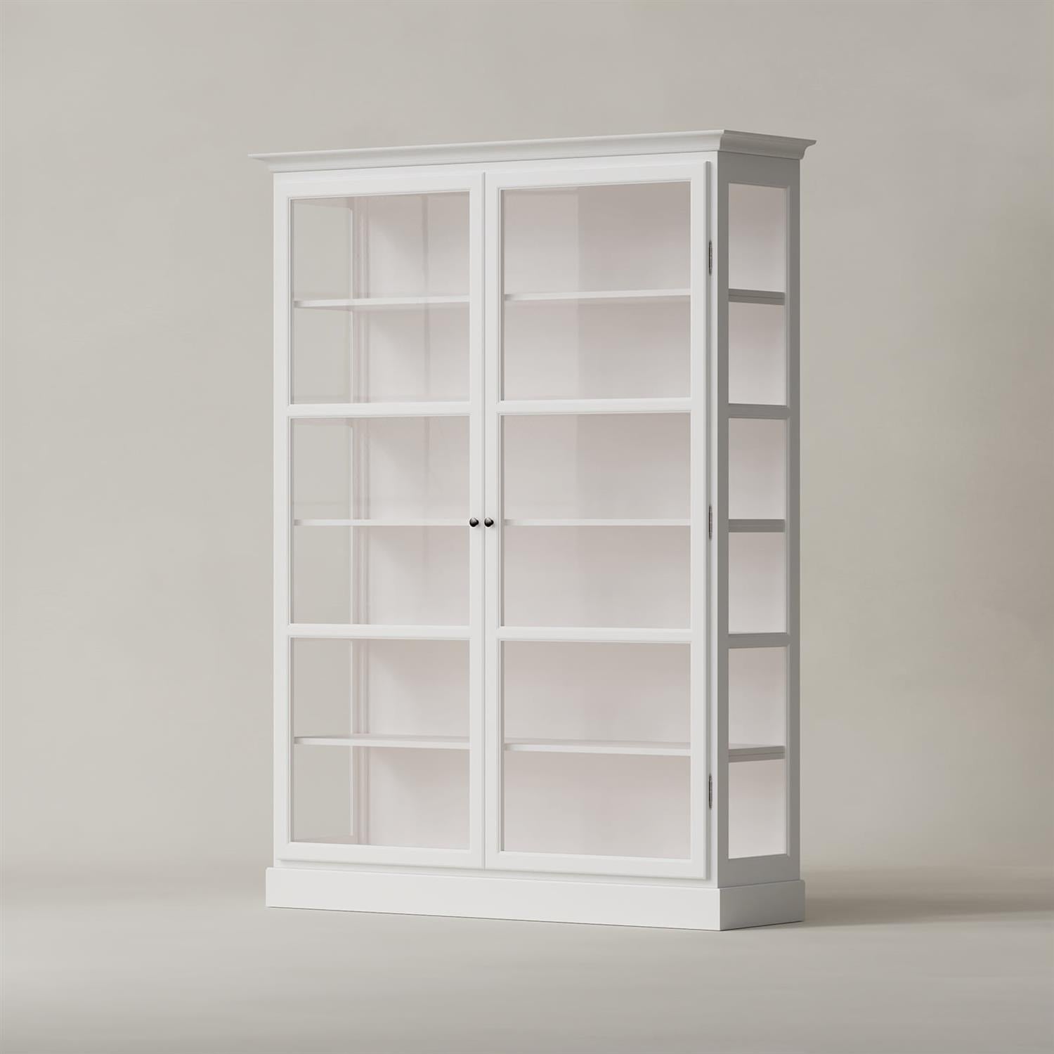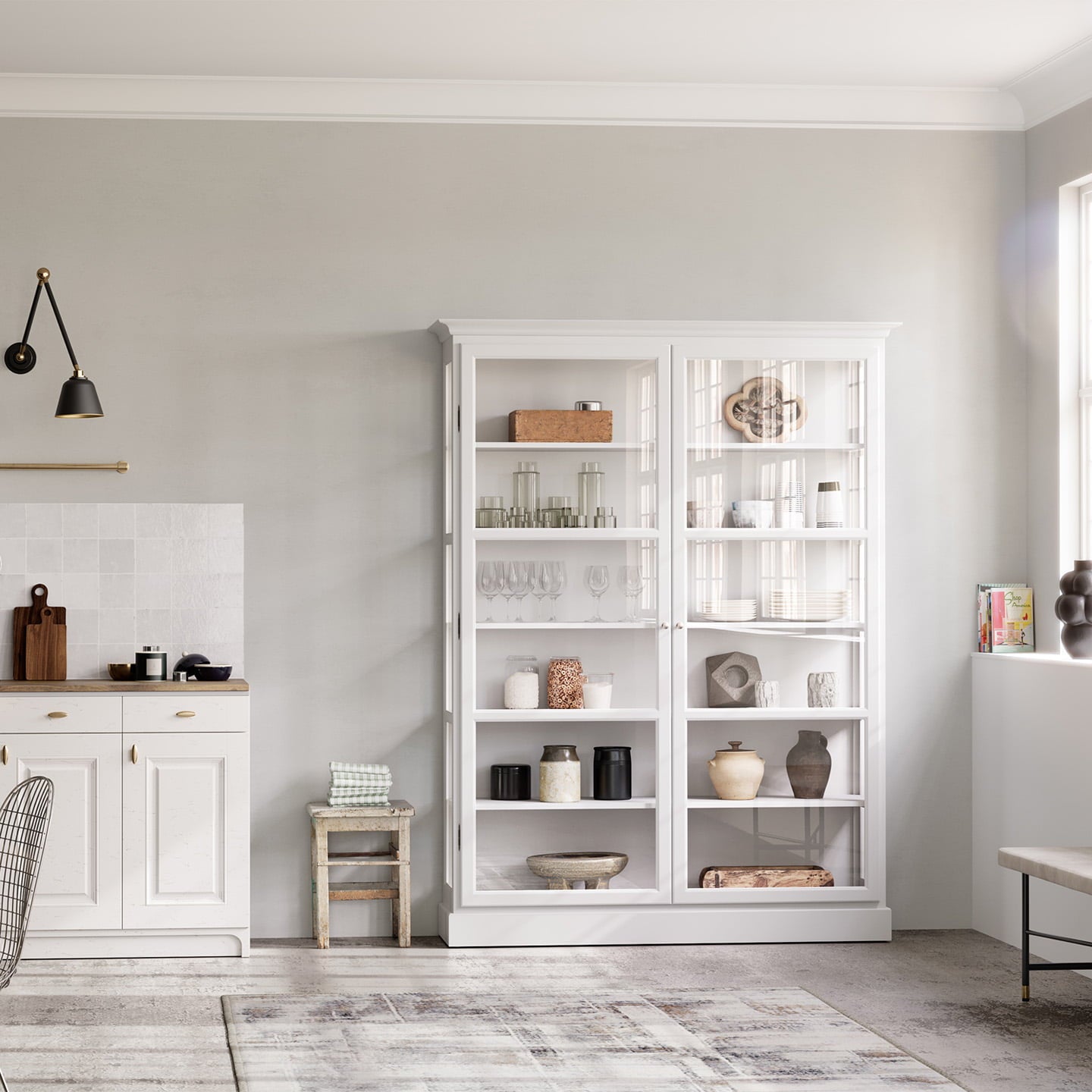 Flott dobbelt vitrineskap i malt furu og glass på sidene. Med sofistikerte detaljer fremheves et elegant uttrykk. Hengsler og håndtak i råjern. Toppprofilen trekker referanse til det tradisjonelle designet, som gjør vitrineskapet til en klassiker innen nordisk design. Vitrineskapet har et tidløst og klassisk utseende og passer inn i det moderne hjemmet.