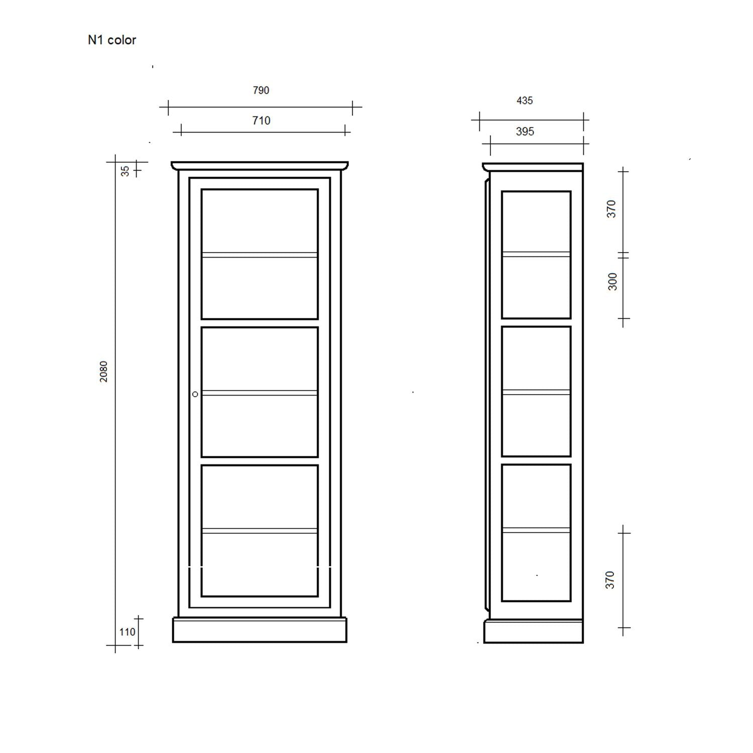 Color N1 er utformet i en koordinert tone som gir vitrineskapet en kant. I kombinasjon med vitrinens rene linjer passer fargen godt med den skandinaviske interiørstilen, hvor det lekes med farger og kontraster. Skapet er laget av massiv furu med messinghengsler og håndtak.