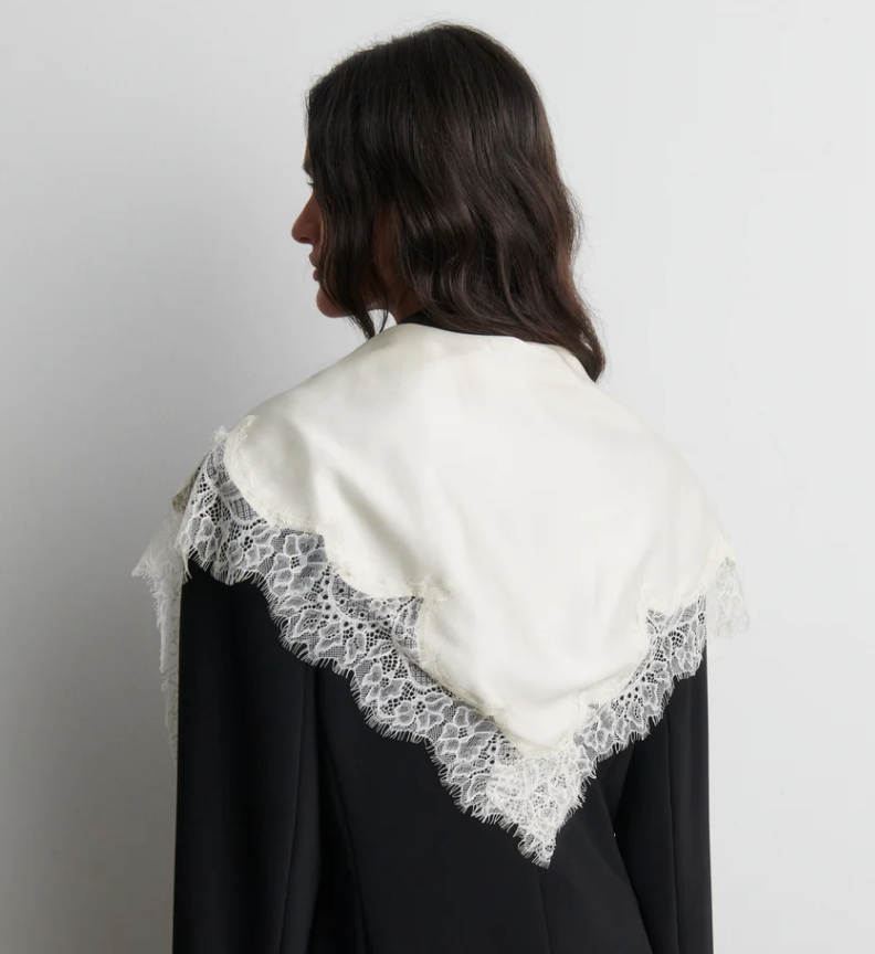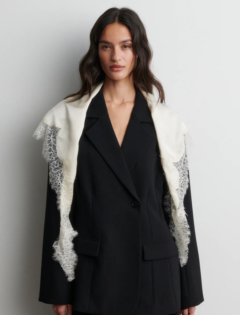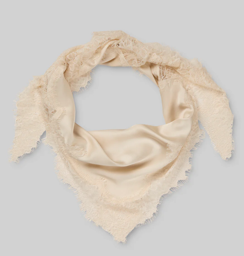 Multifunksjonelt blondeskjerf fra Second Female. Skjerfet er laget i en silkemyk viskose-EcoVero-blanding med gjennomsiktige blondekanter i alle kanter. Kan f.eks. stylees rundt halsen, midjen, hodet eller håret.