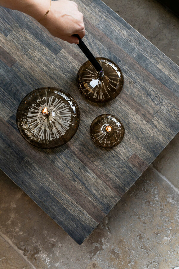 Opplev varm, organisk glød fra vår elegante Oljelampe i farget glass og messing. Håndverk møtes med moderne enkelhet, og lampen sprer lyset elegant over bordet. En liten lampe med stor atmosfære - perfekt som bordbelysning, ved festlige middager eller som et elegant høydepunkt i stuen. Kombiner flere størrelser for harmoni, eller la én lampe være et subtilt, men effektfullt midtpunkt.