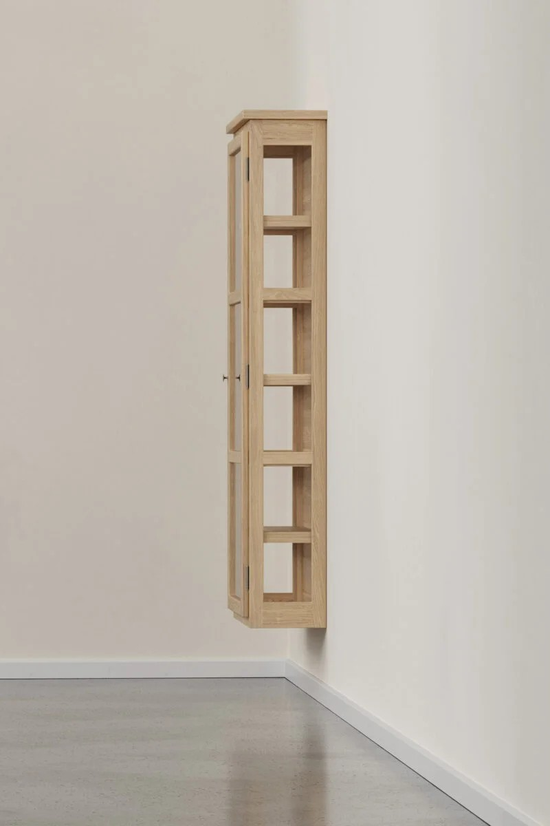 N4 Light Oak er et veggmontert vitrineskap. Skapet er laget av lys massiv eik med en matt lakkert overflate. Resultatet er en tekstur og varme som fremhever den fine trestrukturen. N4 Light Oak er designet med en forenklet toppprofil og messinghengsler og håndtak.