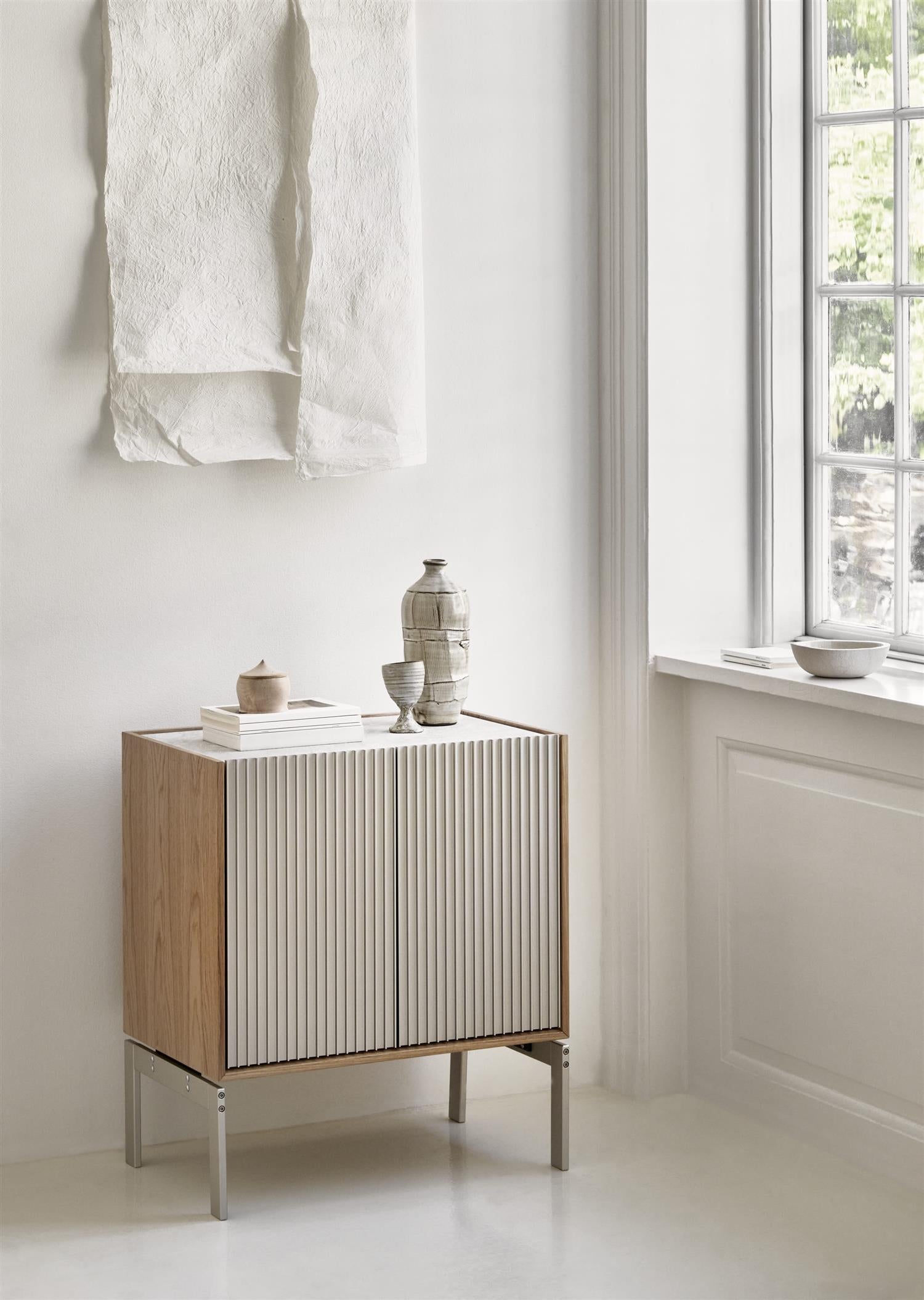 Dette H2-skapet er like allsidig som det er skulpturelt, ideelt som nattbord, oppbevaringsobjekt i gangen eller som sidebord i sofaen. Liten i størrelse, men rik på taktilitet, og er produsert i en trio av høykvalitetsmaterialer – marmor, anodisert aluminium og eik.