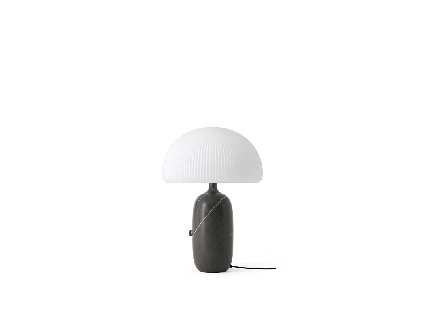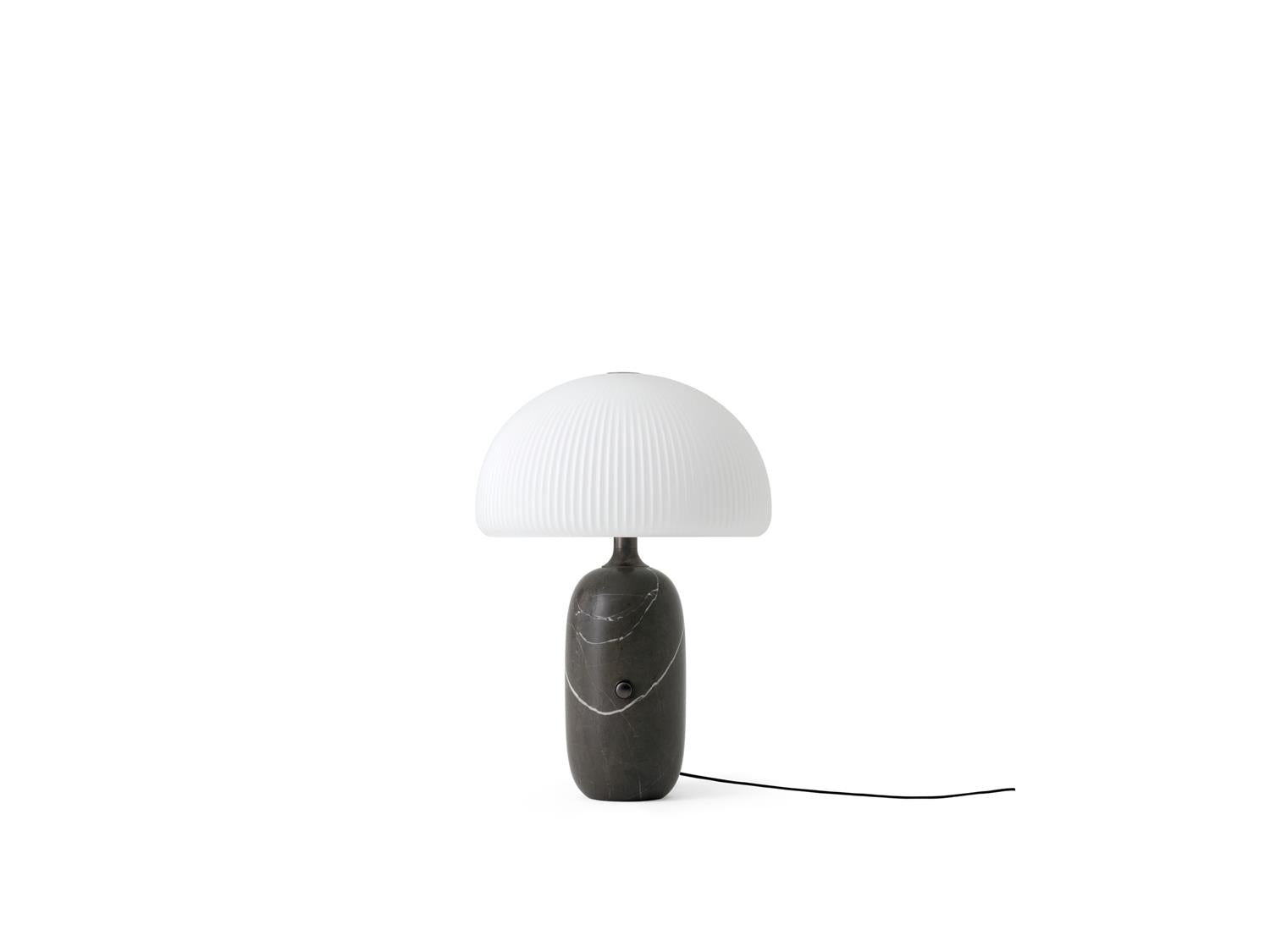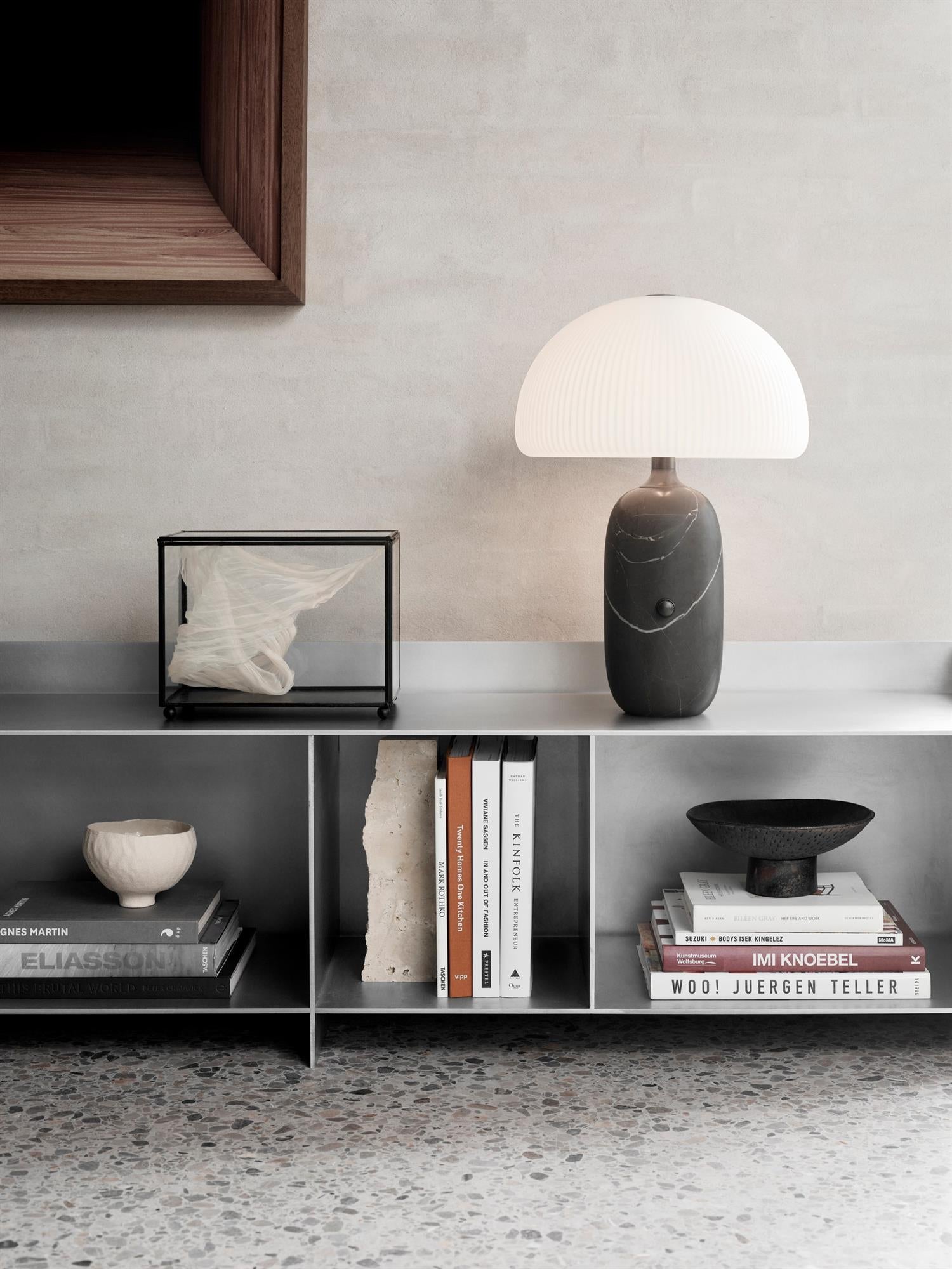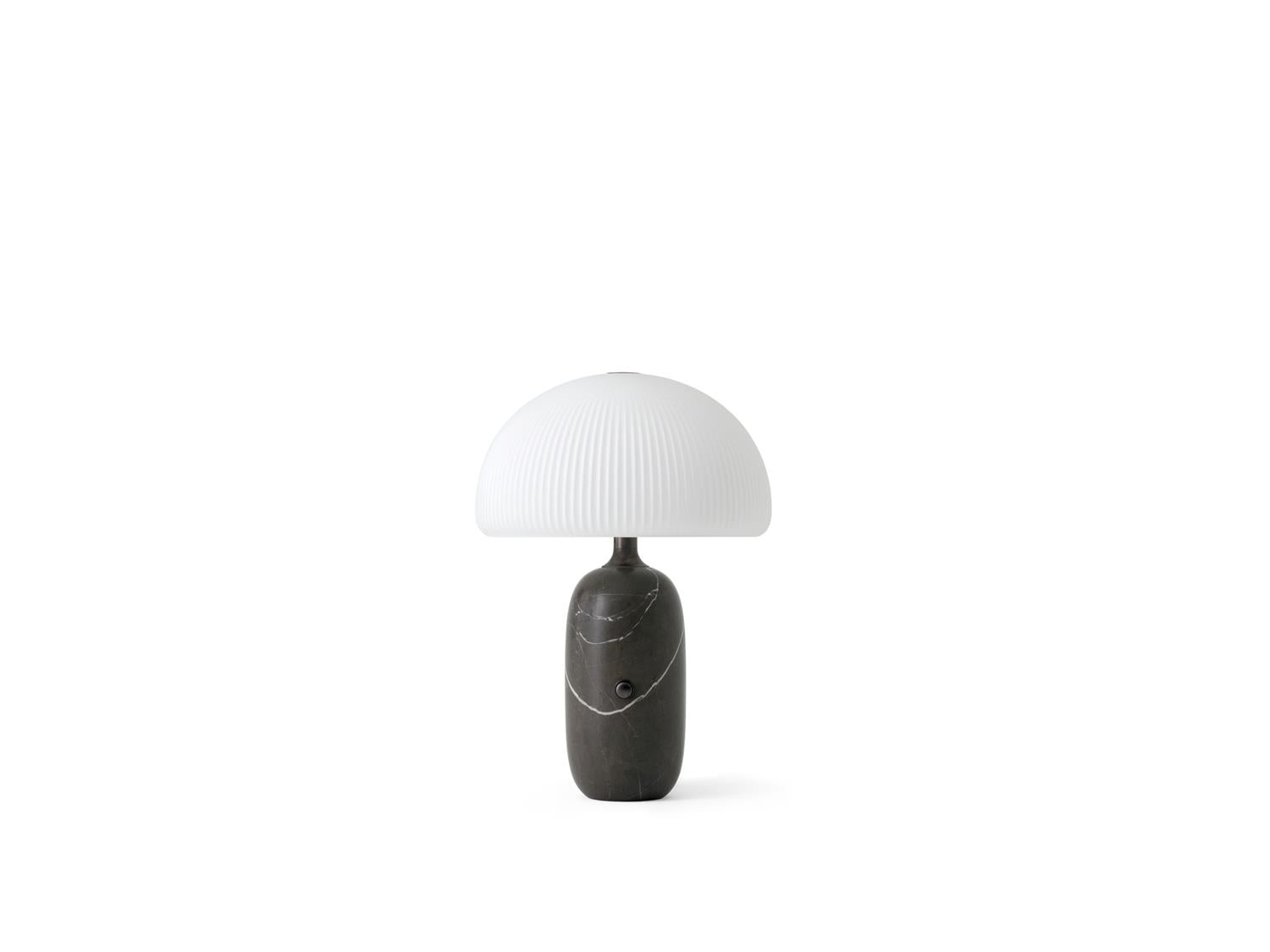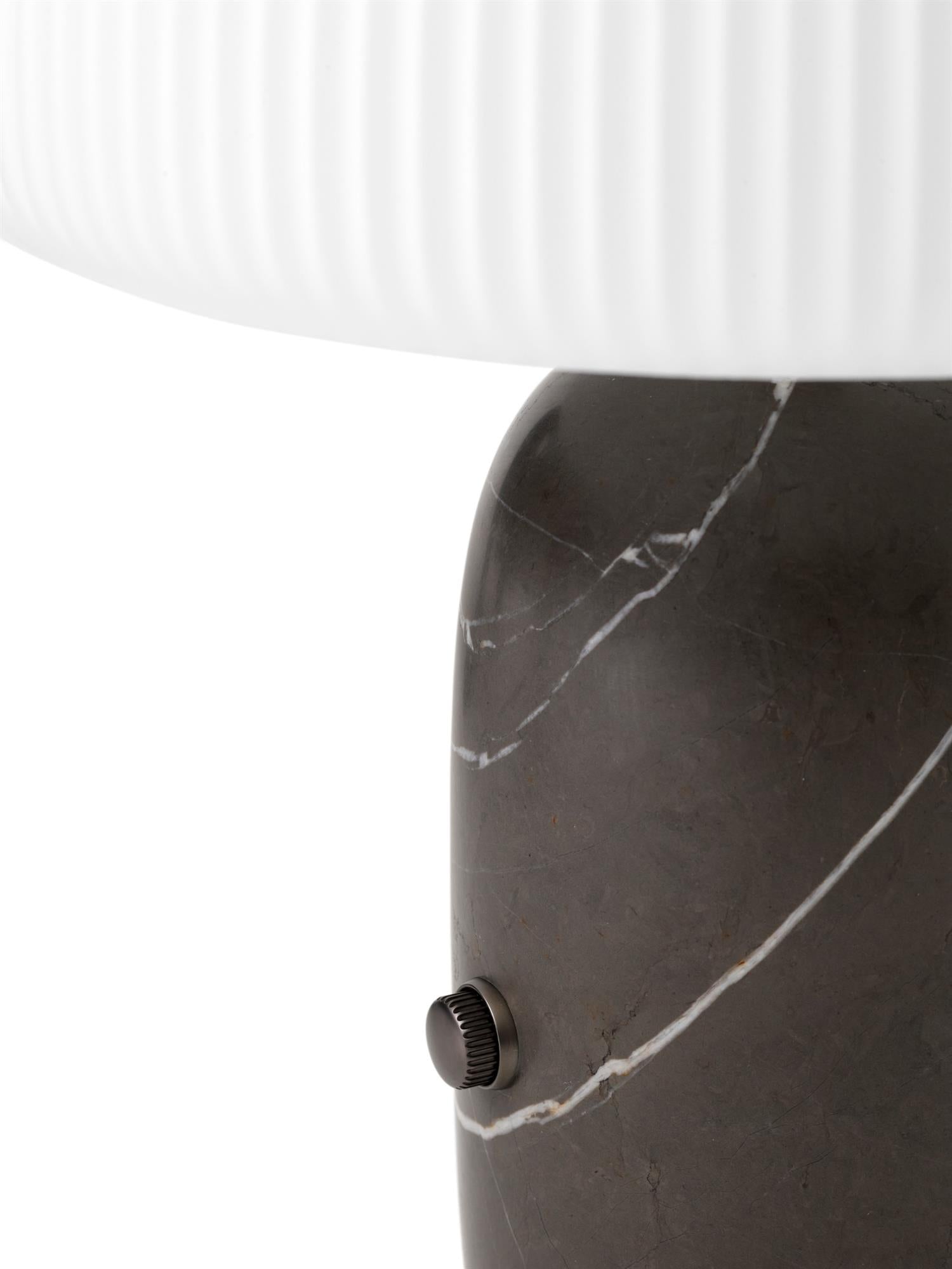 Vipp Sculpture-bordlampen er ideell som dekorativ belysning, egnet for stue eller soverom. En slitesterk LED-enhet er skjult under en trelags opalglassskjerm, som gir en koselig belysning. Den runde sylinderbasen i enten grå eller hvit marmor har en dimmerbryter og en stofftrukket ledning.