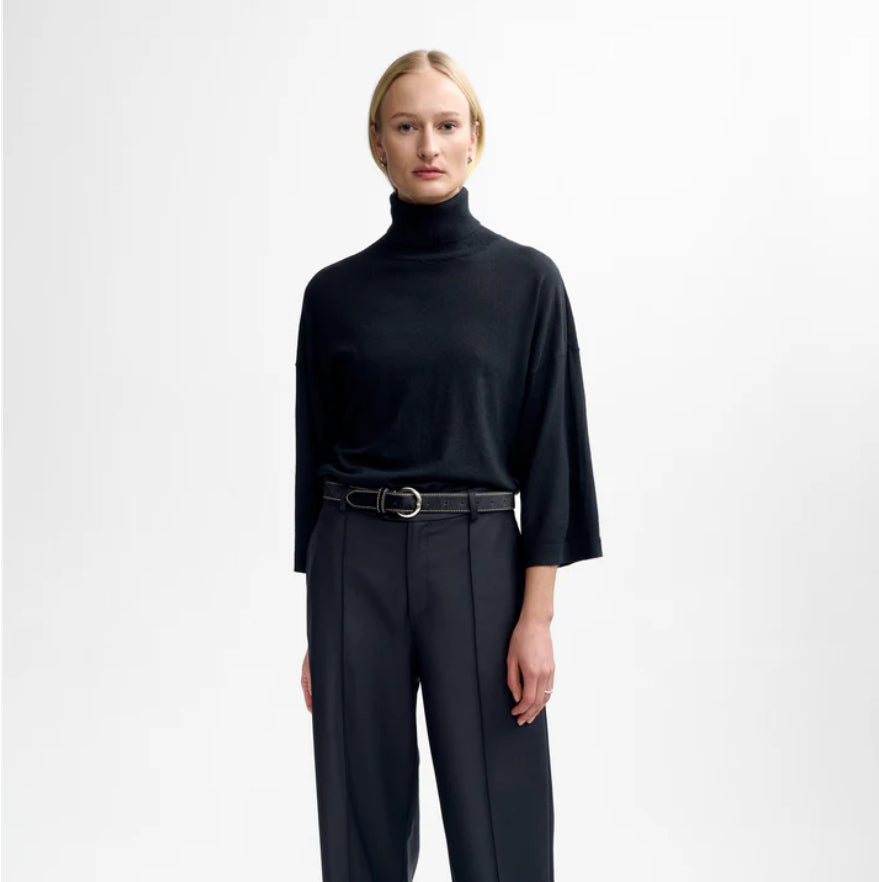 Tia merinoull er strikket i supermyk, fin merinoull. Passformen er rett, firkantet med løse ermer over albuen og en klassisk polokrage i fin ribbestruktur.