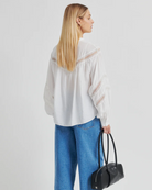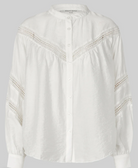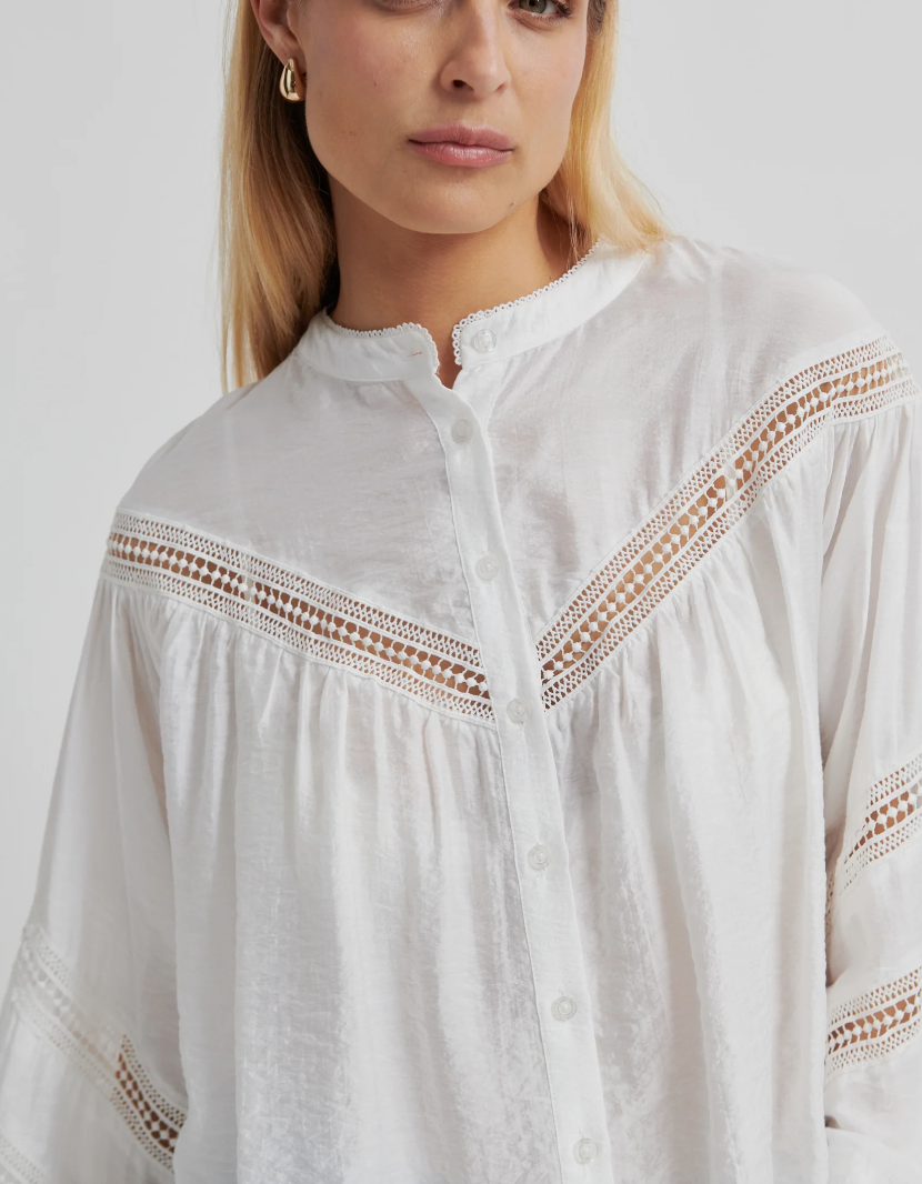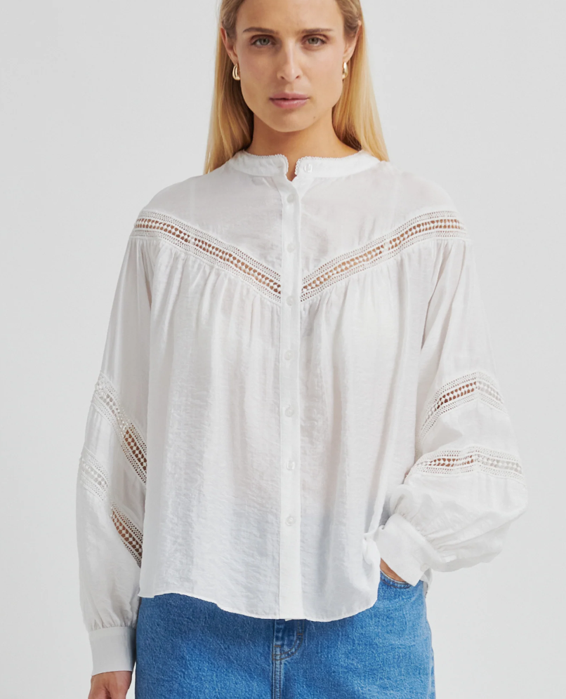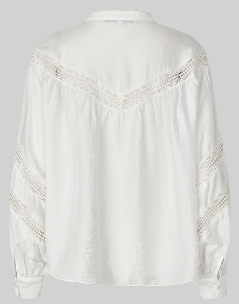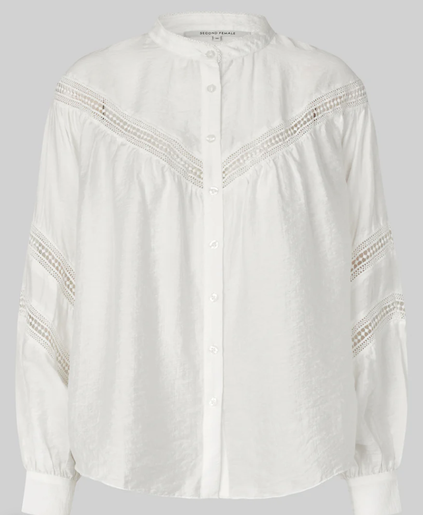 Second Female bluse med blonder. Blusen er laget i krøllete stoff med skinnende kvalitet. Med en liten rund krage og knappelukking. Gjennomsiktige blondepaneler på kroppen og ermene. Puffermer med knapper i mansjettene. Løs og luftig passform.