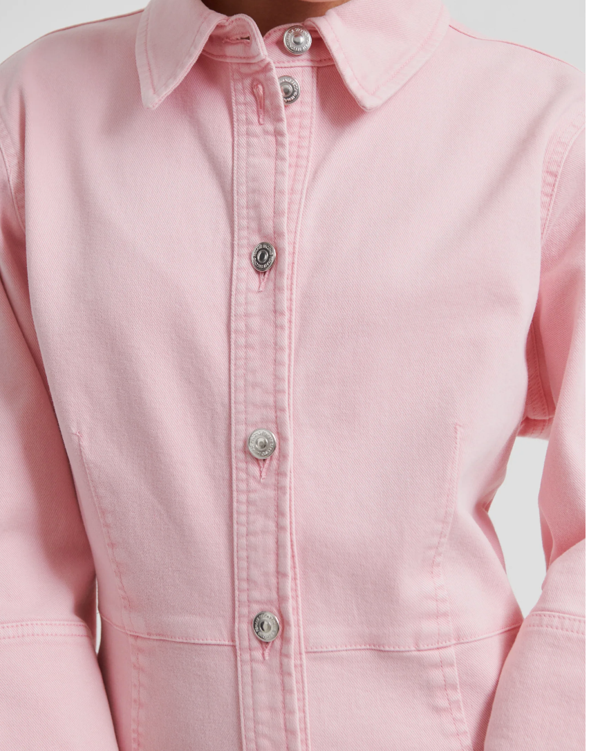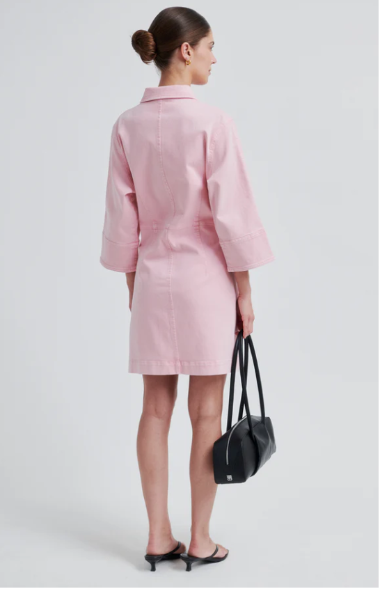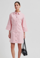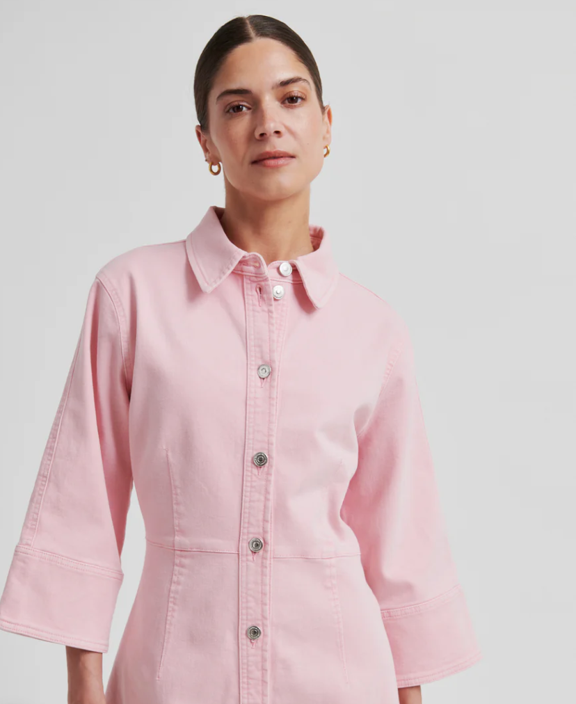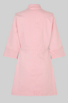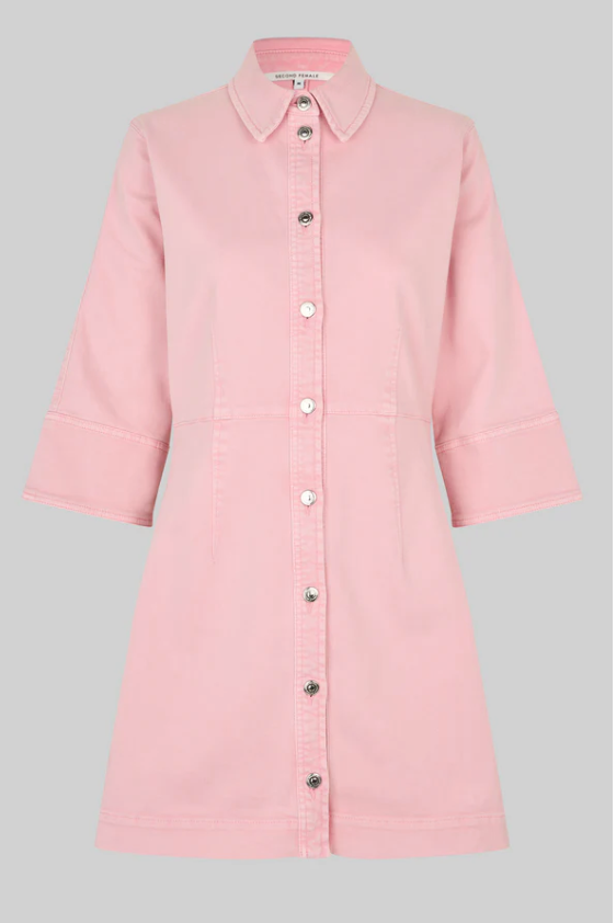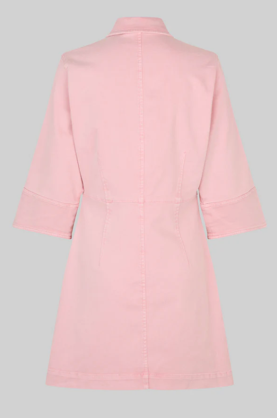 Second Female rosa denimkjole. Kjolen er laget i myk bomullsdenim med ton-til-ton-søm. Har vanlig krage, metallknapplukking og trekvartlange ermer. Tilpassede sømmer foran og bak for en tettsittende passform.