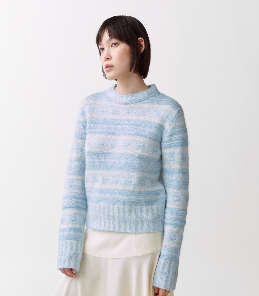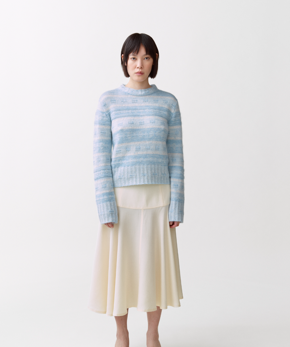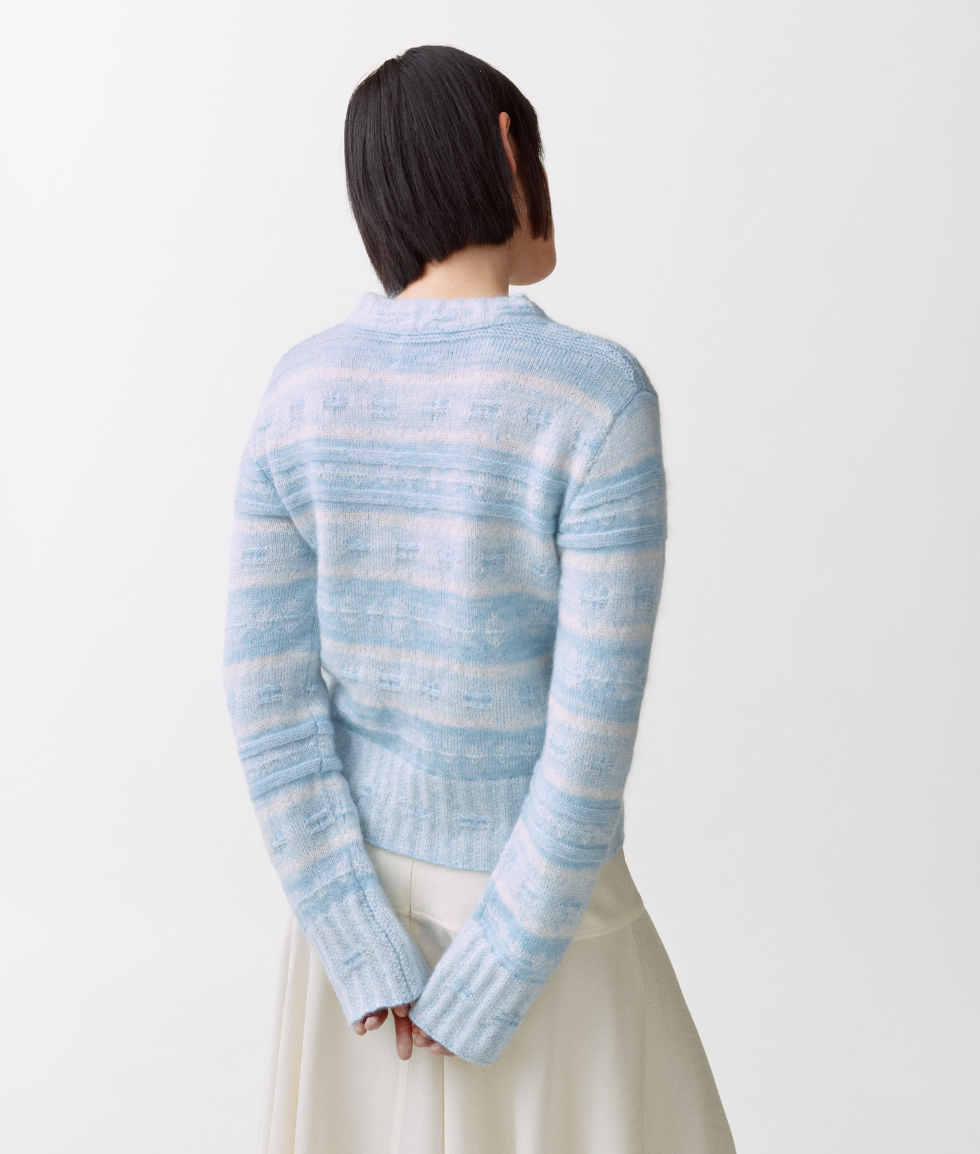 Inspirert av norske tradisjonsmønstre. Nå omtenksomt tolket for sommersesongen, holder den seg tro mot tradisjonsmønsteret, men er strikket i lettere garn, noe som gir den en luftig følelse – perfekt for varmere dager. Laget av fin merinoull, kid mohair og silke.