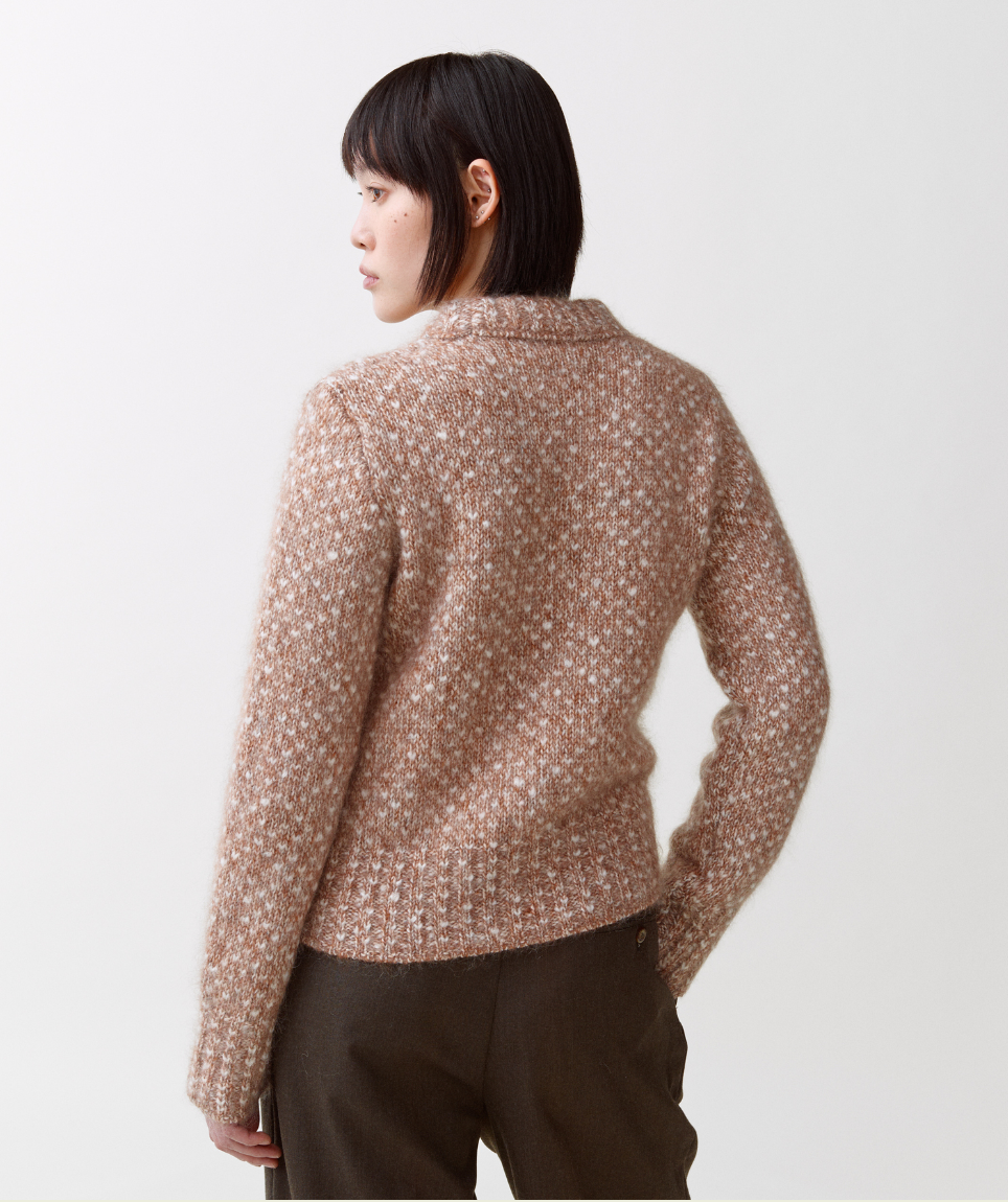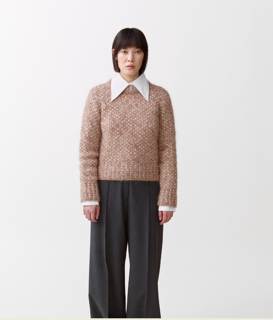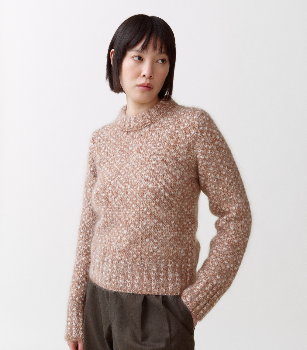 Ole No. 3 er en damegenser med rund hals inspirert av norske mønstre. Den kraftige strikken har en uregelmessig struktur med variasjoner i farge og tekstur, noe som skaper en følelse av dybde gjennom hele plagget. Laget av fin merinoull, super kid mohair og silke, med mohairgarn som gir en lett og luftig følelse. Laget i Italia.