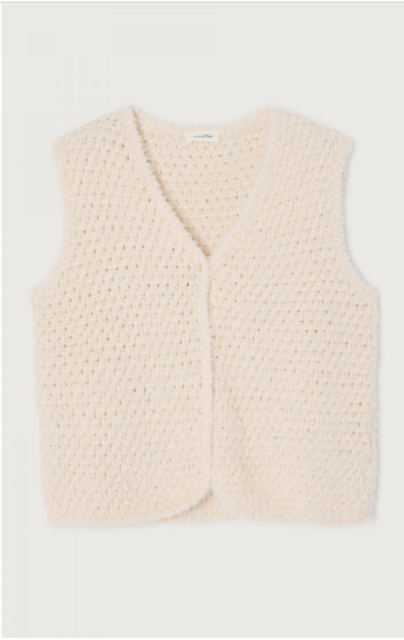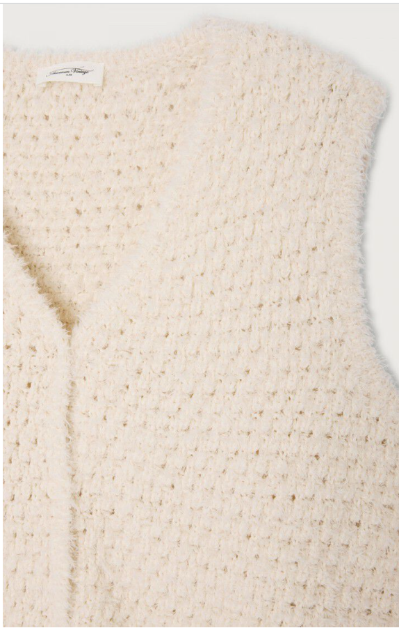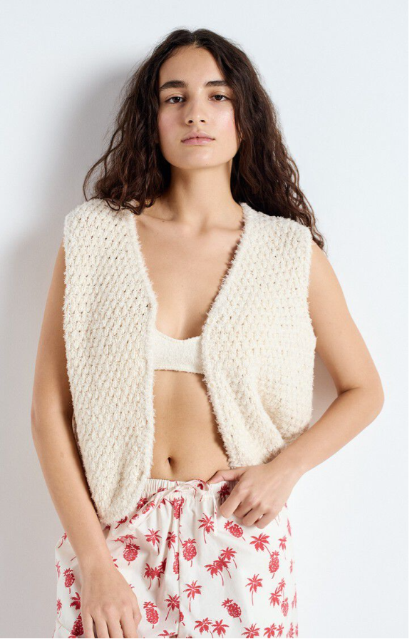 Ermeløs, rett cardigan med V-hals og mellomlang lengde.