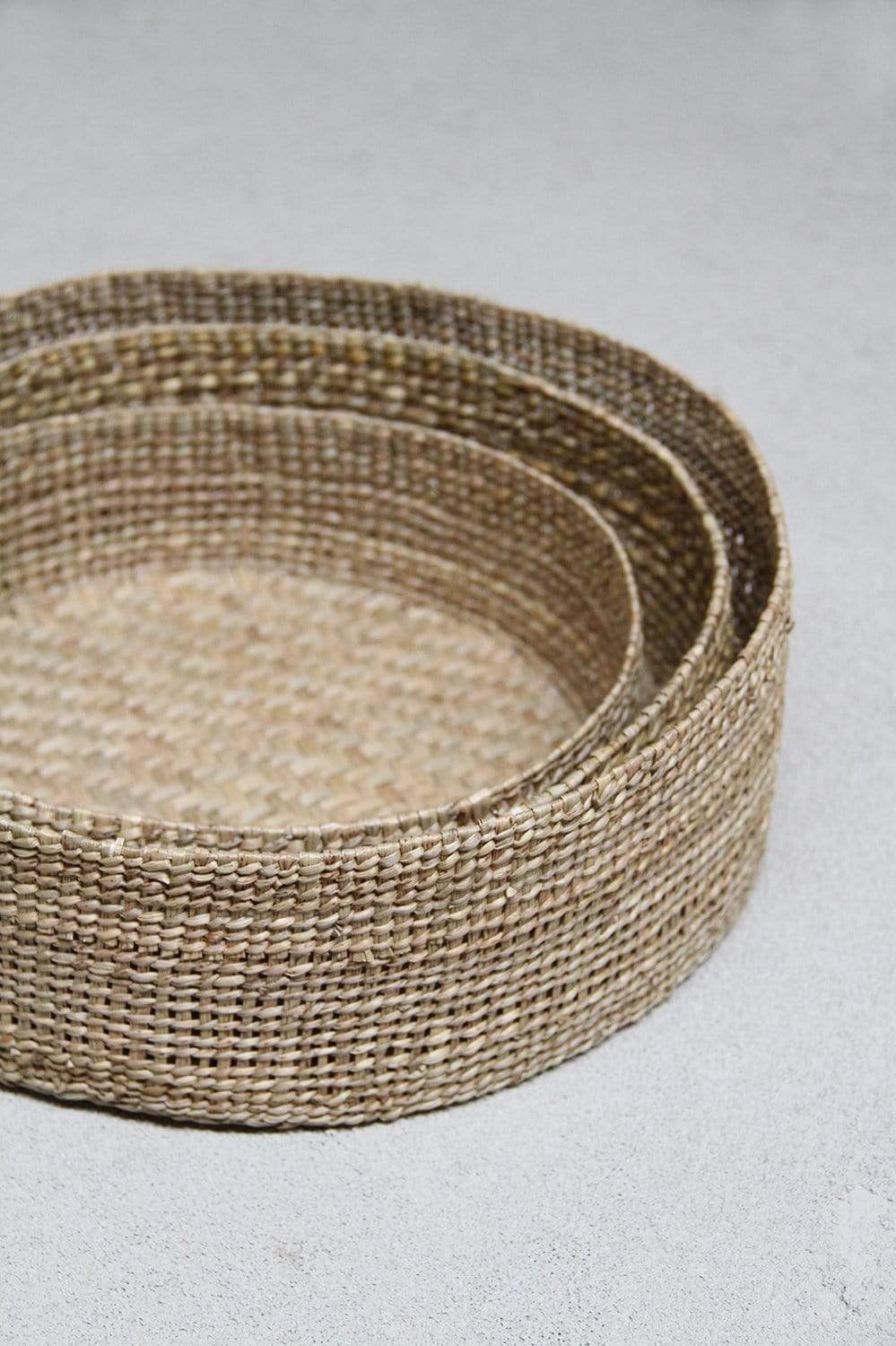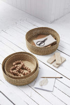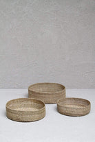 Trioen med runde gresskurver er en naturlig måte å samle og oppbevare eiendelene dine på, samtidig som de introduserer vevd tekstur i hjemmet. Disse lette kurvene er håndvevd av pathi-gress og er ideelle å bruke som oppbevaringsplass i hele hjemmet; som oppbevaring på soverommet, badet eller lekerommet.