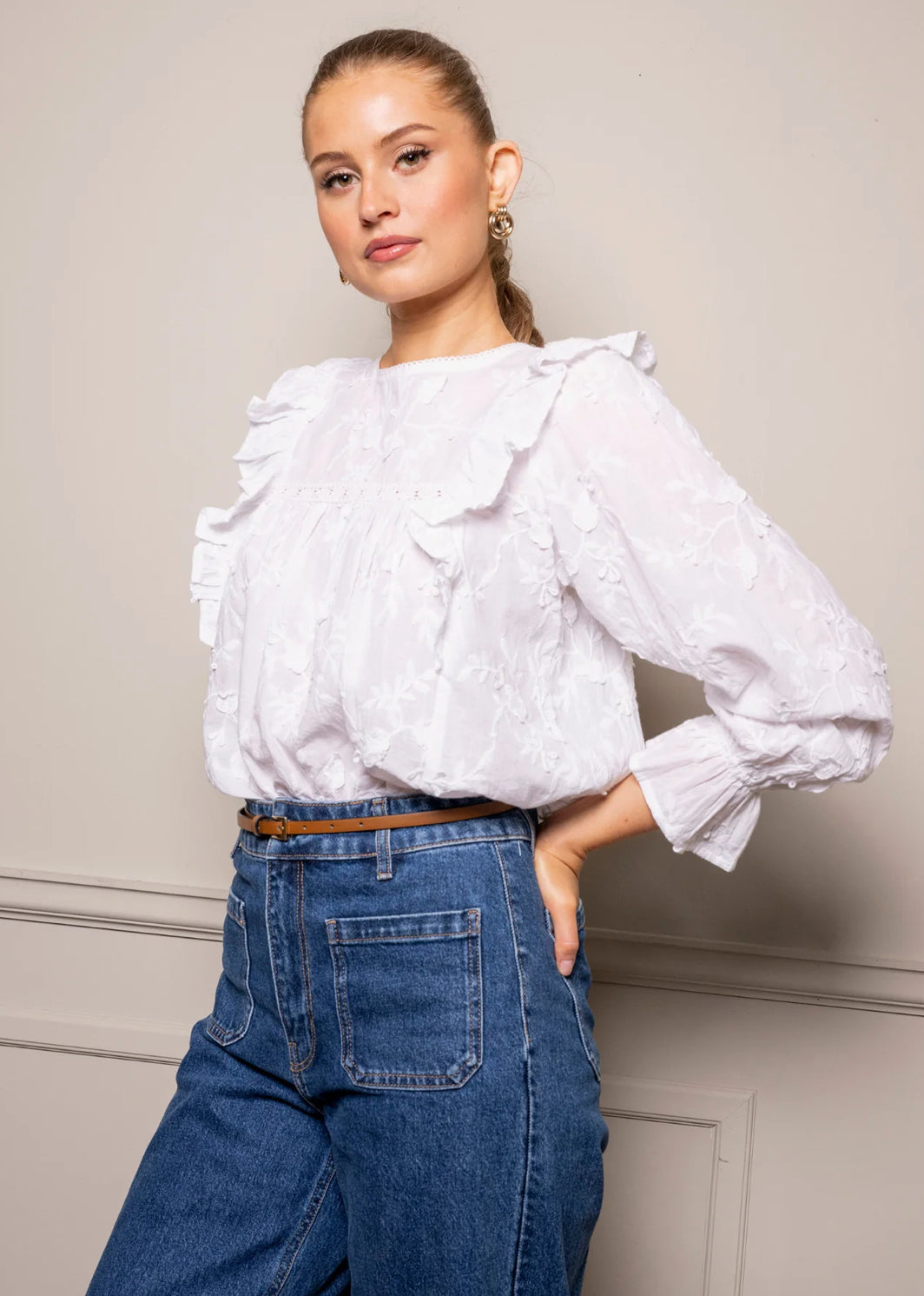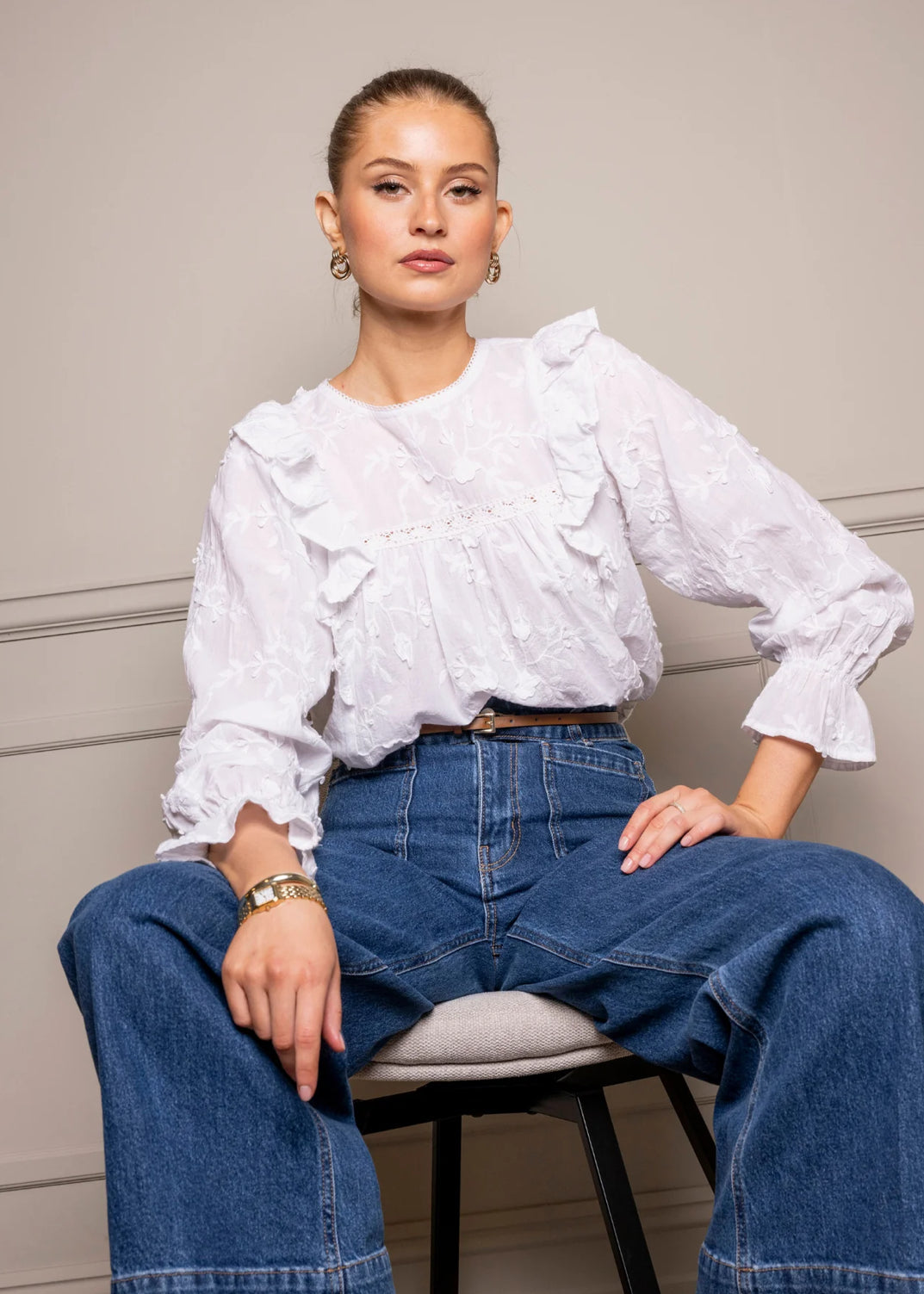 The Amara Top is cut in 100% cotton quality. The blouse has a round neckline and buttons in the back, long voluminous sleeves with tight cuffs and rouching details. The blouse has beautiful 3D flowers that makes it very unique.