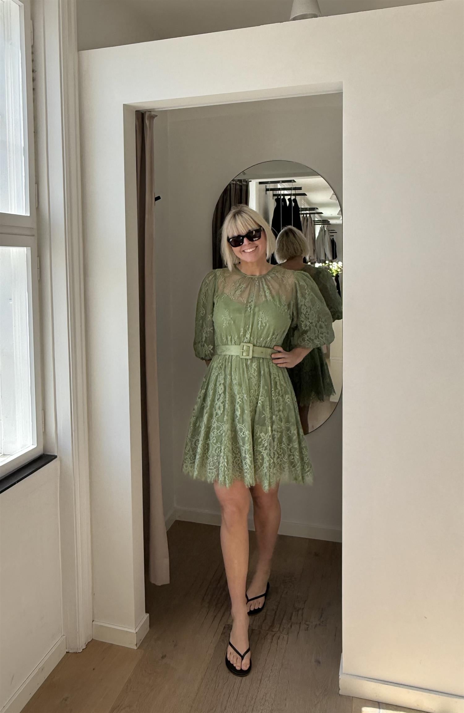 The Delicate Lace Mini Dress is cut in our fine, delicate nylon fabric, decorated with an elegant floral pattern. The dress has a mini length, adjusted top, A-shape skirt, round collar, short puffed sleeves with elastic cuffs. The dress comes with a loose, matching belt. It has a slit detail in the back and a button that can be attached in the back of the neckline.
