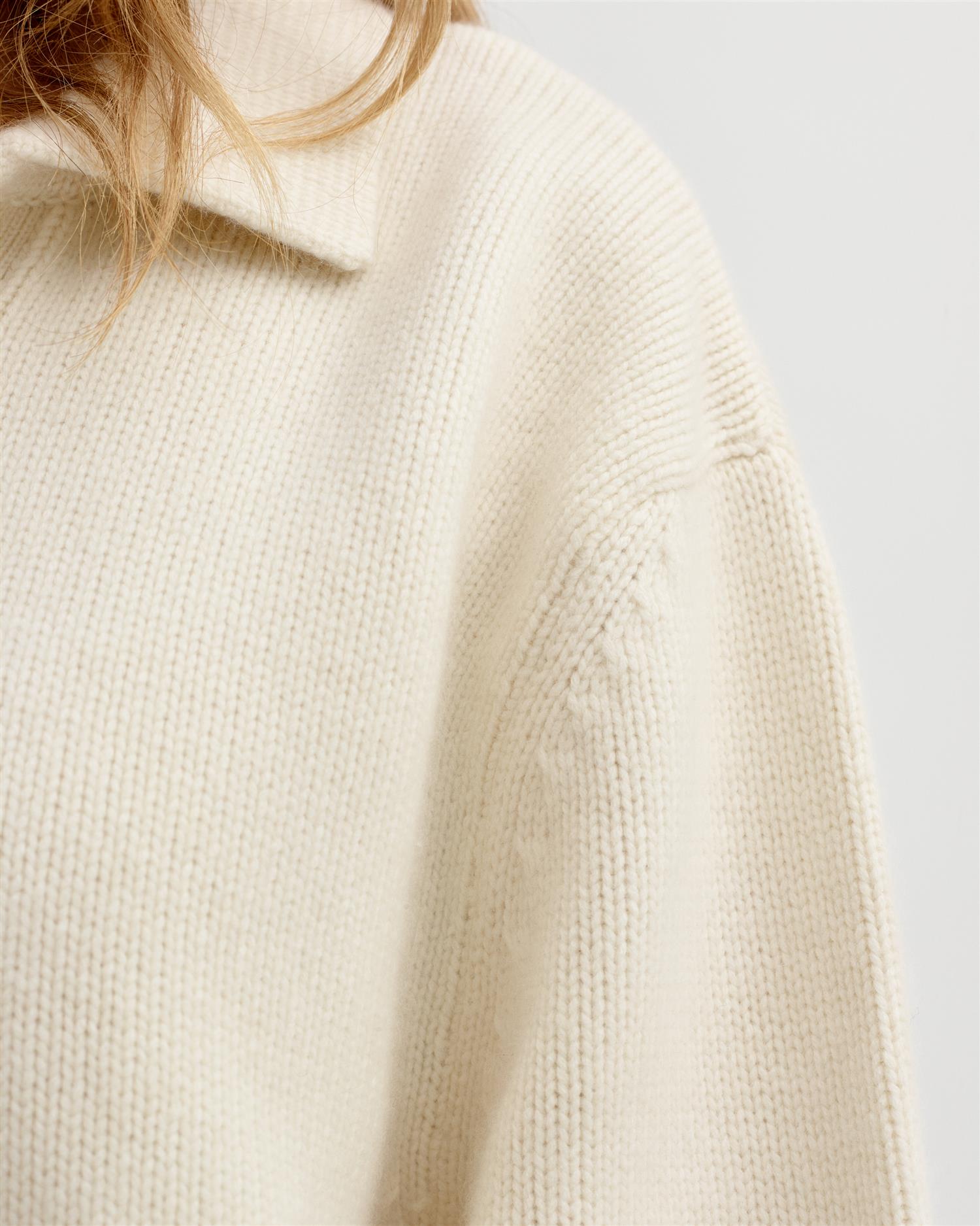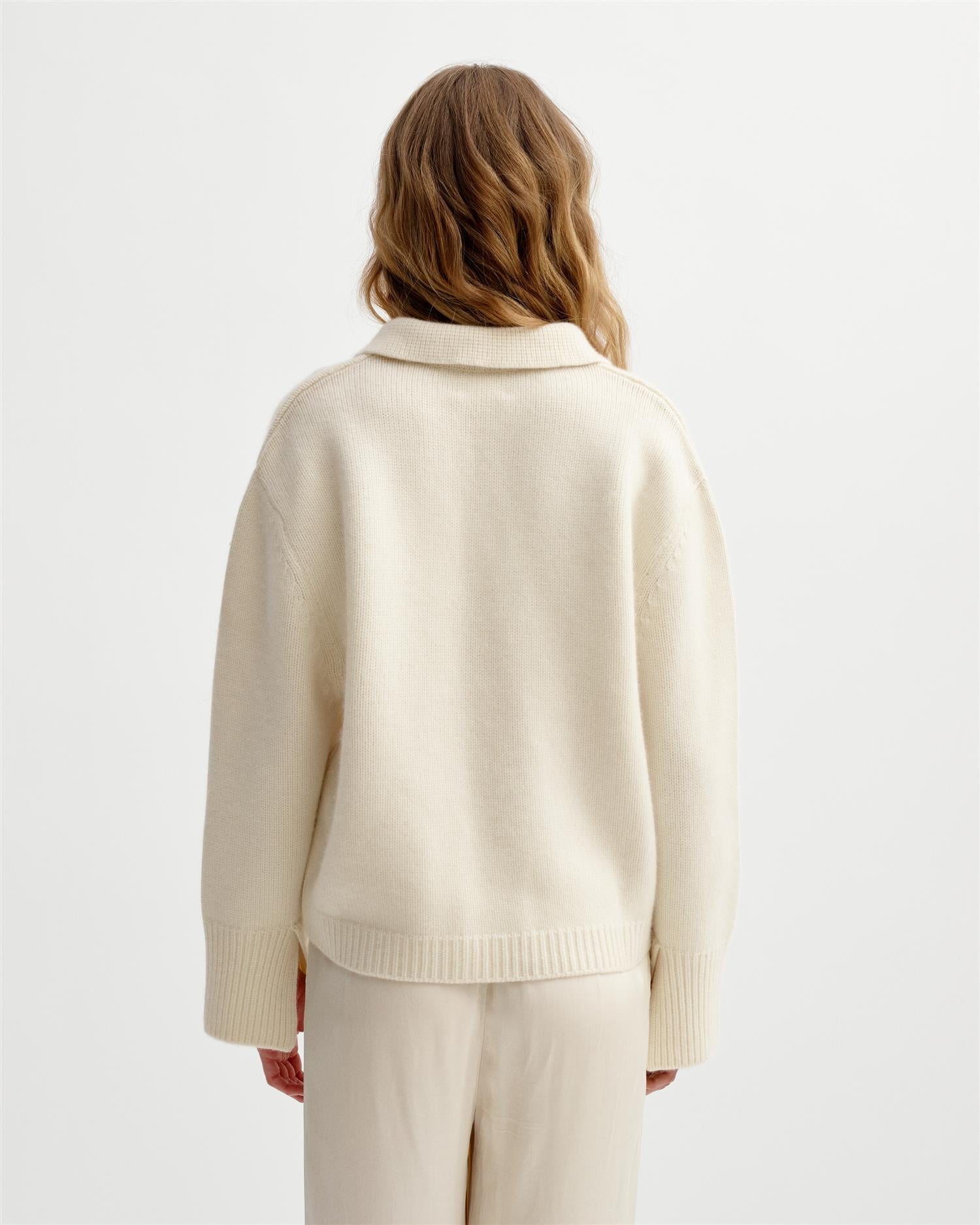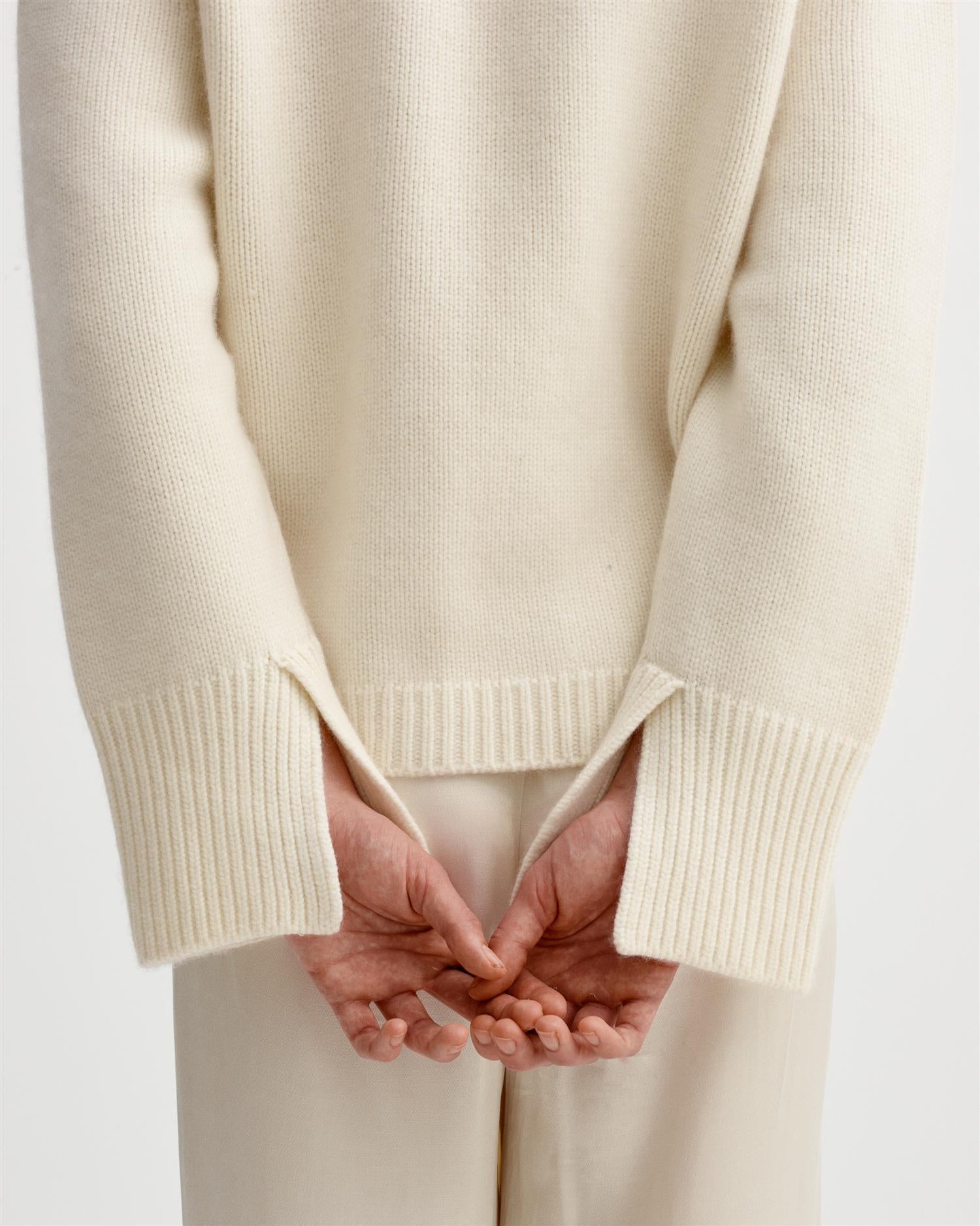 Denne genseren er kjærlighet ved første berøring. Laget i 100% cashmere og tydelig børstet for en myk, luksuriøs finish som kjennes som en varm omfavnelse mot huden. Den kremfargede nyansen gir et tidløst, anvendelig uttrykk som enkelt kan styles opp eller ned.