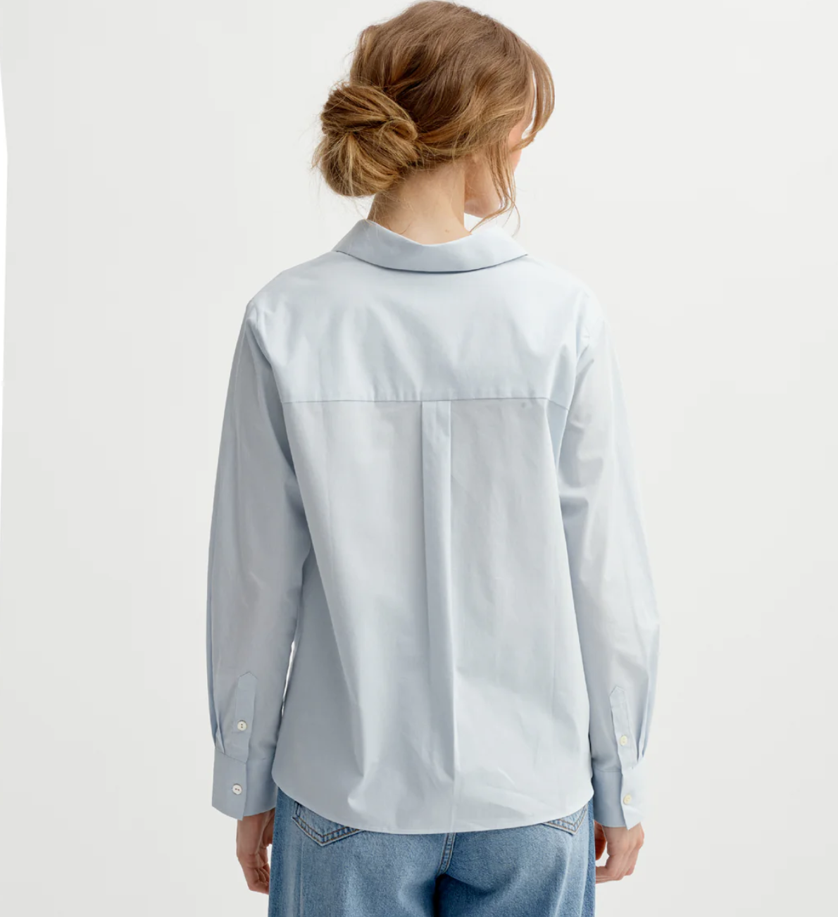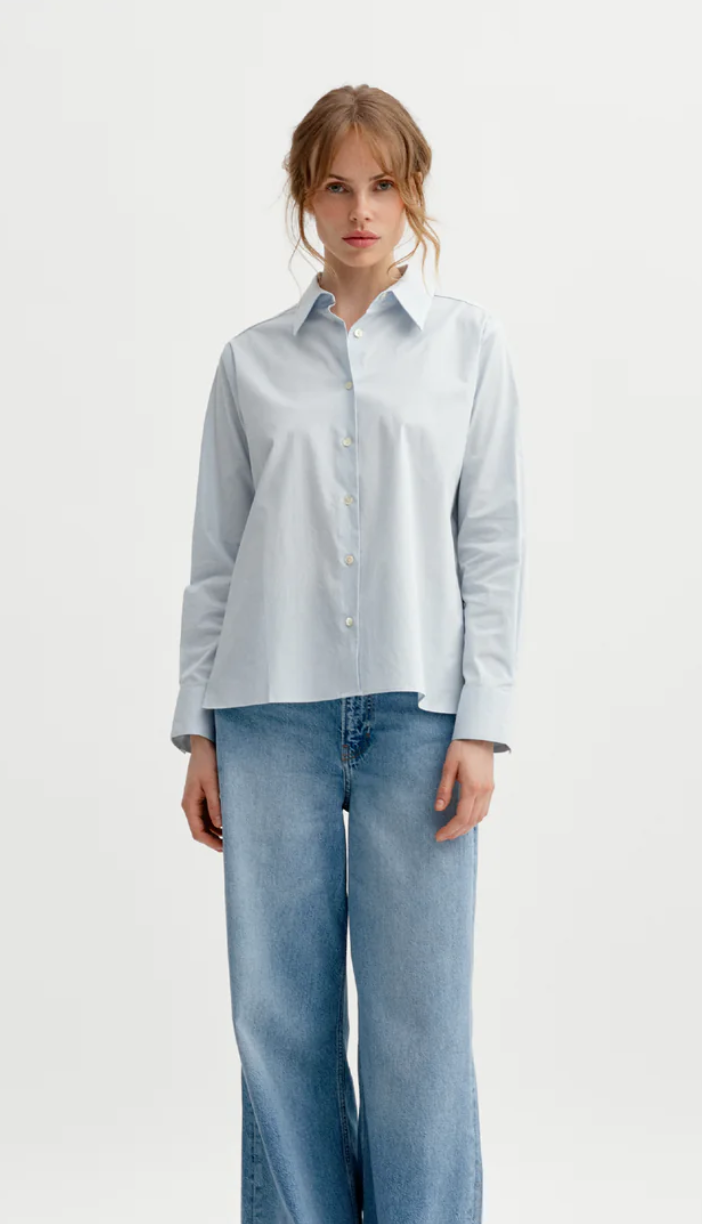 Lyon-skjorten er der tidløs skreddersøm møter moderne letthet. Laget av 100 % økologisk bomull og avsluttet med diskré perlemorknapper, gir den et diskré preg av luksus for hverdagsbruk. Den litt avkortede lengden og den myke A-linjeformen gir den en flatterende, feminin silhuett som fungerer like bra gjemt i bukser som løstsittende med denim. En allsidig basisplagg du vil bruke igjen og igjen – skarp, klassisk og bare litt leken.