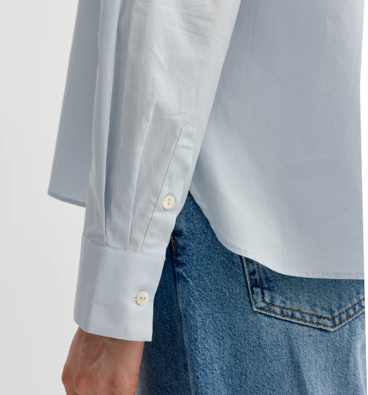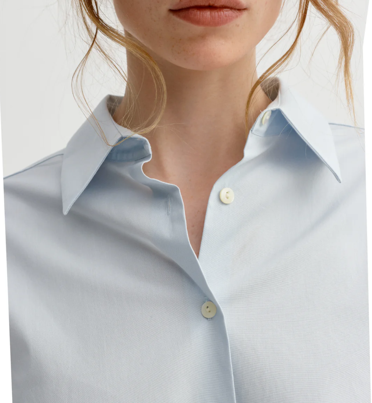 Lyon-skjorten er der tidløs skreddersøm møter moderne letthet. Laget av 100 % økologisk bomull og avsluttet med diskré perlemorknapper, gir den et diskré preg av luksus for hverdagsbruk. Den litt avkortede lengden og den myke A-linjeformen gir den en flatterende, feminin silhuett som fungerer like bra gjemt i bukser som løstsittende med denim. En allsidig basisplagg du vil bruke igjen og igjen – skarp, klassisk og bare litt leken.