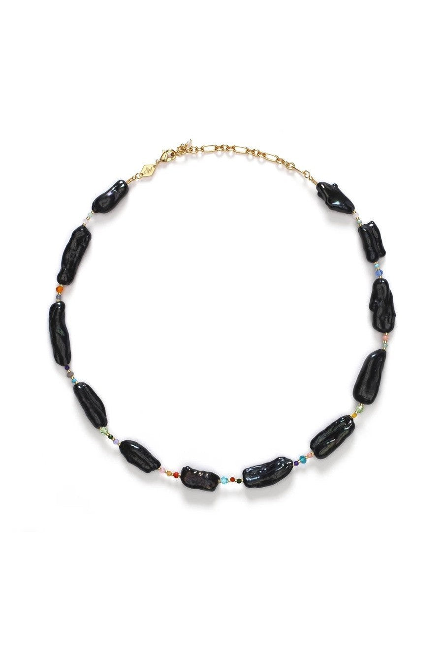 Kjeder er dekorert med rå ferskvannsperler, halvedelstener og glassperler på en 18k gullforgylt lenke. Kjedet er justerbart fra 40-46 mm.