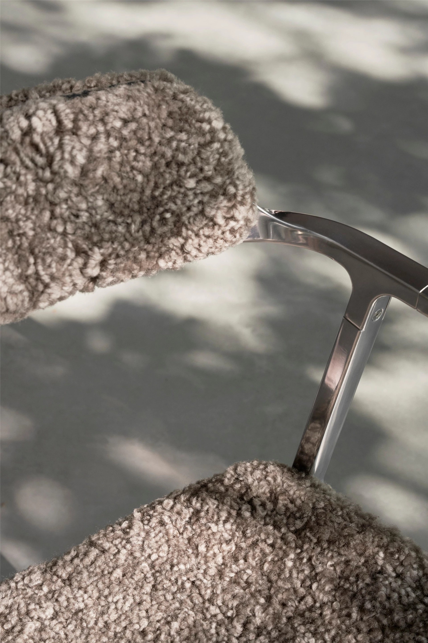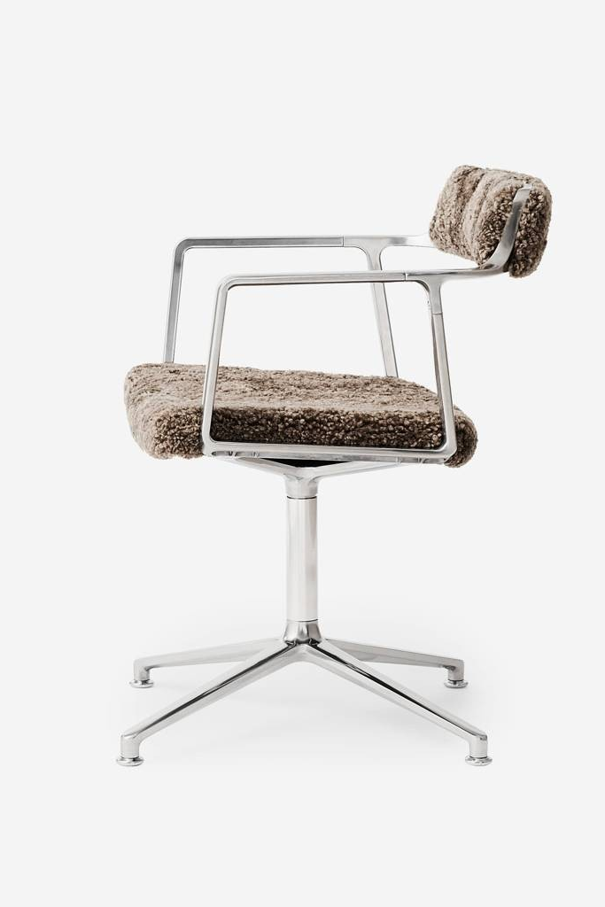En polert, slank aluminiumsramme møter tett og rikt trekk laget av mykt australsk saueskinn i spesialutgaven av Swivel chair, Curly edition. Med en fast firbent base med 360° svingfunksjonalitet i polert aluminium, matcher Swivel-stolen det samme holdbare håndverket, tidløse designet og oppmerksomheten på detaljer som finnes gjennom Vipps historie med støpt metall siden 1939.