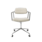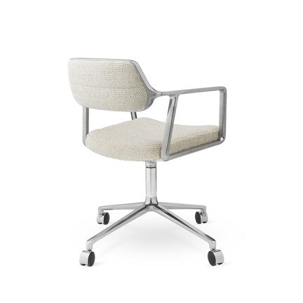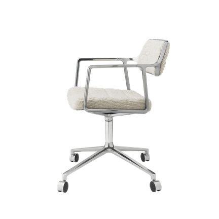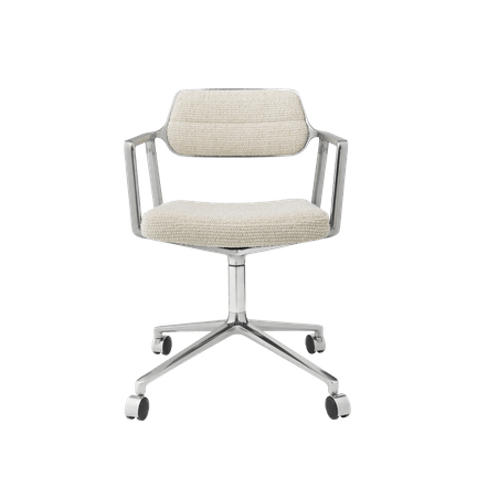 Vipp presenterer en ekstra polstret, høydejusterbar iterasjon av sin velkjente Swivel-stol. Beregnet for hjemmekontor og konferanserom. Swivel+-stolen tilbyr en større ryggstøtte og et svært komfortabelt sete. De slanke armlenene, som er gjentatt fra den originale Swivel-stolen, fortsetter rett inn i den diskrete, polstrede ryggstøtten, noe som gir stolen et nesten luftig uttrykk til tross for de solide komponentene.