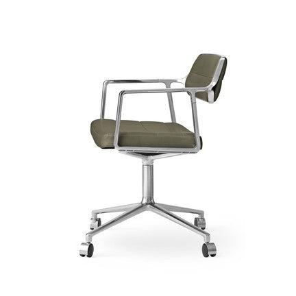 Vipp presenterer en ekstra polstret, høydejusterbar iterasjon av sin velkjente Swivel-stol. Beregnet for hjemmekontor og konferanserom. Swivel+-stolen tilbyr en større ryggstøtte og et svært komfortabelt sete. De slanke armlenene, som er gjentatt fra den originale Swivel-stolen, fortsetter rett inn i den diskrete, polstrede ryggstøtten, noe som gir stolen et nesten luftig uttrykk til tross for de solide komponentene.