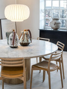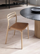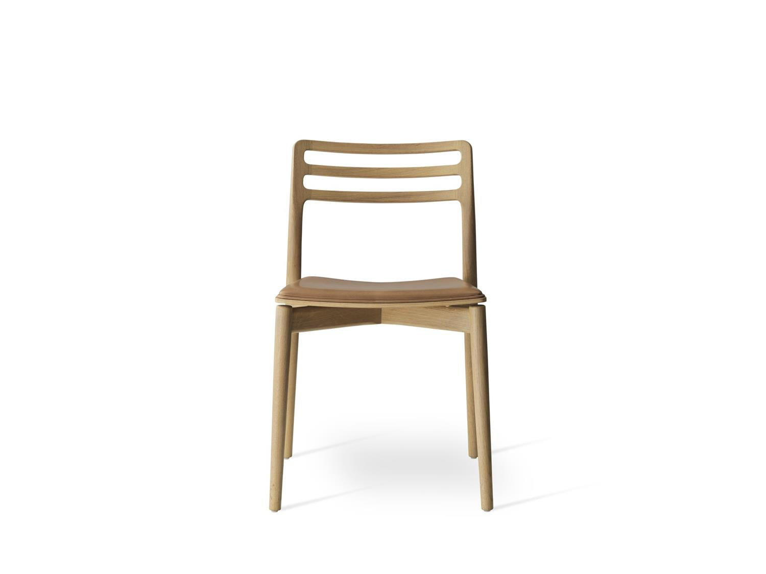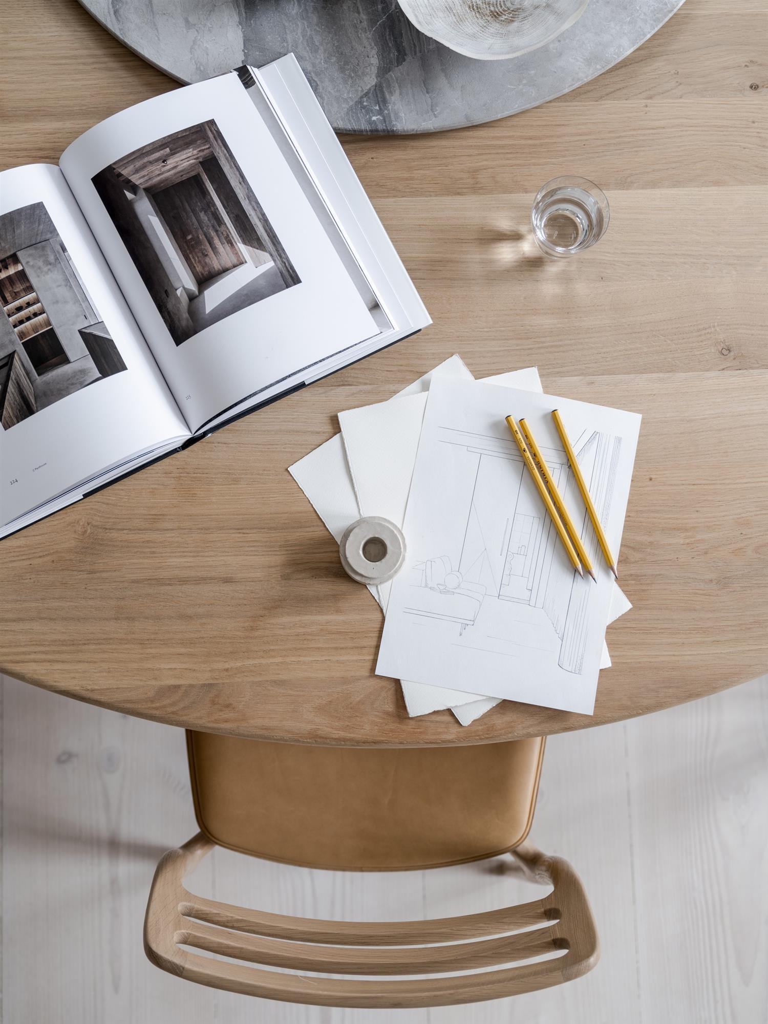 Vipp Cabin-stolen passer til spisestuen eller stuen. Denne stolen har avrundede komponenter i heltre eik og et svevende finersete med en påsatt pute i enten sand- eller svart skinn. Skinnet har unike visuelle egenskaper.