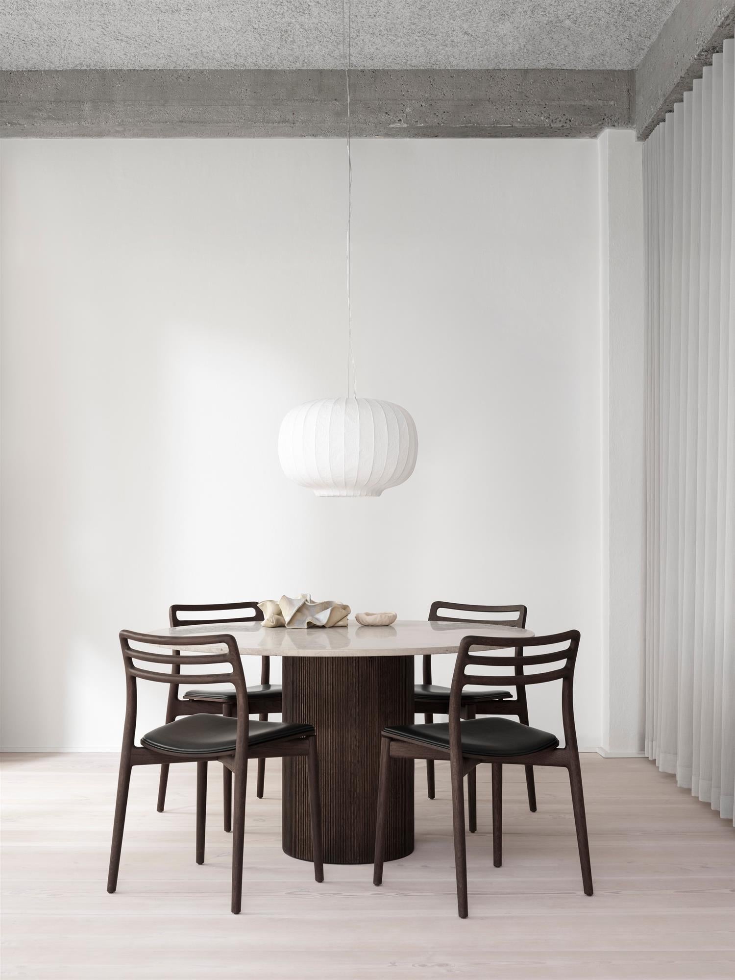 Vipp Cabin-stolen passer til spisestuen eller stuen. Denne stolen har avrundede komponenter i heltre eik og et svevende finersete med en påsatt pute i enten sand- eller svart skinn. Skinnet har unike visuelle egenskaper.